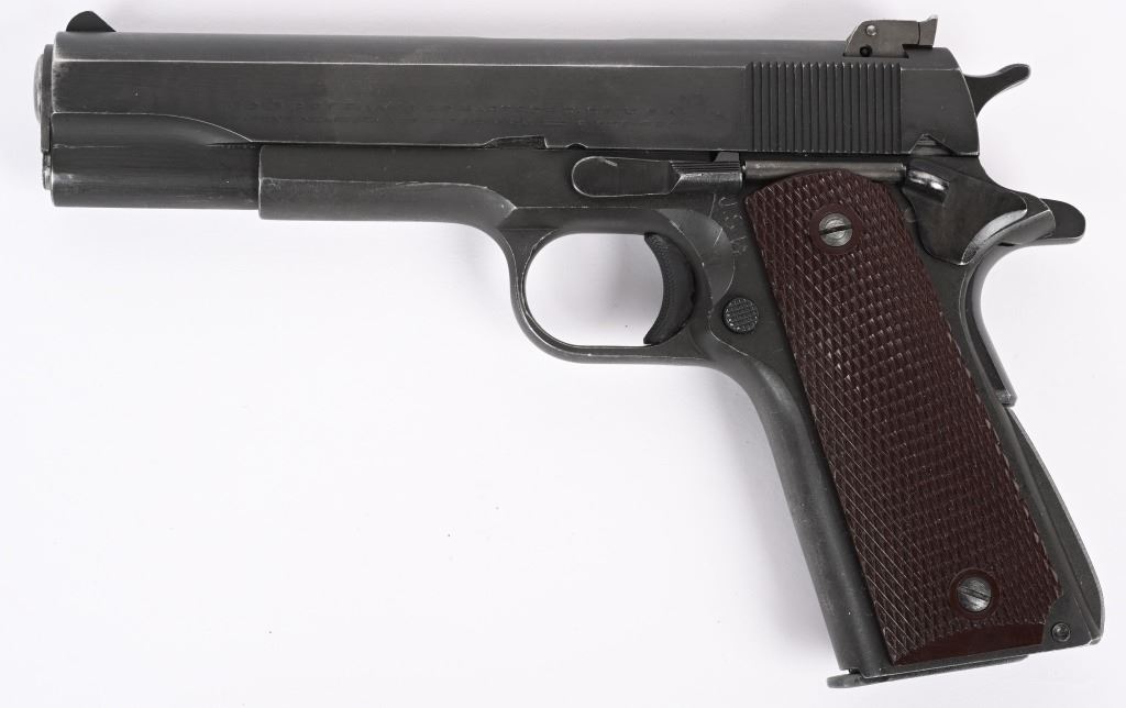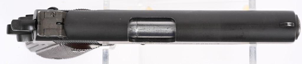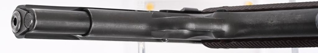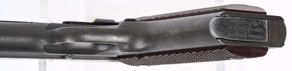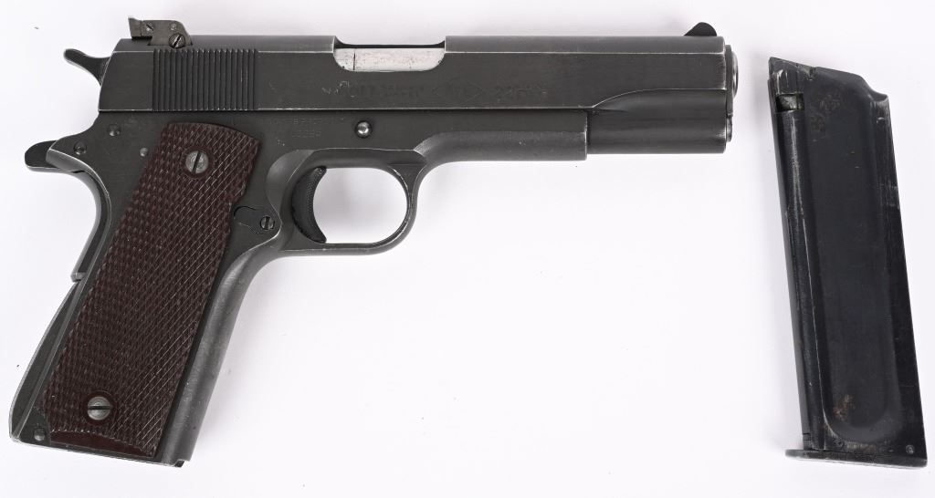 SERIAL NUMBER SM13695 BARREL 5" CALIBER .22 LONG RIFLE MANUFACTURED 1945. Adopted by the United States Gov,t for pistol training and marksmanship instruction during WW2. Parkerized finished with checkered brown plastic Keys pattern grips. Inspected by Capt, John S Breen (JSB) on right side of frame and this inspection is only found on the 1945 production. Ordnance wheel inspection of right side of frame at rear. Target front sight with adjustable rear sight. Pistol was developed with the floating chamber system to emulate the recoil of the significantly more powerful 45 acp cartridge. Magazine is phosphate finished with proper alloy base marked for the Service Model Ace. CONDITION. Very good with over 95% finish remaining. All marking are crisp and legible. Bore is excellent and bright. Action operates properly. C&R