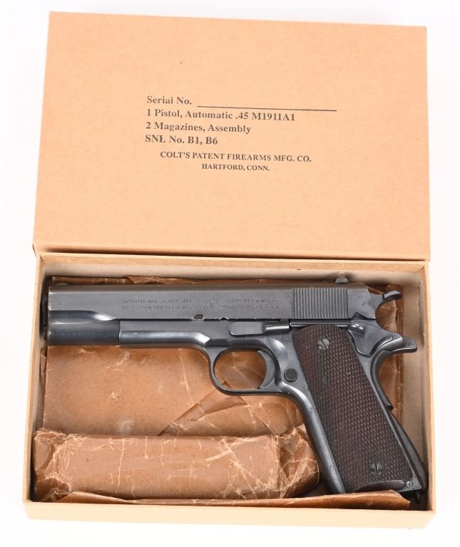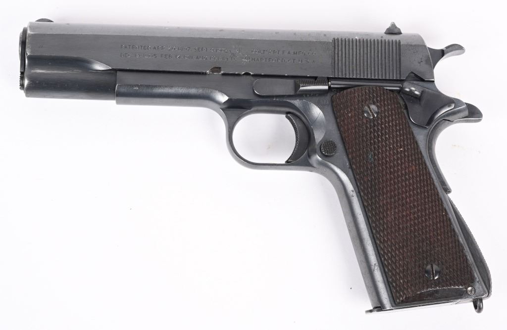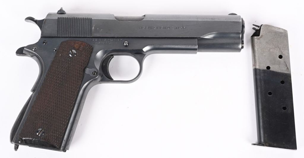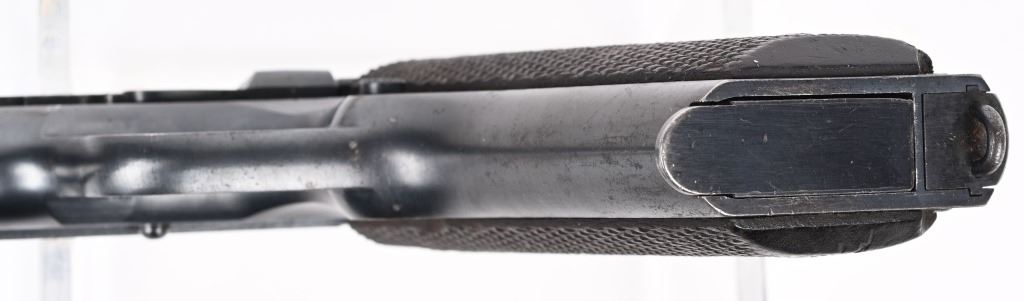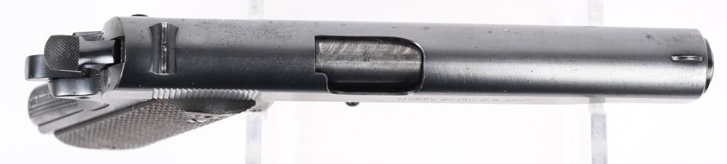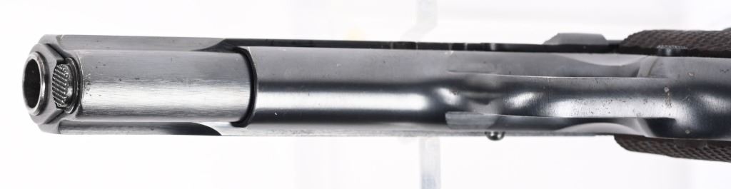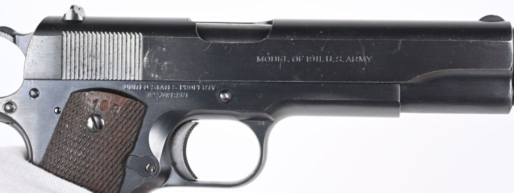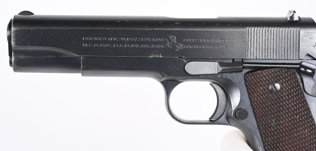 SERIAL NUMBER 708238 BARREL 5" CALIBER .45 ACP MANUFACTURED 1924. These rare transitional Colt 1911 / 1911-A1 pistol are finished in the period brushed blue finish with standard 1911 U.S. ARMY markings but have the short checkered 1911-A1 trigger Checkered arched mainspring housing , milled finger slots in frame ,long spur grip safety and non-diamond checkered walnut grips. Barrel has the intertwined (HP) proof. G&H sub inspectors marking on frame top and underside of slide. 2 tone blank base magazine and frame is inspected WTG in a circle ( Walter T Groton). These pistols do not have the (P) firing proof on slide or frame. Only 10,000 transitional models were produced and all in 1924. The survival rate for these examples are very low and are rarely found in fine or better condition. CONDITION, Excellent with the pistol retaining over 97% Colt brushed blue finish with typical edge wear. Bore is bright and sharp. Action operates properly. Grips are very good with the addition of (108) being added as a rack number on right grip at top. C&R