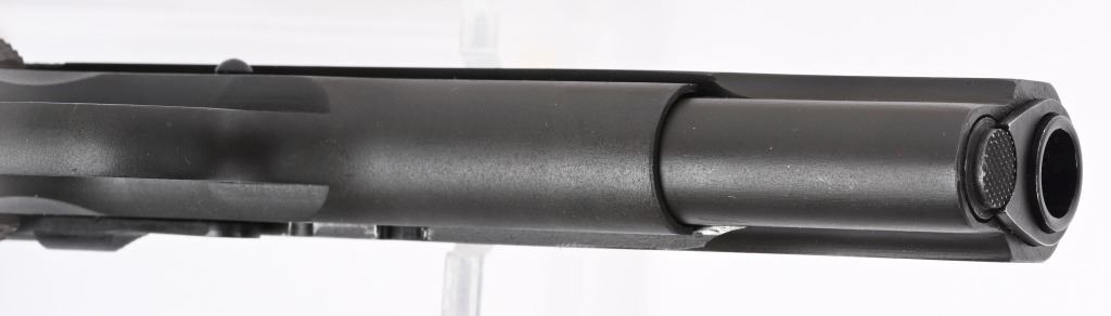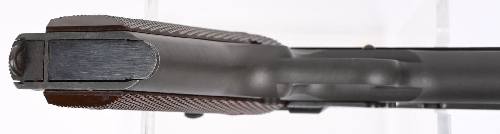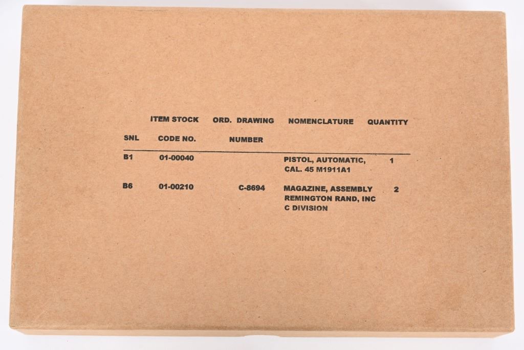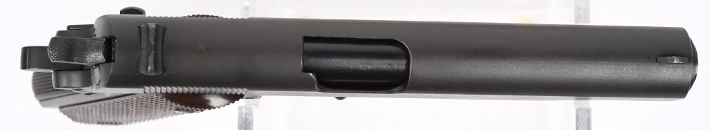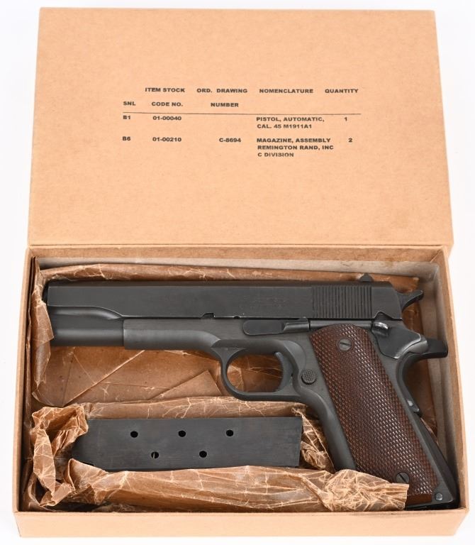 SERIAL NUMBER 1595825 BARREL 5" CALIBER 45 ACP MANUFACTURED 1943. Parkerized finish with checkered brown plastic Keys pattern grips. Blue barrel marked "H.S." (High Standard) Inspected FJA on left side of frame with "P" proof below magazine release. Small 2 line Remington Rand markings on left side of slide. Grooved slide release with checkered blued safety. Narrow checkered hammer, Checkered stamped short 11-A1 trigger, Grooved arched mainspring housing and "R" marked (RISDON) magazine. condition, exceptionally fine with pistol retaining 98% finish with very slight edge wear. Bore is excellent and barrel retains most all blue on skirt. Action operates properly. Grips are excellent. Pistol is housed in a contemporary kraft box with pristine "S" (Scovill) marked spare magazine. C&R