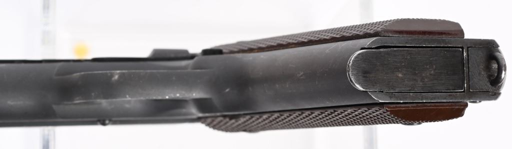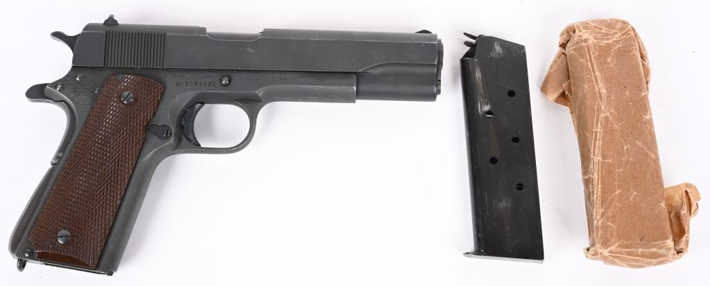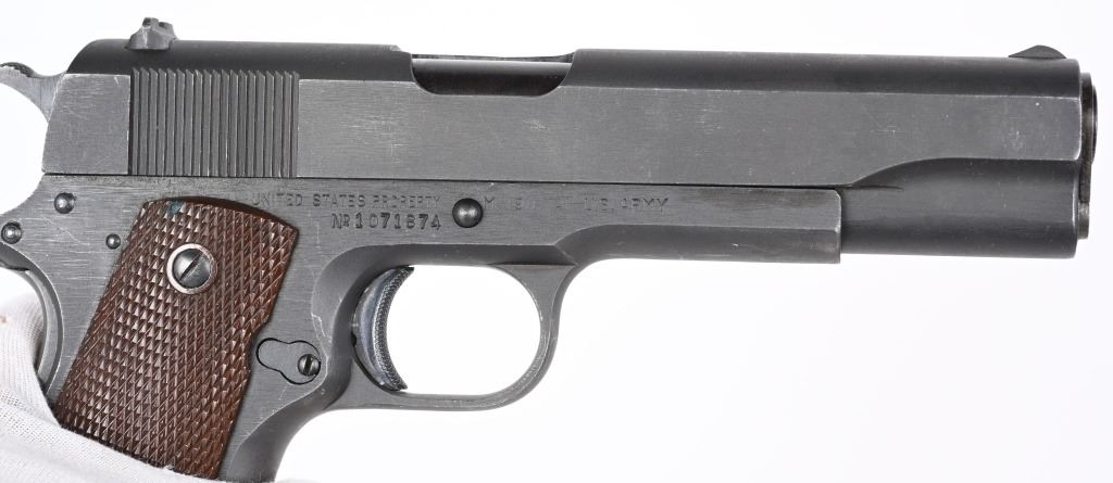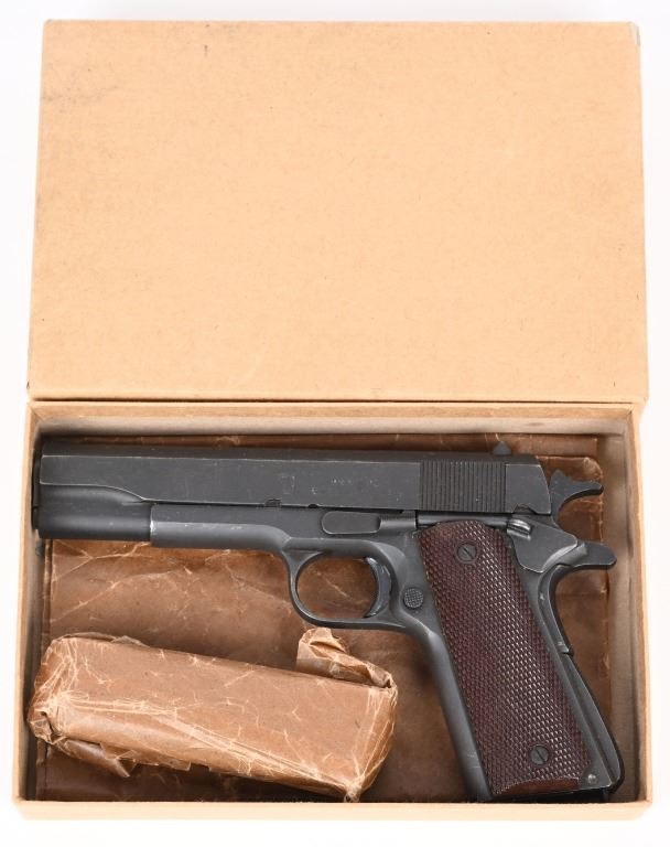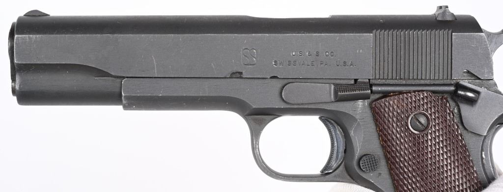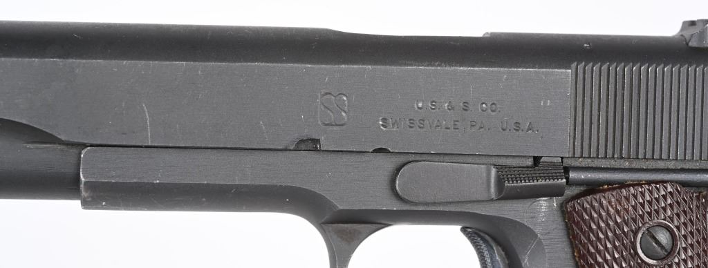 SERIAL NUMBER 1071874 BARREL 5" CALIBER .45 ACP MANUFACTURED 1943. Produced in Swissdale Pa, with a dull grey-black Du-Lite blue finish. Checkered brown plastic Keys pattern grips. "H.S." (High Standard) barrel. Long spur grip safety and checkered narrow hammer. Checkered arched mainspring housing with checkered safety and grooved slide stop. Inspected on left side "R.C. D." in circle by R.C. Downie. "P" proofed below magazine release. Slide has standard intertwined US&S monogram with 2 line slide address. Right side of frame has serial number and marked "UNITED STATES PROPERTY" No Ordnance wheel inspection was done on US&S 1911-A1 pistols. Pistol is housed in a contemporary kraft pattern box with spare "S" marked blue finished magazine. CONDITION. Very fine with over 97% Du-Lite blue finish remaining with losses at edges and minor scratch from disassembly. Bore is excellent and bright. Grips are very fine. Action operates properly. Magazine is very good. Box is fine. C&R