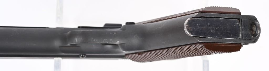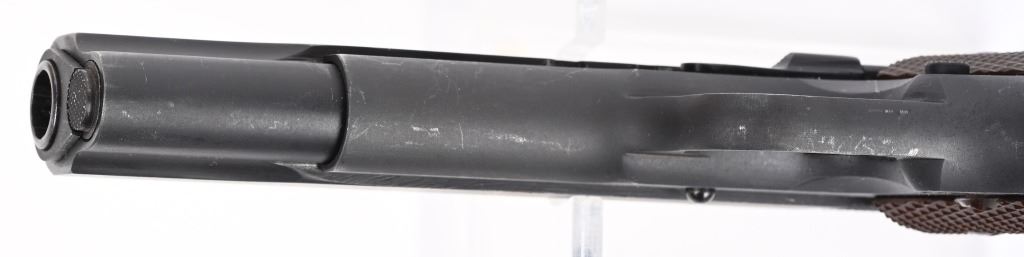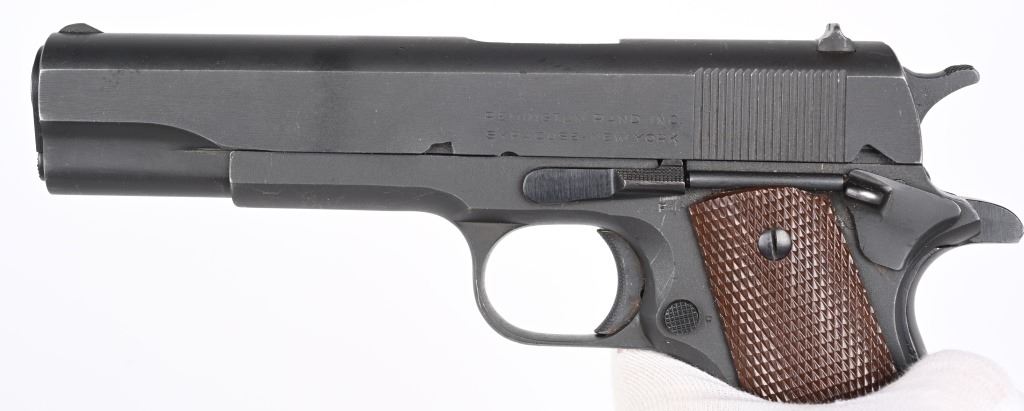 SERIAL NUMBER 930728 BARREL 5" CALIBER .45 ACP MANUFACTURED 1943. Fine original and correct Remington Rand 1911-A1 pistol with ORIGINAL 2 piece Remington shipping box and spare magazine. Pistol is parkerized finished with Brown checkered plastic Keys grips with no reinforcing rings around screws and have the 5 pointed stare internal with the #4 lot number. Frame is FJA inspected on left side with "P" proof below magazine release. Slide has Large 2 line Remington Rand marking on left side. and is "P" proofed on top forward of rear sight.. Barrel is blue finished with the correct "COLT 45 AUTO" marking on lower left side of chamber. Hammer is narrow checkered pattern with trigger being stamped checkered 11-A1 type. Long spur grip safety and checkered , arched mainspring housing. Magazine is marked "G" on lip with seam down spine made by General Shaver. Spare magazine is same pattern and make. CONDITION. Excellent with pistol retaining 99% parkerized finish with barrel having very slight blue loss from operation and has a brilliant bright bore. Action operates properly. Box is very good with excellent markings and one small tape repaired corner internally. Spare magazine is as new. C&R