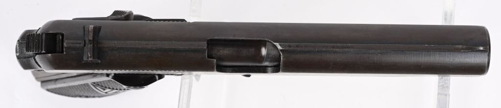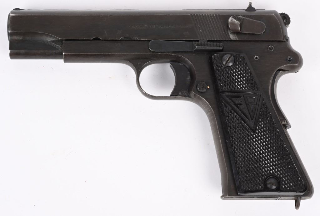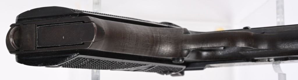 SERIAL NUMBER D3199 BARREL 4 5/8" CALIBER 9MM PARA MANUFACTURED WW2. Produced in Poland at Radom under German occupation. Blue finished with checkered black plastic grips. Dual lever model with 3 rivets at rear of frame. Eagle 77 & Eagle WaA 623 inspection on slide frame and barrel. Produced in the fist alphabet serial number series. CONDITION, Very good with pistol retaining over 70% blue finish with grips straps and edges turning plum. Bore is very fine. All numbers are matching. C&R