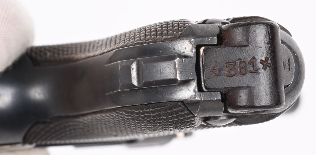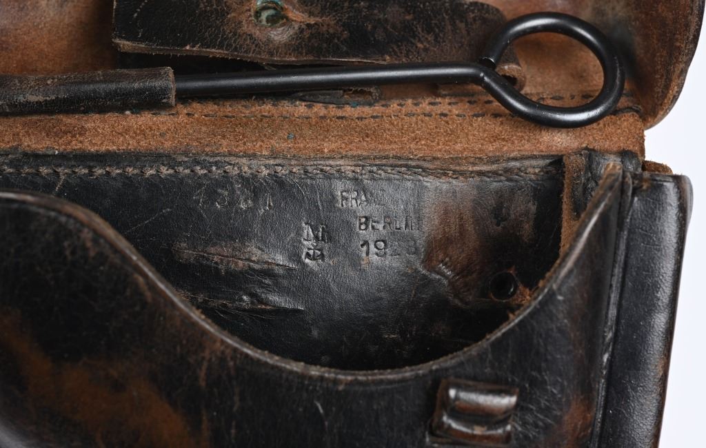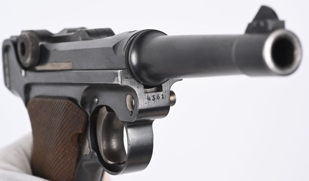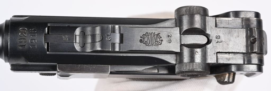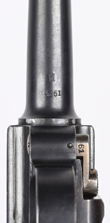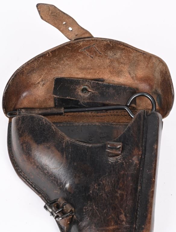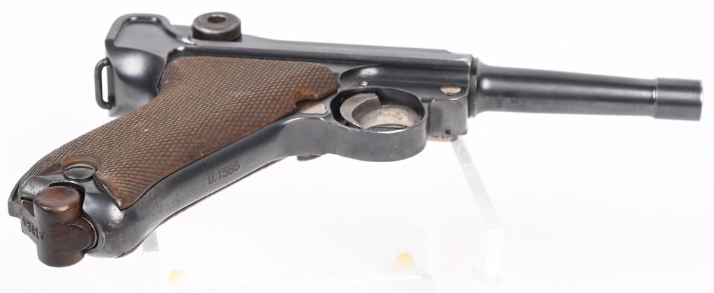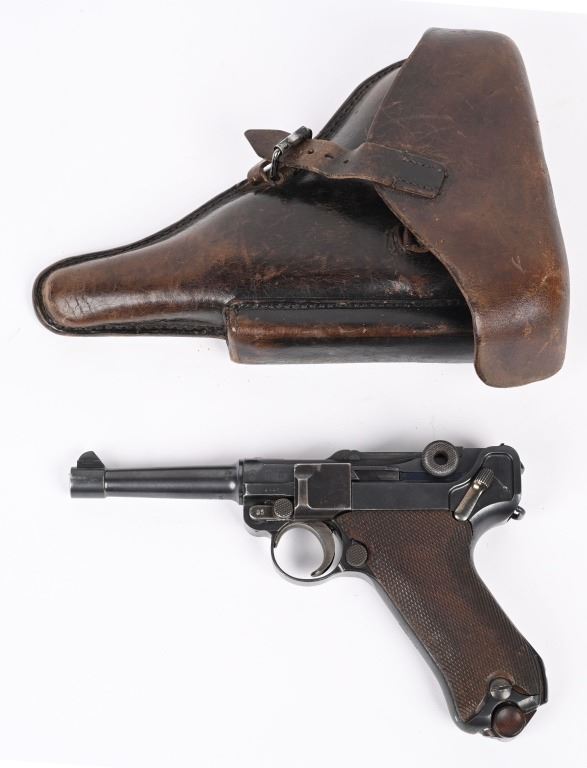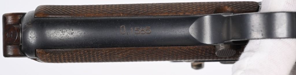 SERIAL NUMBER 4361 BARREL 4" CALIBER 9MM PARA MANUFACTURED 1916. Marked in script on toggle "DWM' with chamber double dated 1916 / 1920. Imperial Navy proofs on left side of chamber , underside of barrel and base of magazine. Unit marked on front strap "O-1585" Pistol is housed in a 1928 dated leather flap holster w/ cleaning rod with Imperial "M" markings and is numbered to the pistol. CONDITION, Very good with excellent bright bore and pistol retains over 95% blue finish with evidence of the post WW1 rebuild. Action operates properly. Grips are very fine. Pistol is found to be all matching with exception of side plate that appears to be a period commercial replacement. Holster is good with leather being supple and one belt loop being repaired. NON-IMPORT C&R