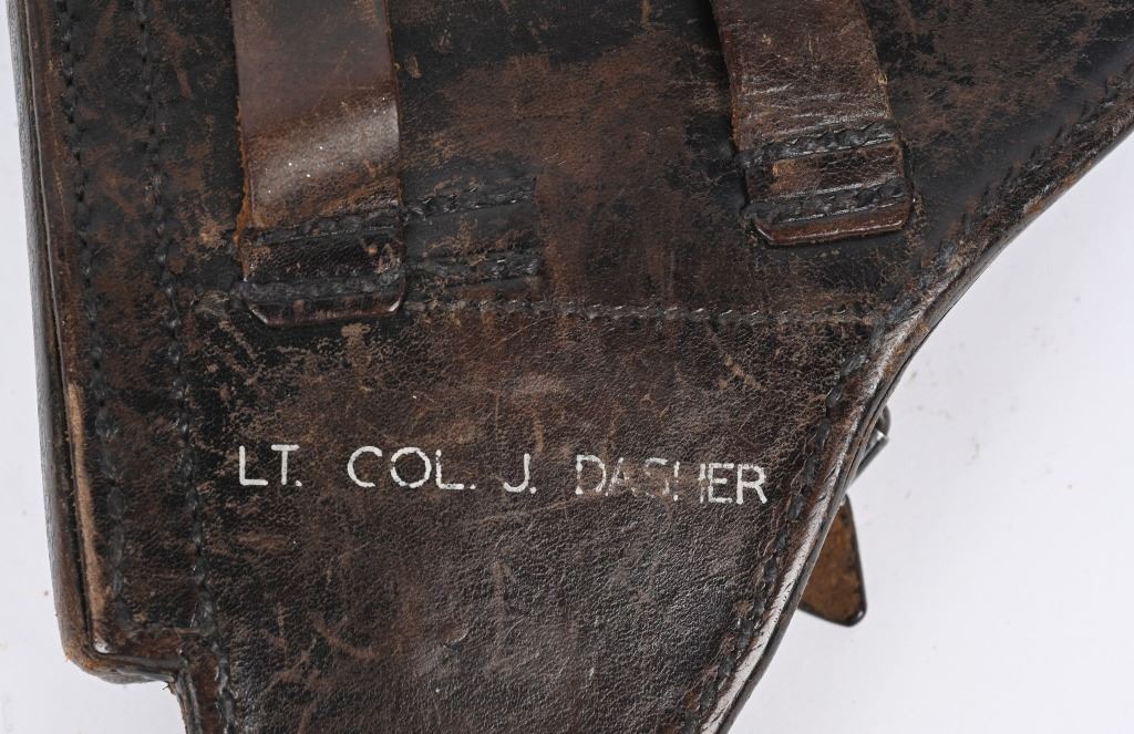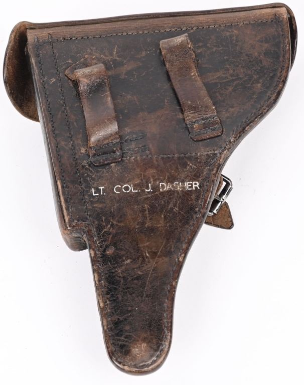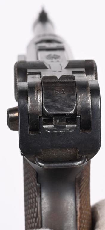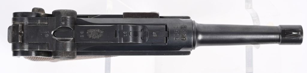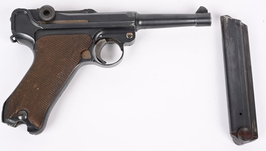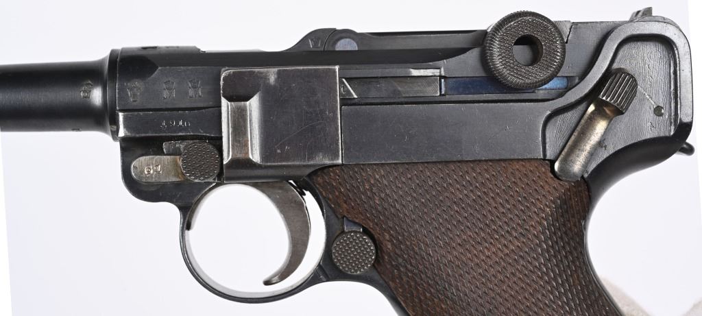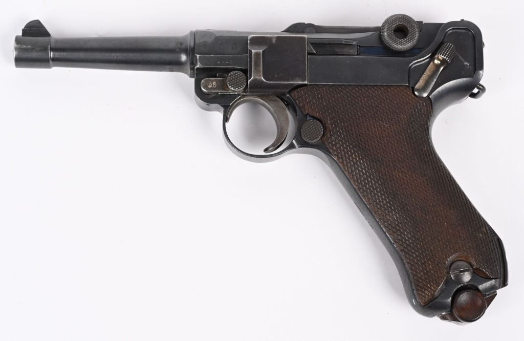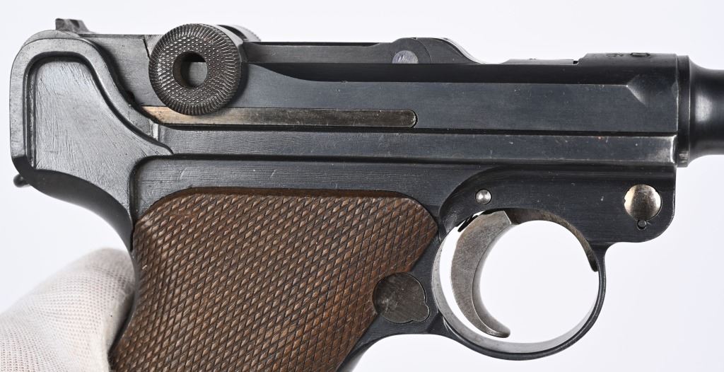 SERIAL NUMBER 4361 BARREL 4" CALIBER 9MM PARA MANUFACTURED 1916. Marked in script on toggle "DWM' with chamber double dated 1916 / 1920. Imperial Navy proofs on left side of chamber , underside of barrel and base of magazine. Unit marked on front strap "O-1585" Pistol is housed in a 1928 dated leather flap holster w/ cleaning rod with Imperial "M" markings and is numbered to the pistol. CONDITION, Very good with excellent bright bore and pistol retains over 95% blue finish with evidence of the post WW1 rebuild. Action operates properly. Grips are very fine. Pistol is found to be all matching with exception of side plate that appears to be a period commercial replacement. Holster is good with leather being supple and one belt loop being repaired. NON-IMPORT C&R