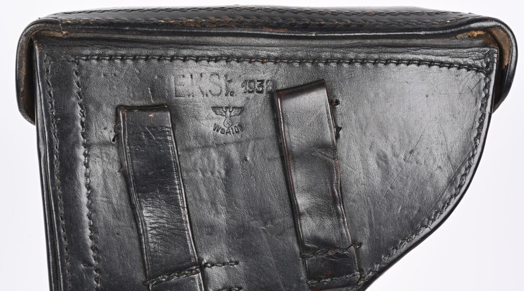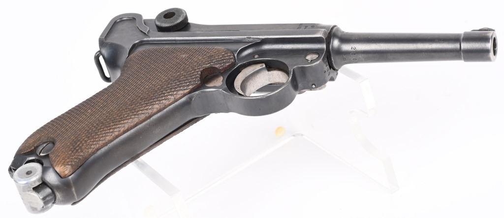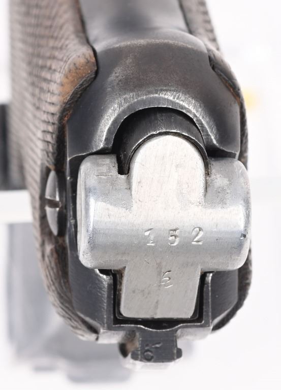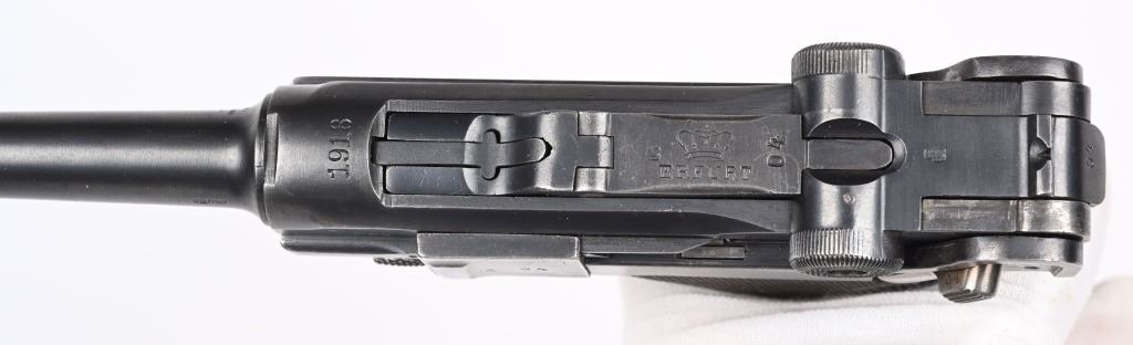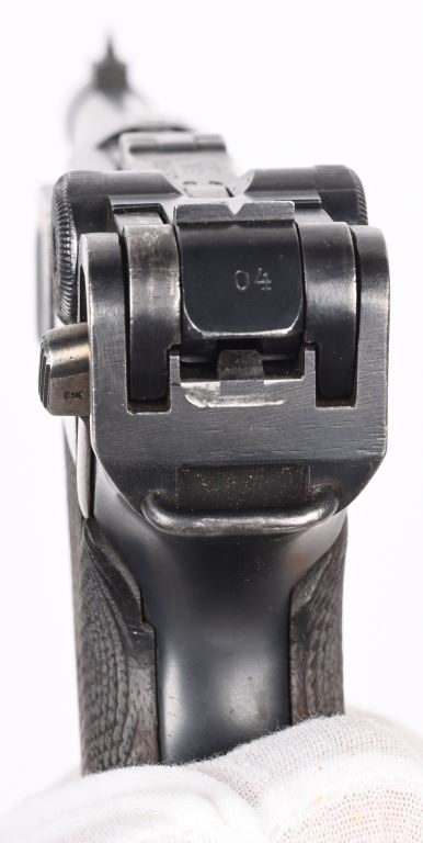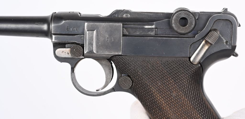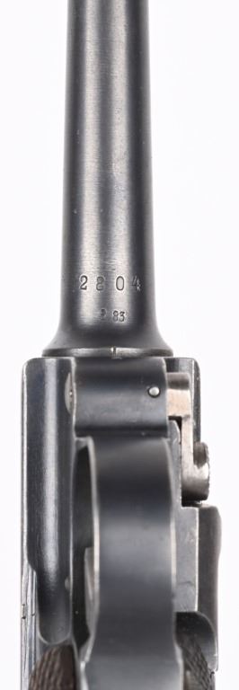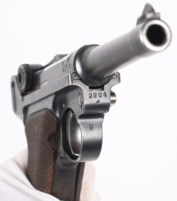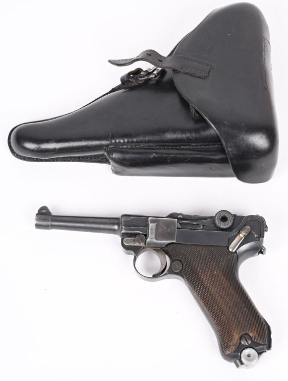 SERIAL NUMBER 2804s BARREL 4" CALIBER 9MM PARA MANUFACTURED 1918. Rust blue finished with checkered walnut grips. Toggle marked "ERFURT" Chamber dated 1918. Pistol is all matching numbers with exception of alloy based WW2 magazine. Pistol is housed in 1938 dated WaA 101 black leather clamshell holster. CONDITION. Good with worn but bright bore. Pistol retains over 90% rust blue finish with 20% straw finish remaining on safety, trigger and magazine release. Grips are full sized but worn at edges. Action operates properly. Holster is good with supple leather and solid stitching. C&R