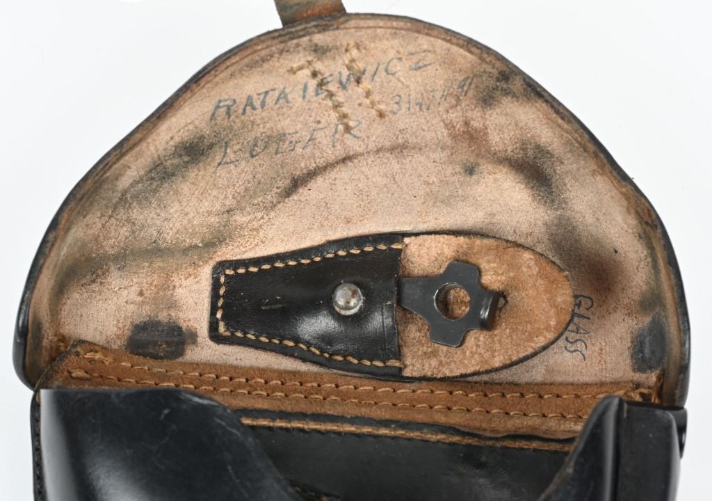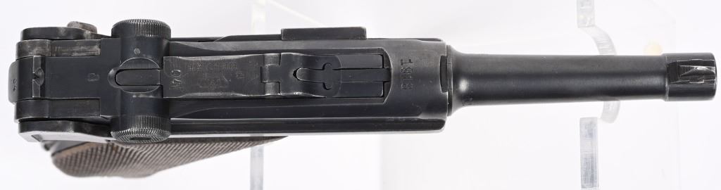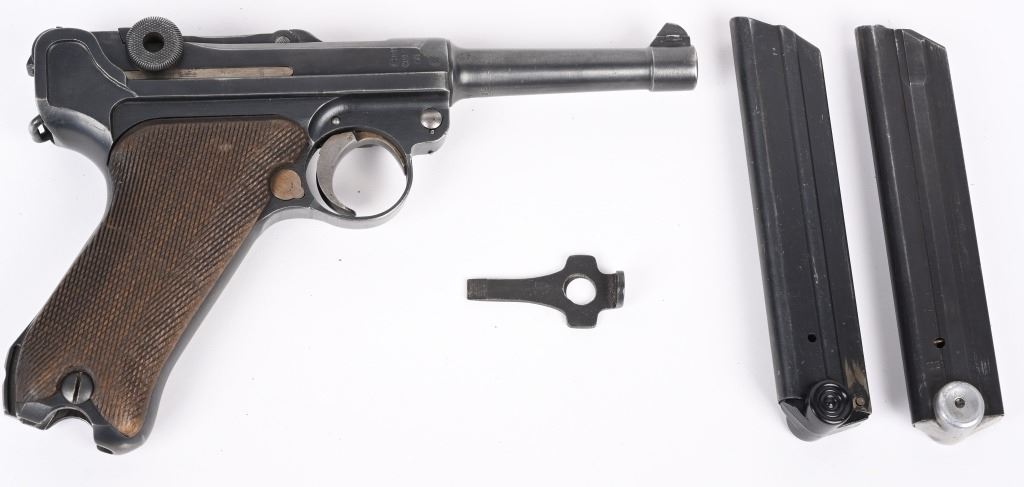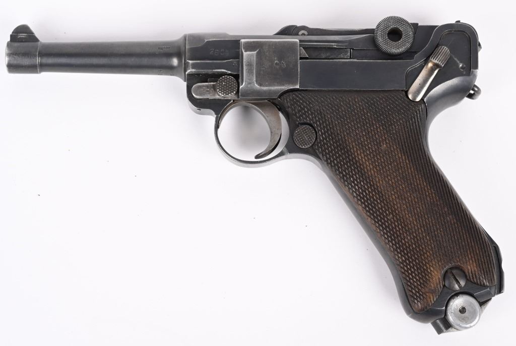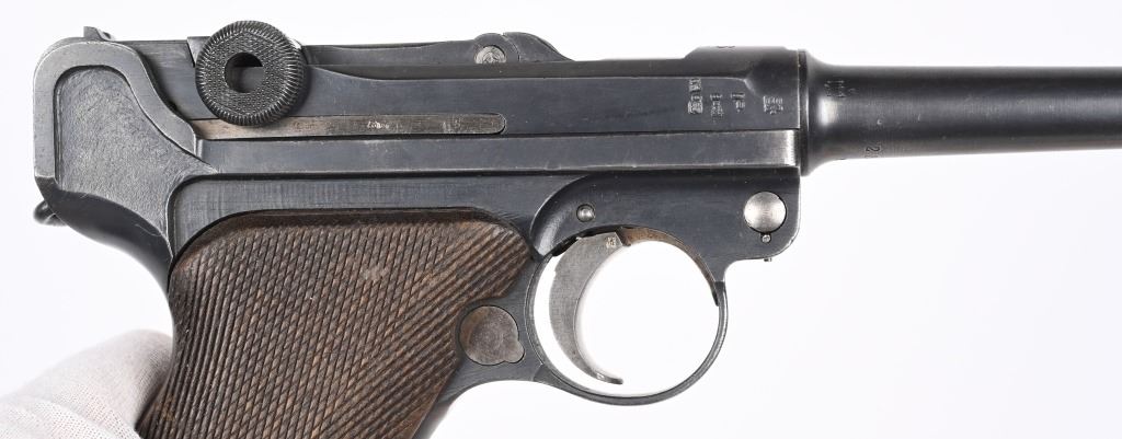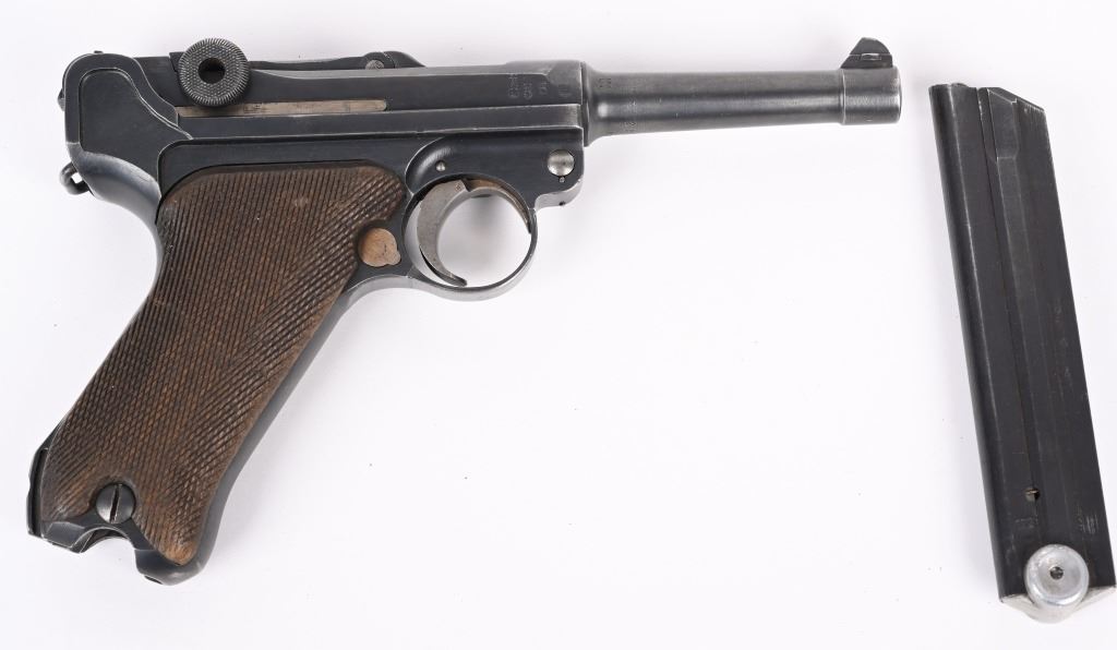 SERIAL NUMBER 2804s BARREL 4" CALIBER 9MM PARA MANUFACTURED 1918. Rust blue finished with checkered walnut grips. Toggle marked "ERFURT" Chamber dated 1918. Pistol is all matching numbers with exception of alloy based WW2 magazine. Pistol is housed in 1938 dated WaA 101 black leather clamshell holster. CONDITION. Good with worn but bright bore. Pistol retains over 90% rust blue finish with 20% straw finish remaining on safety, trigger and magazine release. Grips are full sized but worn at edges. Action operates properly. Holster is good with supple leather and solid stitching. C&R