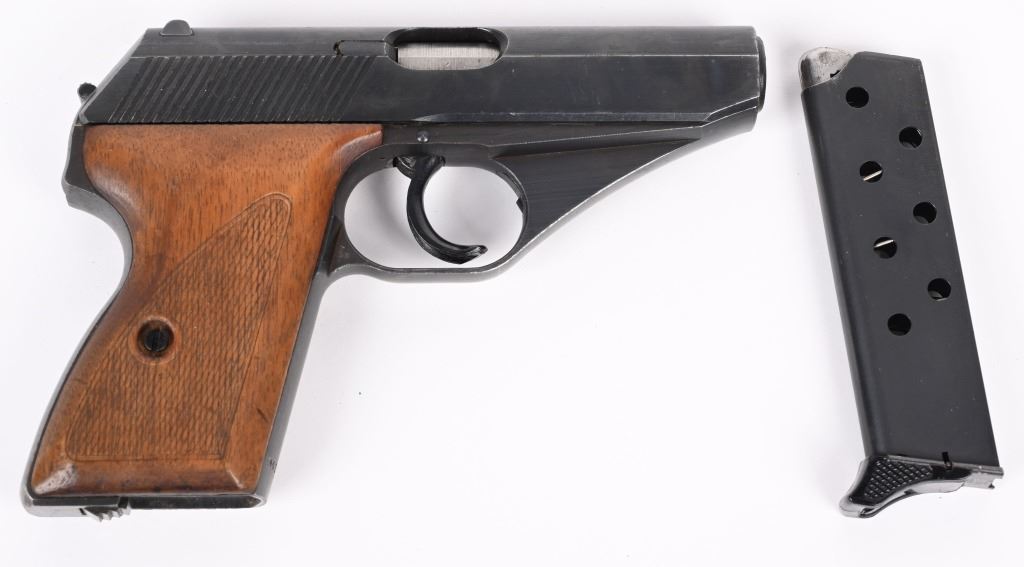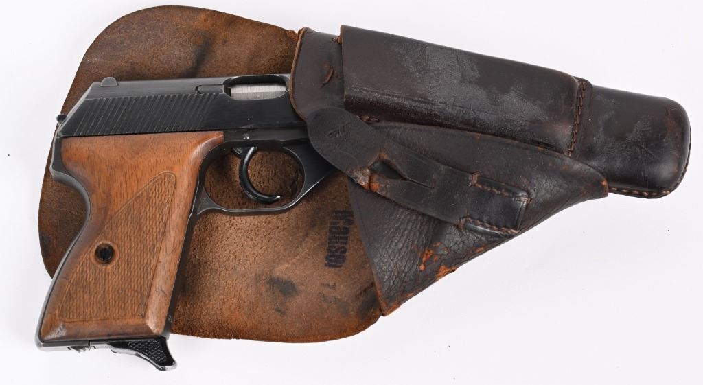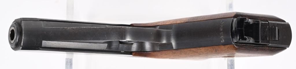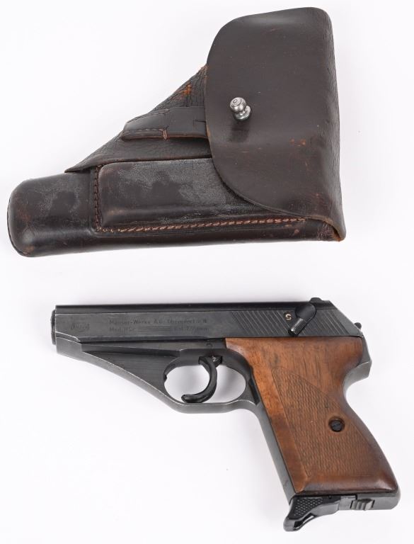 SERIAL NUMBER 941640 BARREL 3 3/8" CALIBER 7.65 / 32 ACP MANUFACTURED LATE WW2. Very late production with blue finished frame and slide with checkered wood grips. Smooth sight channel in slide and plastic finger rest magazine Eagle "N" proofs on trigger guard and German military inspections Eagle WaA135 on right trigger guard. Frame, slide and barrel are matching numbers. Grips not numbered. Pistol is housed in leather flap holster marked "MAUSER 7.65" on internal of flap . Maker mark is not legible . CONDITION. Pistol is very fine with excellent bore and retains over 97% blue finish and action operates properly. Grips screws are replacements. Holster is supple with slight scuffing and tear on closure strap. C&R