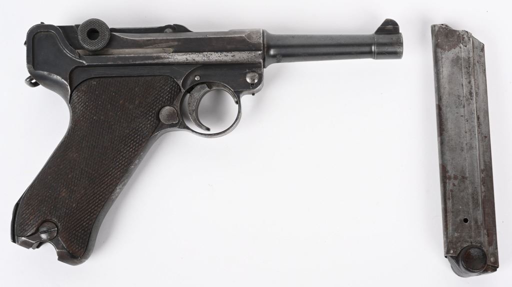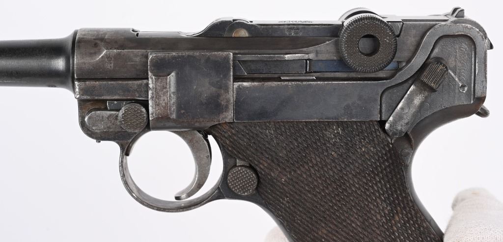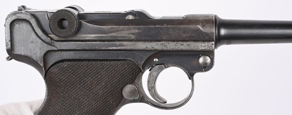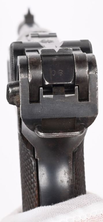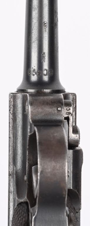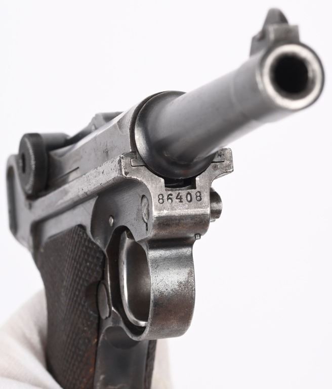 SERIAL NUMBER 86408 BARREL 3 3/4" CALIBER 7.63 / 30 LUGER MANUFACTURED 1920'S. Rust blue finish with commercial Crown "N" proofs. Checkered walnut grips. Straw finished controls and grip fitted with stock lug. Matching numbers with blank walnut based white metal magazine. CONDITION. Good with exterior having turned a mottled brown mixed with blue. Control levers have lost all traces of straw finish. Grips are full sized and slightly worn with minor chip in top of right grip at top rear. Bore is worn with frosted grooves. Action operates properly. C&R