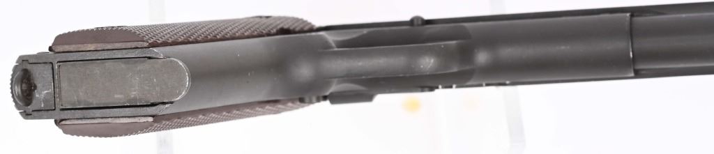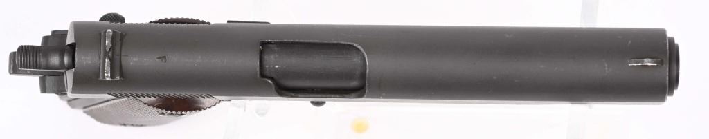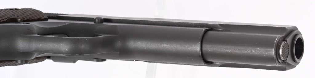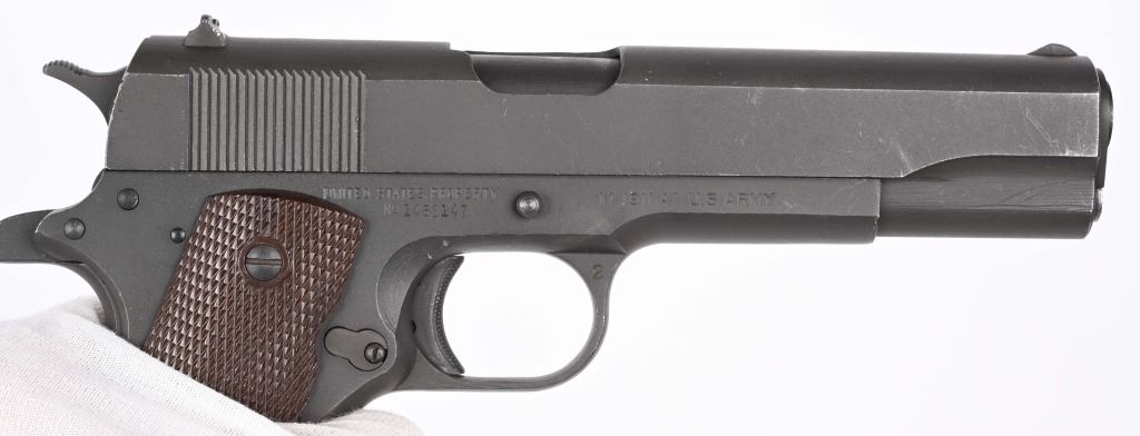 SERIAL NUMBER 1468147 BARREL 5" CALIBER .45 ACP MANUFACTURED 1943. Produced with parkerized finish and brown checkered Keys pattern plastic grips. Barrel marked "F" for Flannery . short checkered 11-A1 trigger with checkered slide stop and safety. Narrow grooved hammer , long spur 11-A1 grip safety and grooved arched mainspring housing. Inspected "FJA" on left side of frame with "P" proof below magazine release and on top of slide forward of rear sight. Magazine is WW2 pattern w/o any markings. CONDITION. Very good as refinished with crisp markings and fine bright bore. Left grip is early Keys pattern with wide reinforcement circle around screws while right grip has narrow reinforcement s and no strengthening ribs inside. Action operates properly. C&R