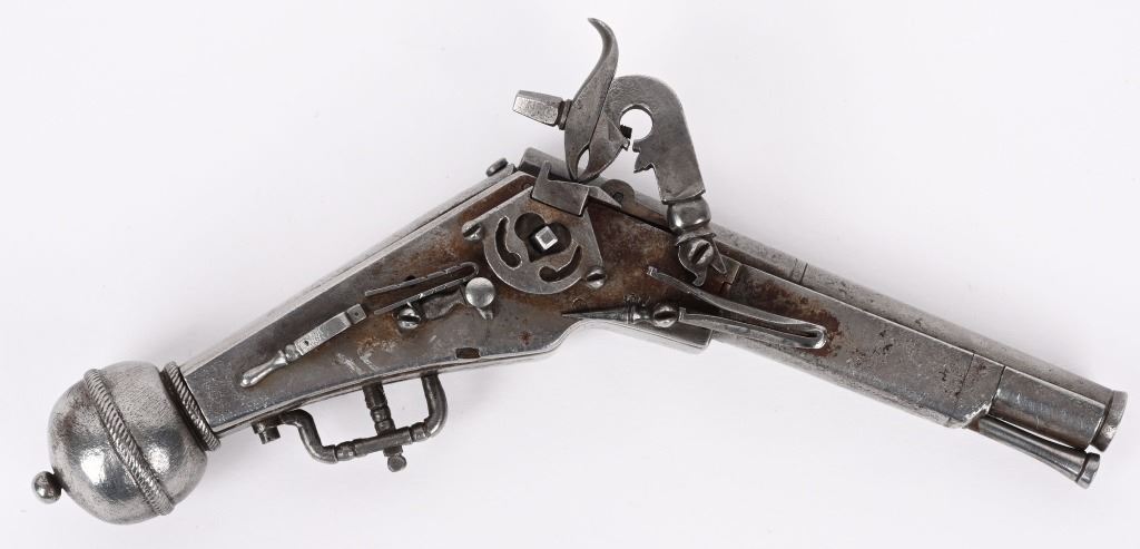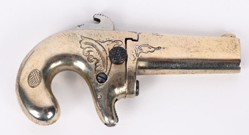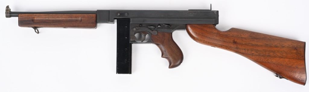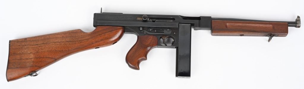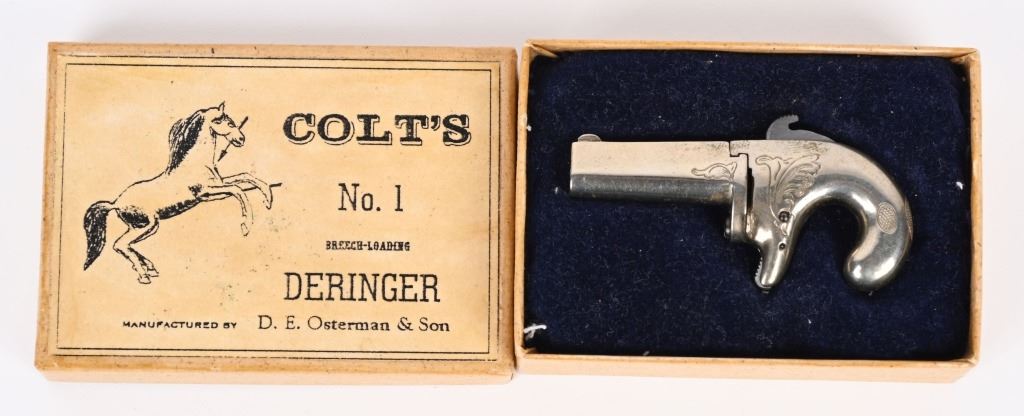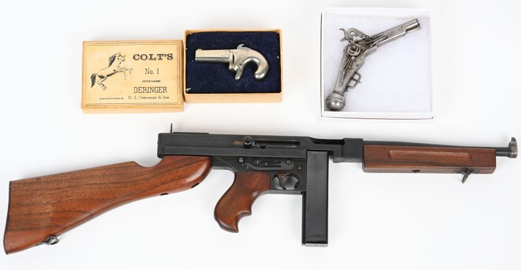 Boxed Colt No1 Derringer by Osterman , Made to 1/2 scale with rifled bore nickel finished over brass. Engraved and marked with the traditional 2 line Colt address on top of barrel. Action operates properly. As new condition, M1A1 Thompson Sub machine gun on the 1/3 scale with parkerized finish, walnut stocks and operable action. Magazine is solid. Auto Ordnance markings on right side with proper markings on left side. Miniature all metal wheel lock pistol made on the 1/3 scale with operating action. , smooth bore and belt hook. Appears quite old and extremely well made. NON-FIREARM