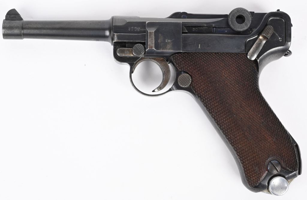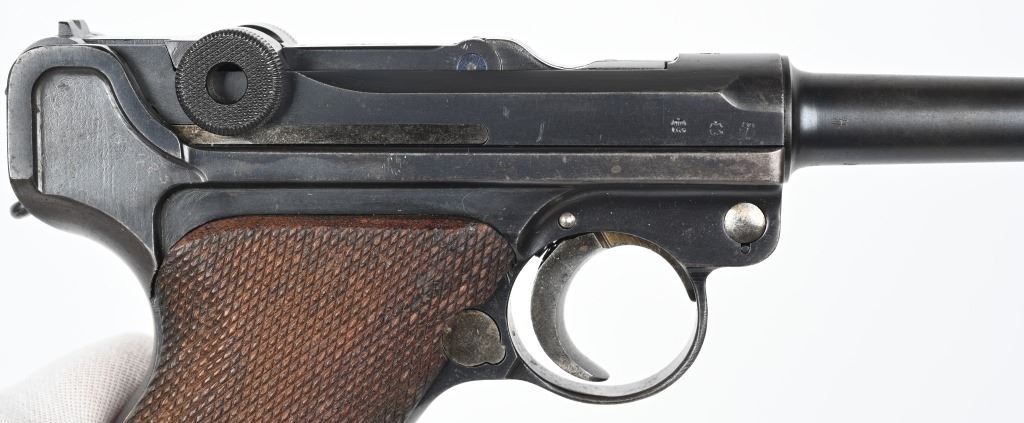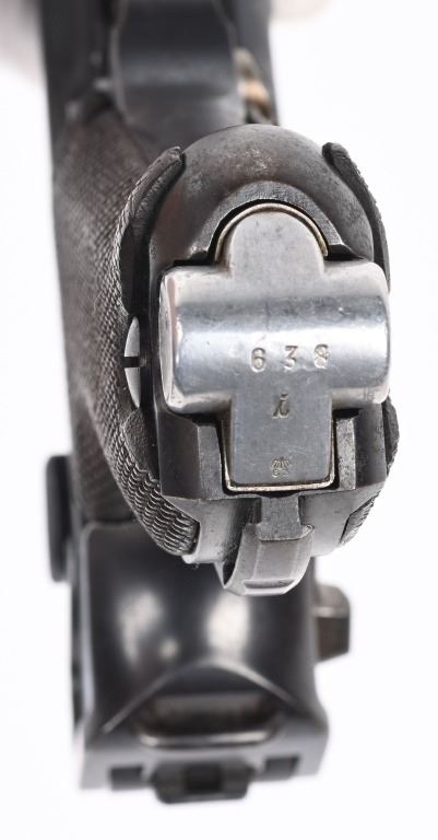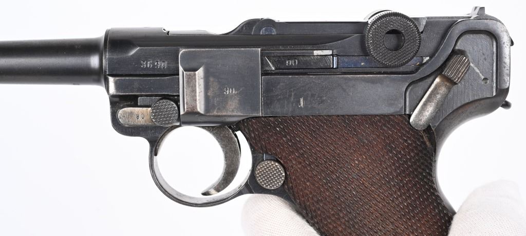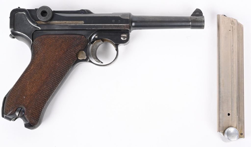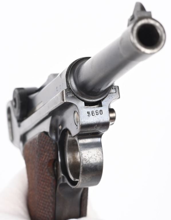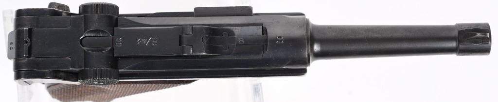 SERIAL NUMBER 3690t BARREL 4" CALIBER 9MM PARA MANUFACTURED 1935. Produced under the German code S/42 for Mauser and the chamber dated "G" for 1935.Rust blue finished with straw finished trigger magazine release and take down lever. Eagle 63 inspection on barrel and frames. Checkered walnut grips Nickel finished magazine with alloy base and Eagle 63 inspection. CONDITION, Very good with pistol retaining over 95% blue finish with slight edge wear and having a very good bright bore. Action operates properly. Grips are good with left grip having a very small chip at top rear. All numbers matching with exception of magazine. C&R
