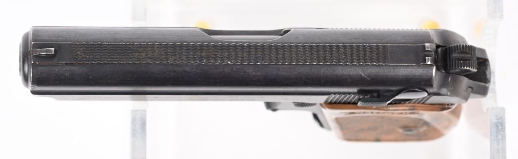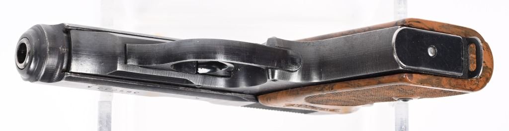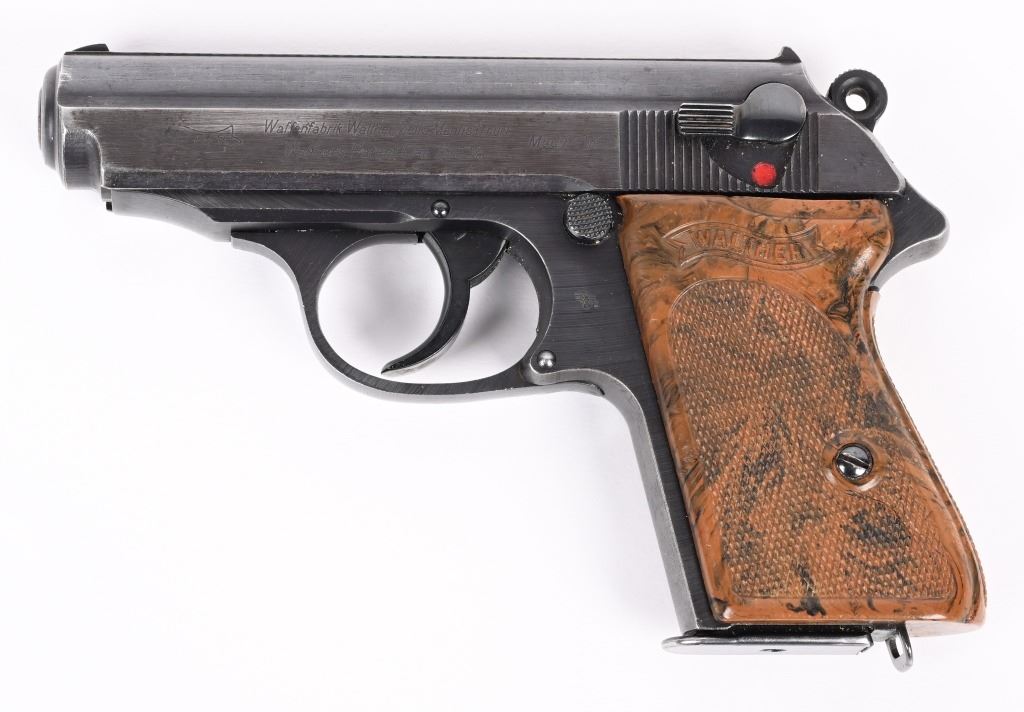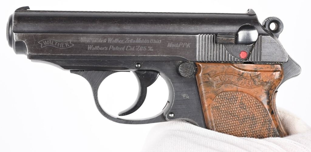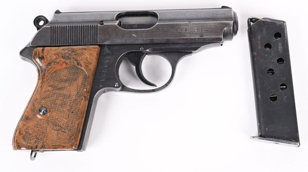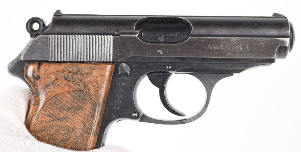 SERIAL NUMBER 364033K BARREL 3 1/4" CALIBER 7.65 / .32 ACP MANUFACTURED 1942. Produced at Walther under German Gov't control and inspected with Eagle "N" and Eagle C with secondary war time polish and blue and checkered mottled brown plastic Walther grips with Walther in ribbon monogram. Serial numbered on both frame and slide. Fitted with Walther marked flat base magazine. CONDITION, Very good with crisp markings and legends. Pistol retains over 90% blue finish with holster wear on slide. Bore is very fine and bright. Action operates properly. Grips are very good with very slight warpage and the typical small stress cracks at screw. A scarce Eagle C Walther. C&R