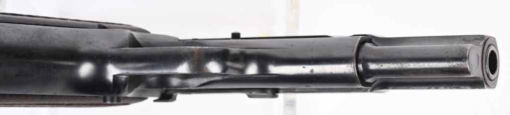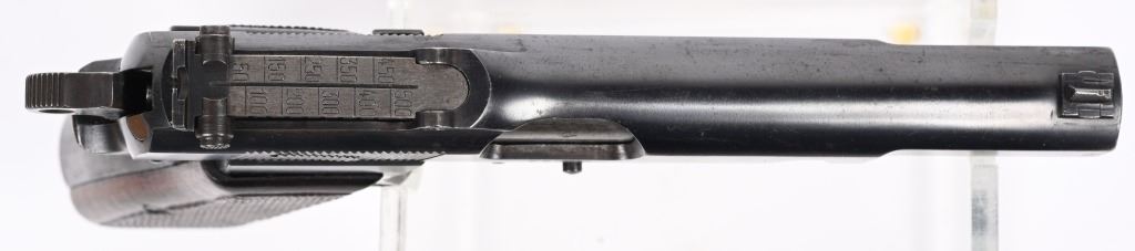 SERIAL NUMBER 67347 BARREL 4 1/4" CALIBER 9MM PARA, MANUFACTURED WW2. Manufactured at Fabrique Nationale in Herstal Belgium under German occupation. Blue finished with varnished checkered walnut grips and Tangent rear sight. Eagle WaA103 German inspections on slide , frame and barrel, Numbers are matching on slide, frame and barrel and pistol retains proper Belgian magazine with alloy follower. CONDITION, Very good with some very minor finish spotting. Pistol retains over 95% blue finish with excellent bright bore. Grips are very fine with little wear. Action operates properly. C&R