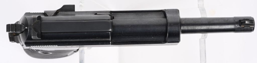 SERIAL NUMBER 2350w BARREL 4 7/8" CALIBER 9MM PARA MANUFACTURED 1944. Produced at Spreewerke Under German military occupation using the code CYQ in November 1944. Blue finish with dark brown bakalite grips. German Eagle 88 inspections on frame slide barrel and locking block. Magazine is marked jvd WaA106 inspectors marking. All numbers are matching and NON-IMPORT. CONDITION, Very fine with fine bright bore and properly operating action. Grips are very fine with no chips or cracks. Pistol retains over 90% blue finish with slight high point edge wear and front strap being worn. C&R