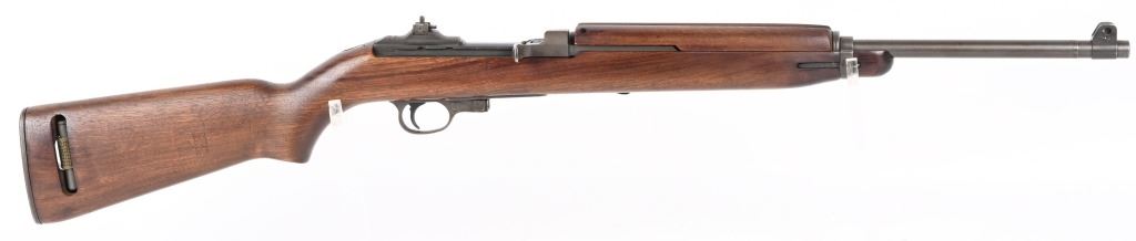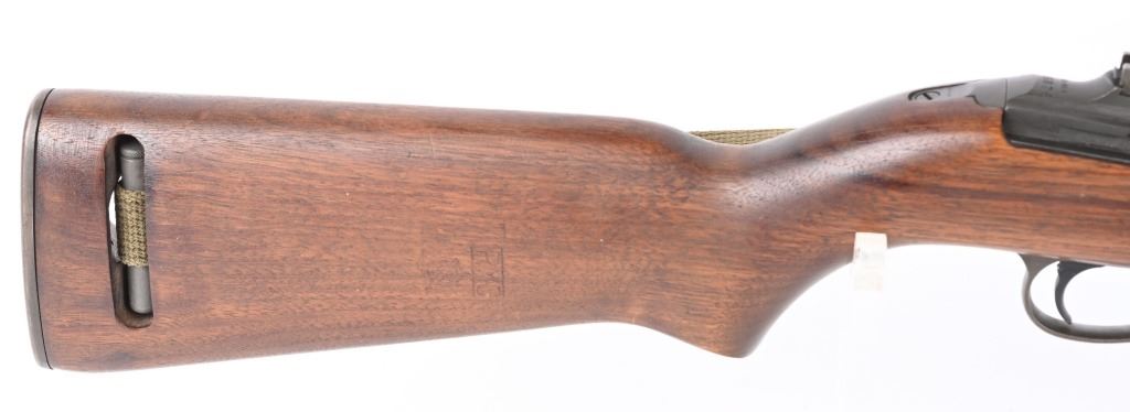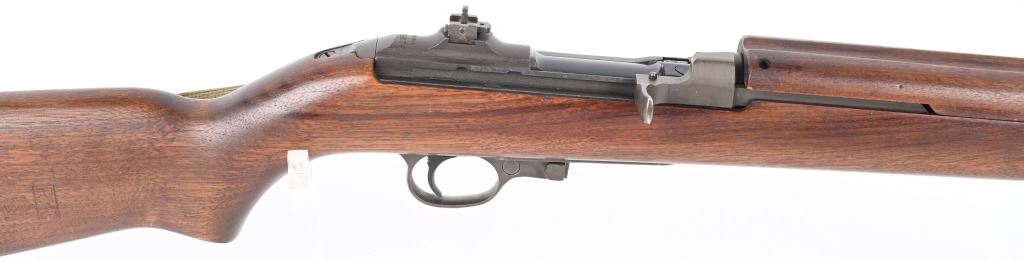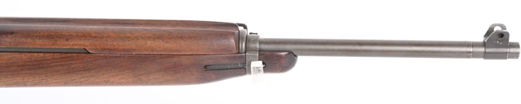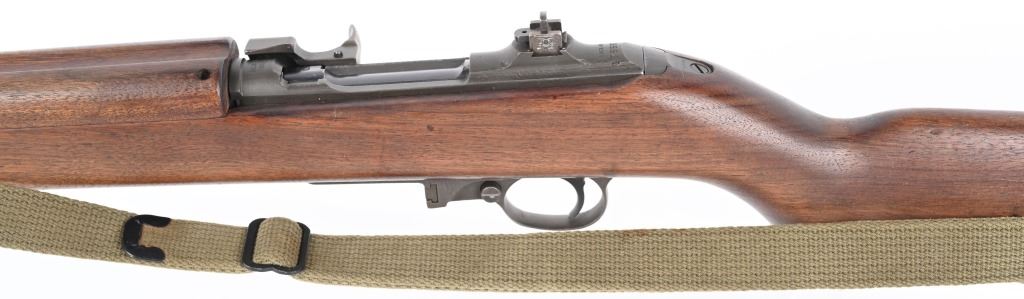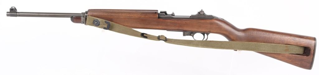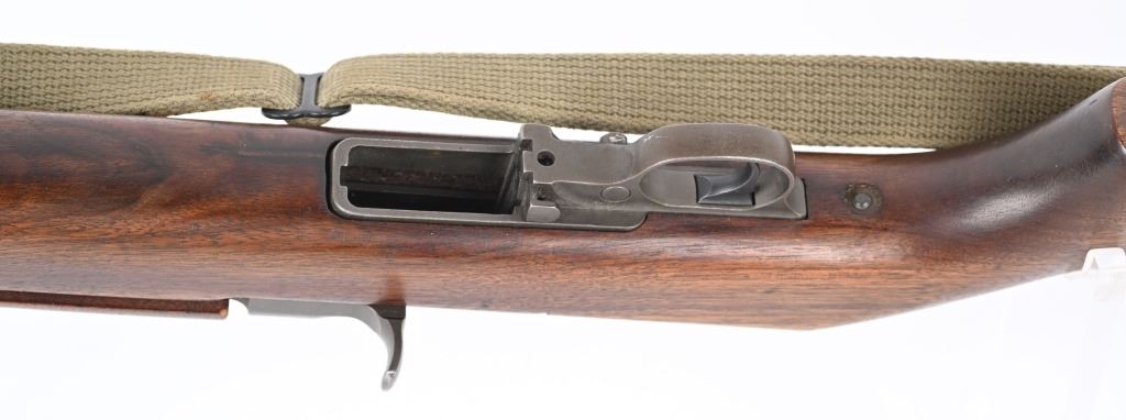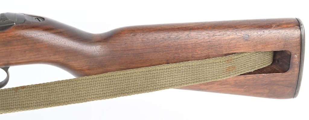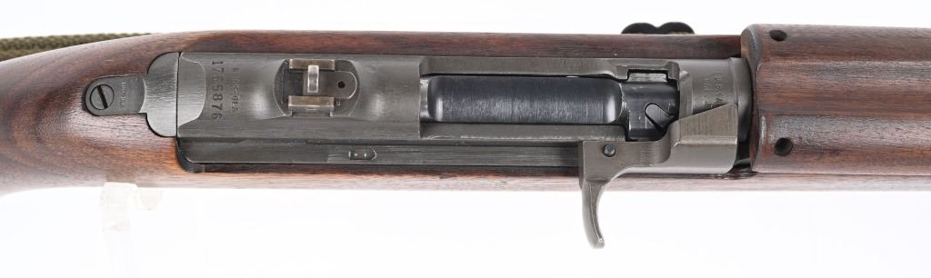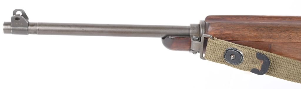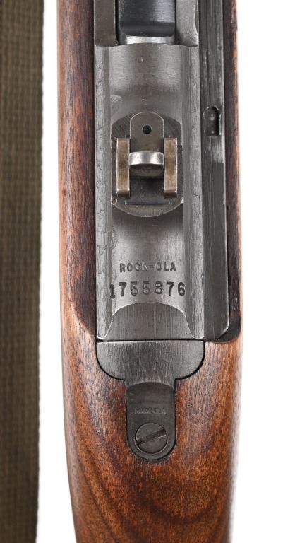 SERIAL NUMBER: 1755876. BARREL: 18". CALIBER: .30 CARBINE. MANUFACTURED: 1943. Made as part of the first contract assigned to Rock Ola Music Corp. Barrel is "ROCK-OLA" marked, and has a "P" firing proof. All parts are early Rock Ola production, including the stock and hand guard, which are both "RMC" marked. There is a faint boxed "RMC" cartouche on the left side, in addition to a crossed cannons cartouche. Standard blade front sight and flip up rear. Original parkerized finish and oiled wood stock. Includes original green canvas sling (unmarked), and metal oiler. No magazine. CONDITION: Metal is very good overall, with some wear on the barrel. Wood has a few minor scratches and dents. Bore is shiny with crisp rifling. Mechanically fine. C&R