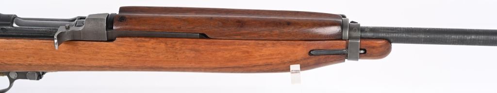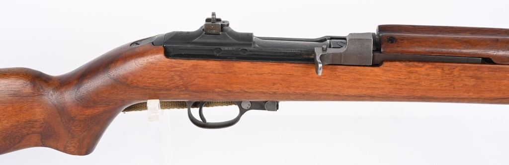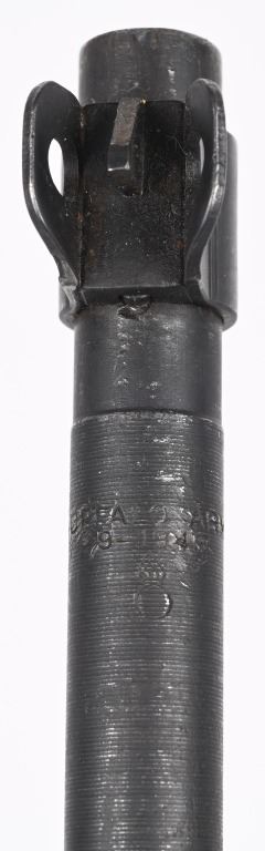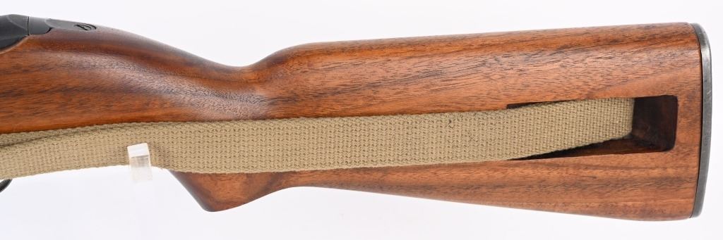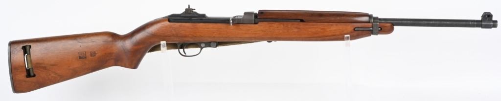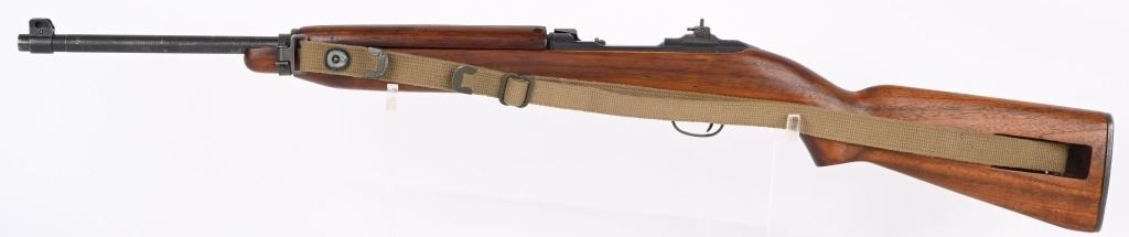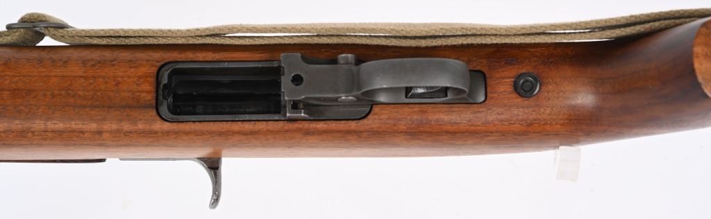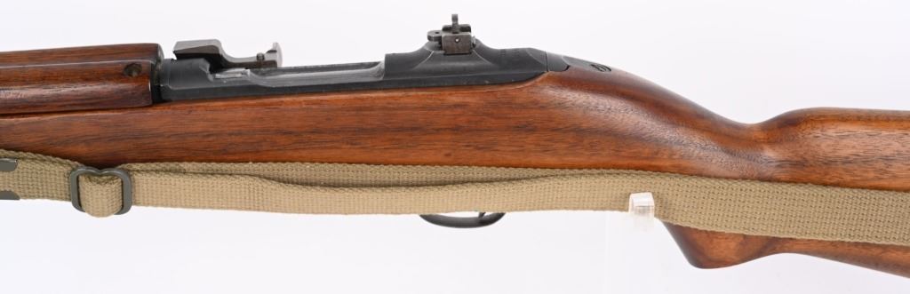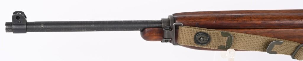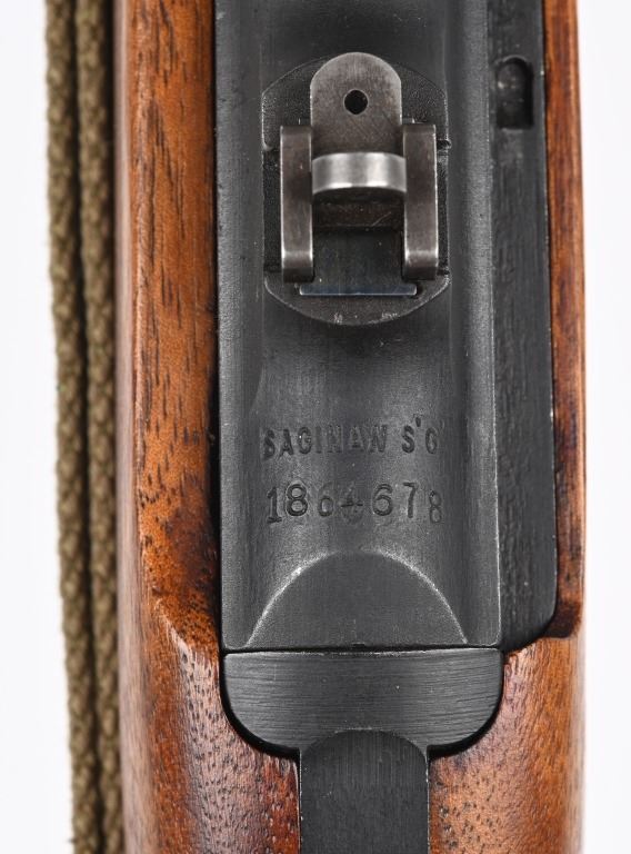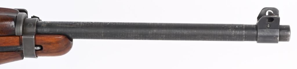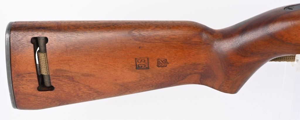 SERIAL NUMBER: 1864678. BARREL: 18". CALIBER: .30 CARBINE. MANUFACTURED: 1943. The receiver on this gun is part of the initial 50,000 that were sent from Irwin Pedersen to Saginaw for completion. Barrel is "BUFFALO ARMS/9-1943" marked, all over a flaming bomb. No import marks found. Bolt, slide and hammer are marked "S'G' ". Other small parts are Irwin Pedersen production, which is very plausible, as Irwin Pedersen sent a vast majority of their parts to Saginaw. Stock and hand guard are both marked "IR-IP", indicating Irwin Pedersen production. There is a crossed cannons cartouche on the left side, above a boxed "S'G' " cartouche. Standard blade front sight and flip up rear. Original phosphate finish on the metal components. Oiled wood stock and hand guard. Original green canvas sling (undated) and metal oiler. CONDITION: Metal is excellent overall, with light wear on the barrel. Wood has a few minor handling marks and scratches. Bore is shiny with crisp rifling. Mechanically fine. C&R