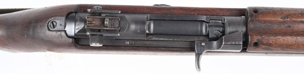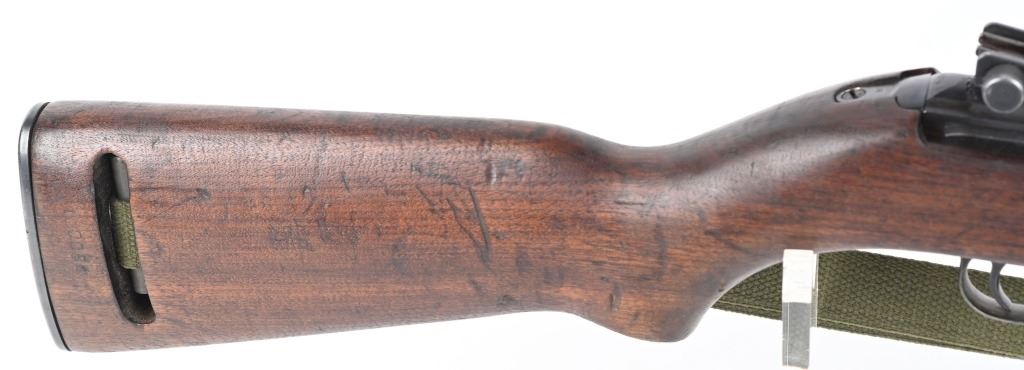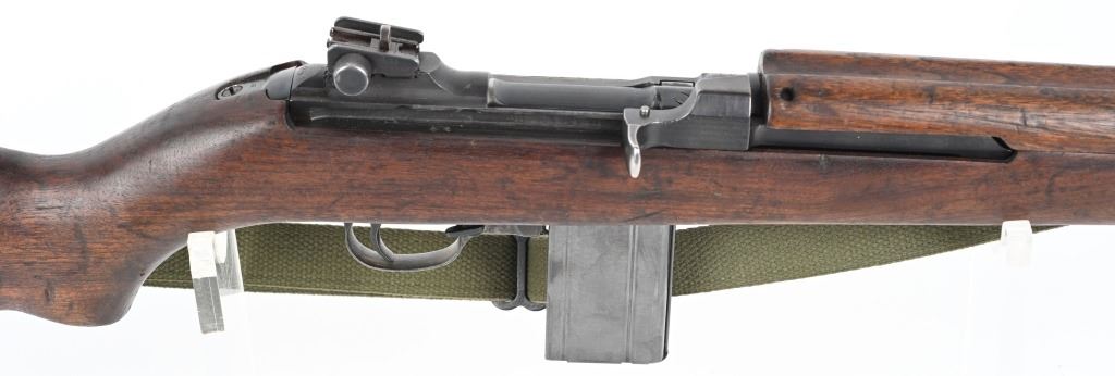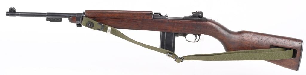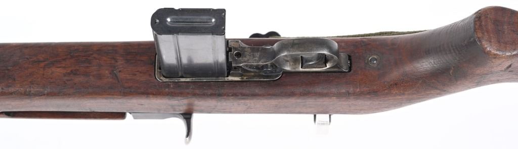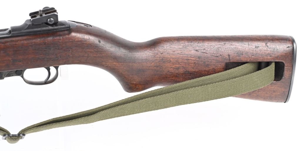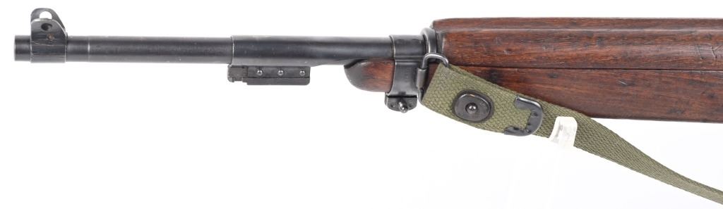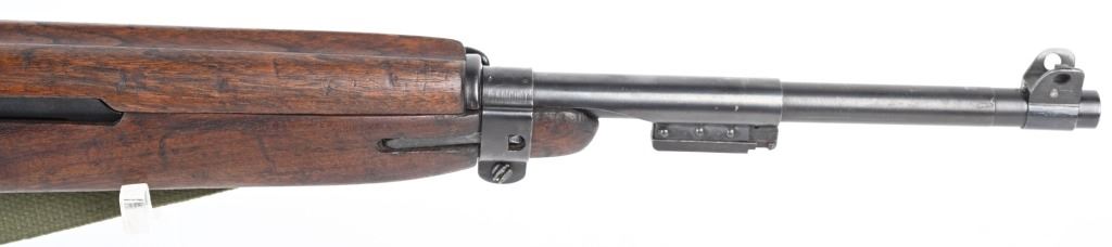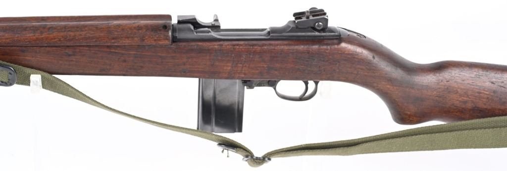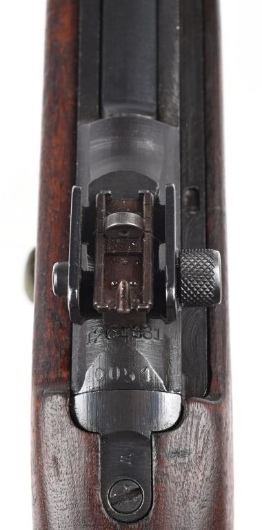 SERIAL NUMBER: 1261331. BARREL: 18", CALIBER: .30 CARBINE. MANUFACTURED: 1943. Made in the first block assigned to Winchester. Barrel is "W" marked, with no date, but a Winchester proof is present. No import marks found. Mixed parts. Slide is Saginaw, bolt Underwood, trigger housing National Postal Meter. Hand guard is "RMC" marked. Stock and lug are "W" marked. Rack number on the heel of the receiver, "0051", which is also found on the right side of the butt stock. Blade front sight and late War adjustable rear. Arsenal re-applied parkerized finish. Oiled wood stock and forearm. International Silver 15 round blued steel magazine. Includes attached reproduction green canvas sling and oiler (missing top). CONDITION: Metal is very good overall, with general wear. Wood has handling marks, scrapes and scratches. Bore is shiny with crisp rifling. Mechanically fine. C&R