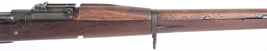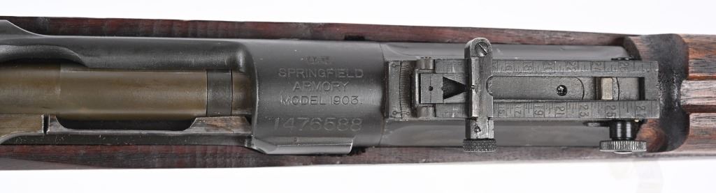 SERIAL NUMBER: 1476588. BARREL: 24". CALIBER: .30-06. MANUFACTURED: 1934. Barrel is Springfield production and is dated "4-36", under a flaming bomb. "P" firing proof on the barrel as well. Star gauged muzzle. Bolt is "R" marked for Remington. Boxed "AAHO" cartouche on the left side of the stock. "P" on the wrist. Standard 1903 sights. Parkerized finish. Oiled wood C-grip stock and forearm. Checkered metal butt plate with trap door for cleaning kit. CONDITION: Metal is excellent overall, with light edge wear. Wood has a few handling marks and scratches. Bore is shiny with crisp rifling. Mechanically fine. C&R