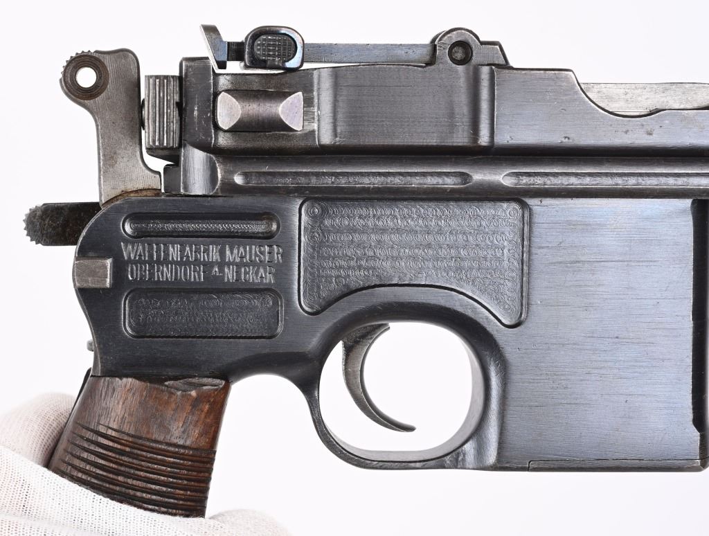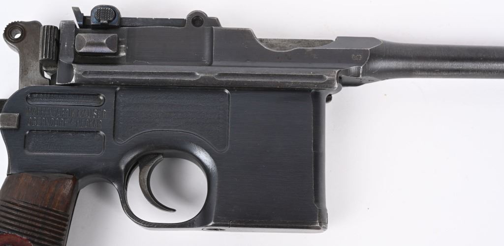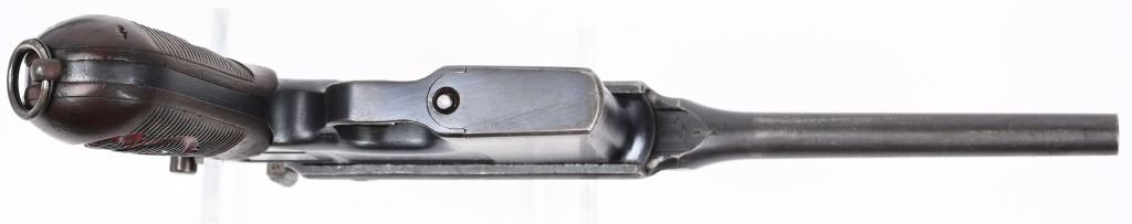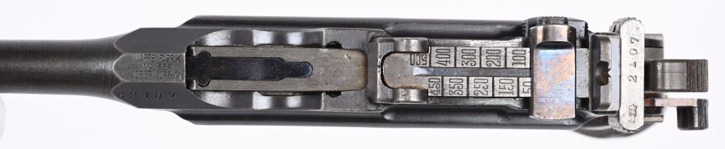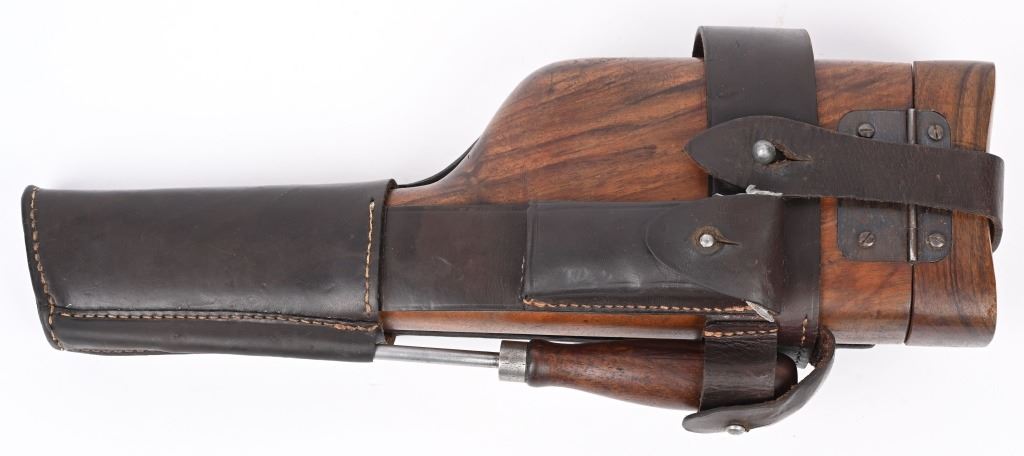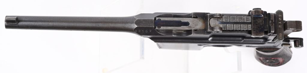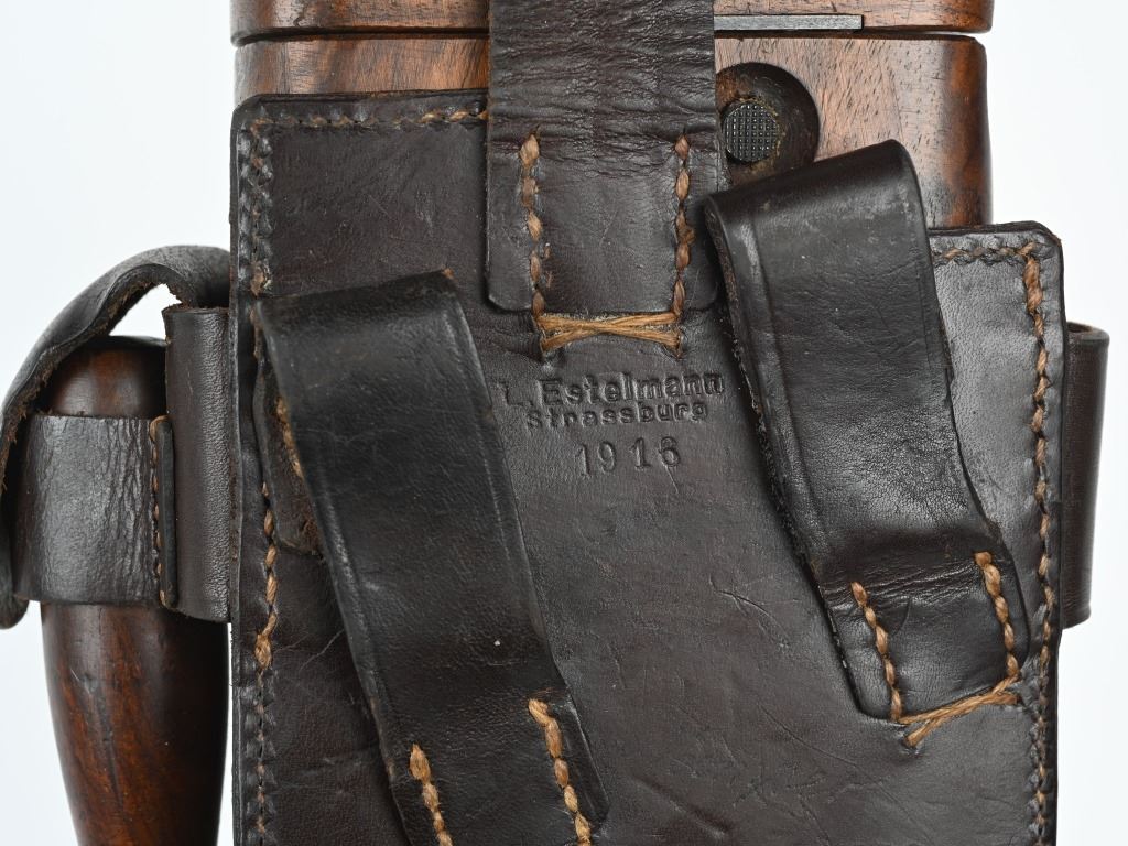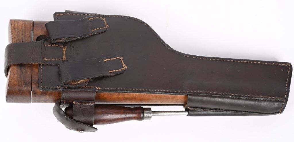 SERIAL NUMBER 62107 BARREL 5 1/2" CALIBER 9MM PARA, MANUFACTURED 1916-18. Blue finished with Grooved walnut grips with "9" on both sides. Matching serial numbers, including all internal parts. Slide adjustable rear sight graduated to 500 yards. "U" crown proof on left side of chamber with Imperial proof on right side of chamber. "NS" ( New Safety) marked hammer, Short extractor, with fire blue finished sight slide, bolt guide , extractor and safety. Pistol is housed in correct military pattern, Imperial inspected wooden shoulder stock / holster with mounting iron. Also included in correct 1916 dated leather stock holster marked "L. ESTELMANN 1916" with cleaning rod and spare magazine spring. CONDITION, Very fine with pistol retaining over 97% blue finish with slight loss of finish on barrel from holster storage and slight high point wear. Safety , sight slide , bolt guide and extractor all retain at least 855 fire blue finish. Bore is excellent and bright. Grips are very fine , full sized with 98% red paint remaining in "9" monogram on grips. Action operates properly. Stock is numbered to another pistol but is correct military pattern and is very fine with no cracks . Leather remains very fine , supple and with solid stitching. C&R