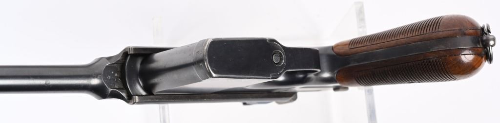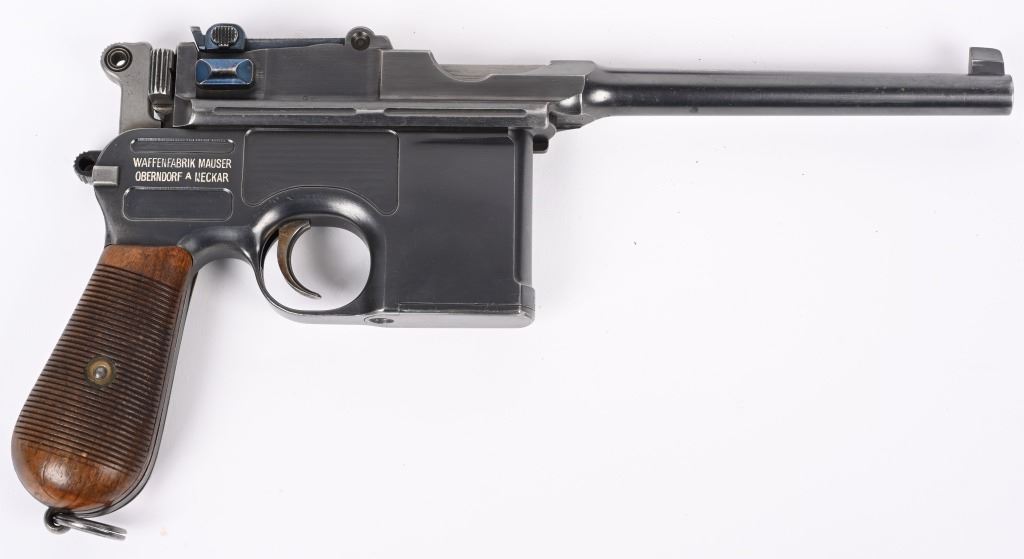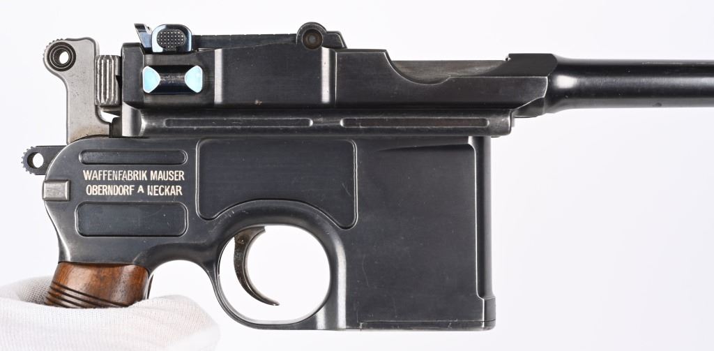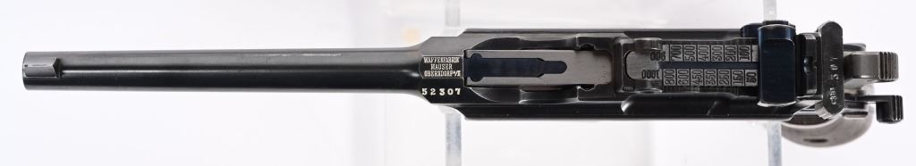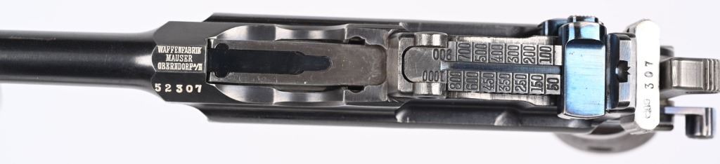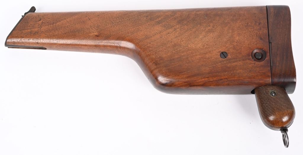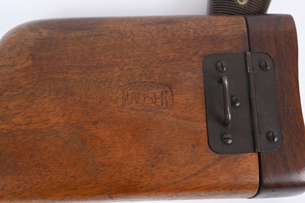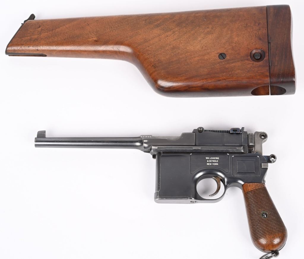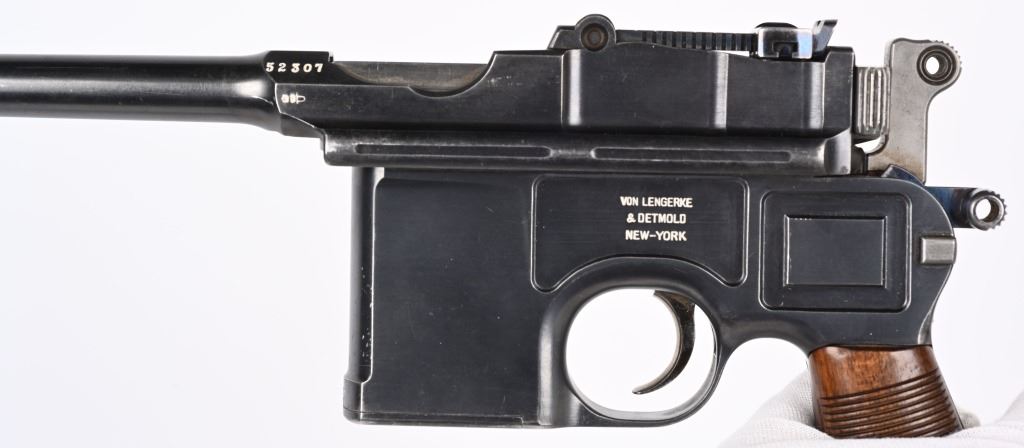 SERIAL NUMBER 52307 BARREL 5 1/2" CALIBER .30 MAUSER / 7.63 MAUSER MANUFACTURED 1905. Polished blue finished pistol with grooved 2 piece walnut grips. Straw finished trigger with fire blue finished short extractor, sight slide, safety and bolt guide. Marked on left side of frame"VON LENGERKE & DETMOLD NEW-YORK" Right side of frame is marked "WAFFENFABRIK MAUSER OBERNDORF A NEKAR" Matching numbers through out pistol with proper commercial Mauser Banner marked shoulder stock / holster. Commercial stocks are NOT numbered from the factory on the iron. "U" crown proofed on left side of chamber with 1000 meter marked sight . CONDITION, Very fine with pistol retaining over 98% factory blue finish and over 95% fire blue finishes. Bore is brilliant bright and action operates properly. Grips are superb with a few period of use scratches and impressions. Stock is equally fine with no cracks and a few minor period dents and impressions. C&R