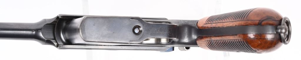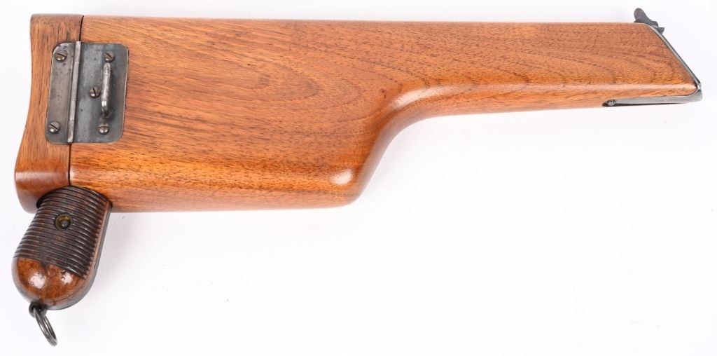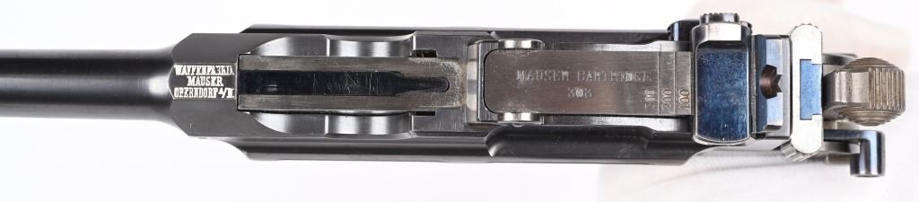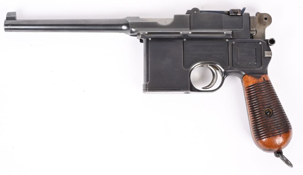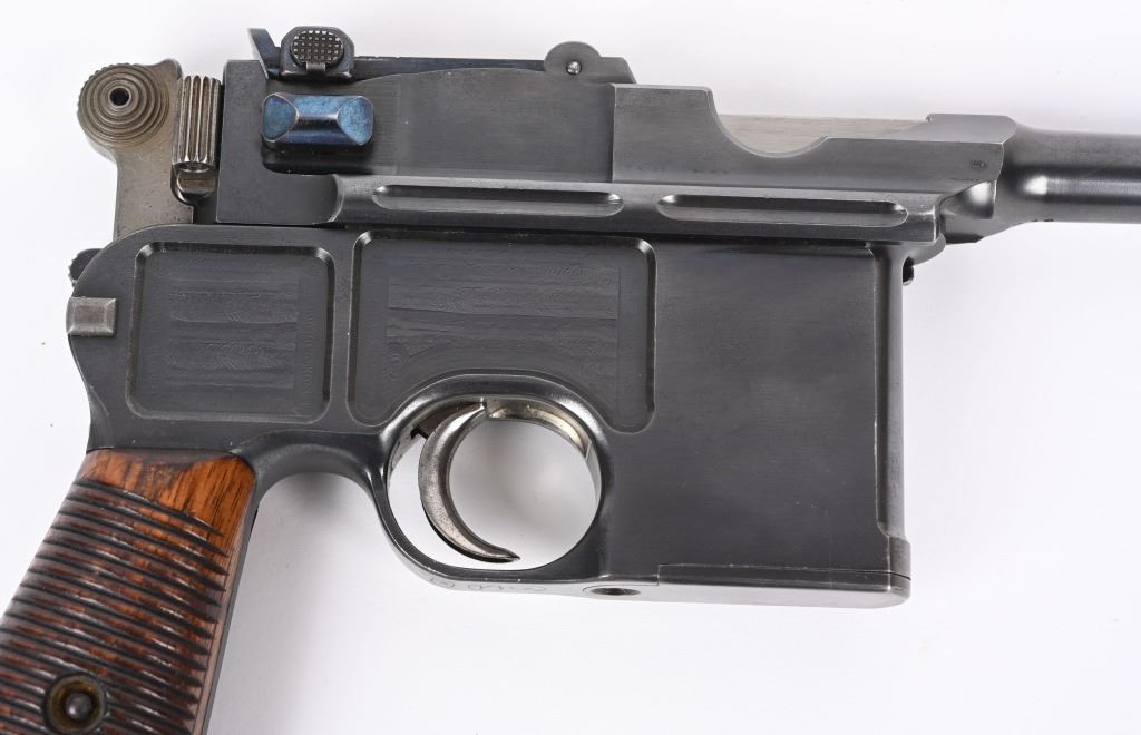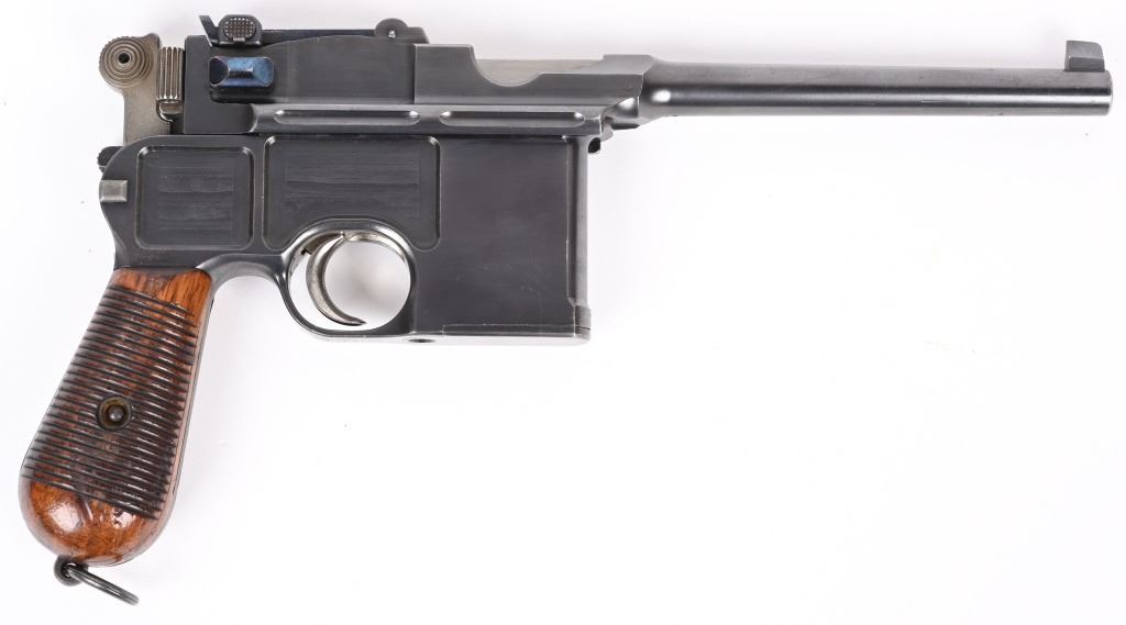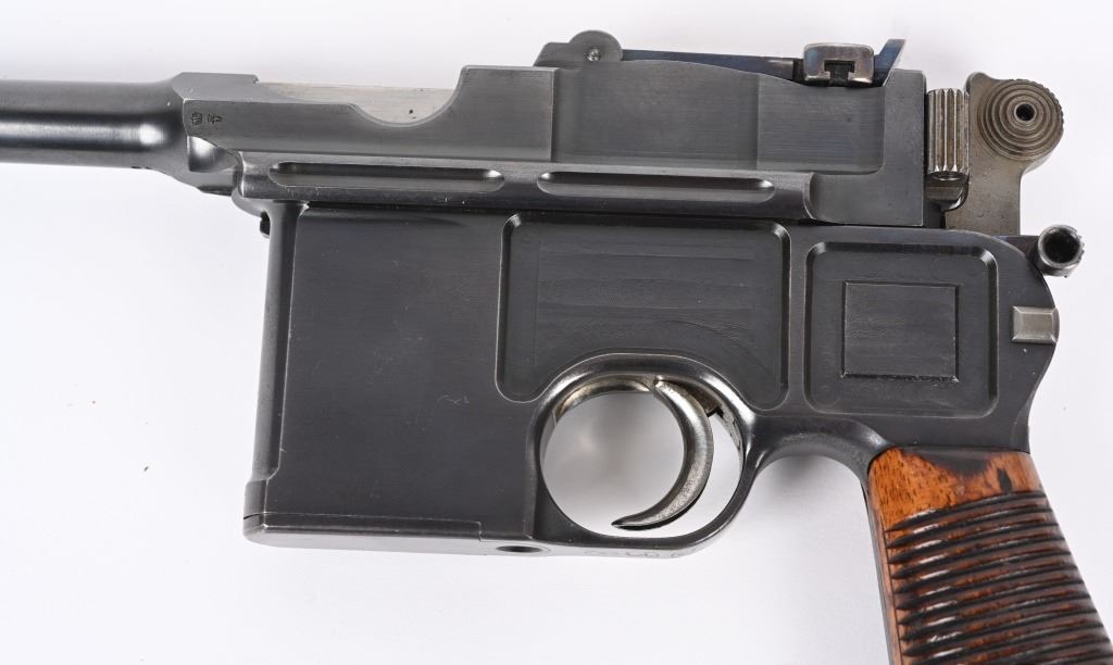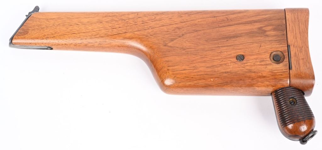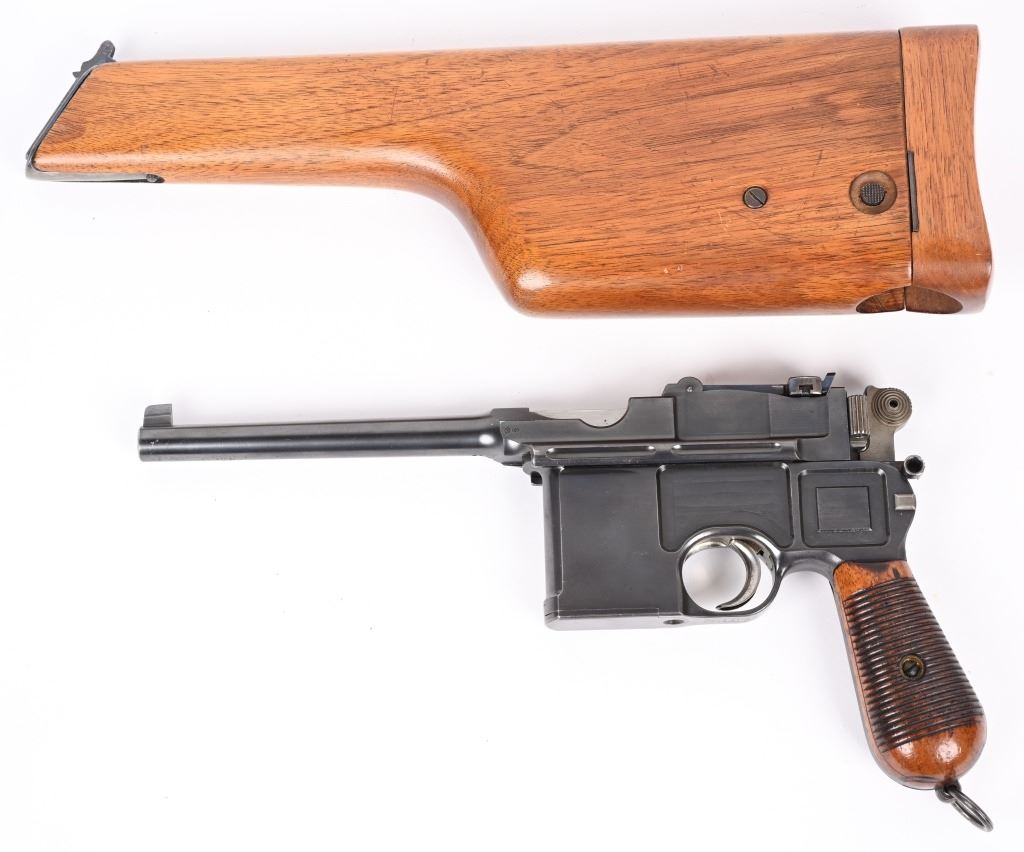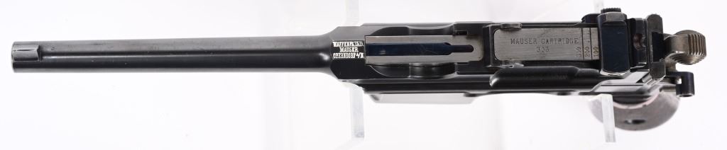 SERIAL NUMBER 3225 BARREL 5 1/2" CALIBER 30 MAUSER / 7.63 MAUSER MANUFACTURED 1897. Antique Mauser C96 Conehammer Broomhandle pistol with rare "MAUSER CARTRIDGE 303" marked slide adjustable rear sight graduated from 100-300 yards. These sights are attributed to pistols marketed by Westley Richards & Company and only appear on the early Conehammer pistol. Rust blue finish with fire blue finish on sight slide, firing pin gate, bolt guide, long narrow extractor and safety. Crown "U" proof on left side of chamber Top chamber flat marked "WAFFENFABRIK MAUSER OBERNDORF A/N" Top of bright polished rear sight is marked "MAUSER CARTRIDGE 303" and is graduated 100/200/300. Pistol has all matching numbers including grips . The pistol has a Siamese Charka marking on the backstrap just above the stock mounting slot. CONDITION, Very fine as period refinished with fine bright bore. Pistol retains over 97% blue with over 95% fire blue finish. Grips are very fine with evidence of added finish. Stock is very fine and without cracks and has been period refinished. Stock iron is without any number. Action operates properly. ANTQUE