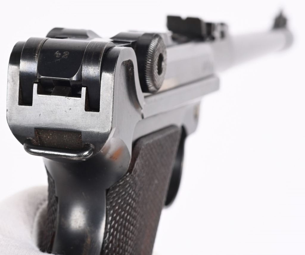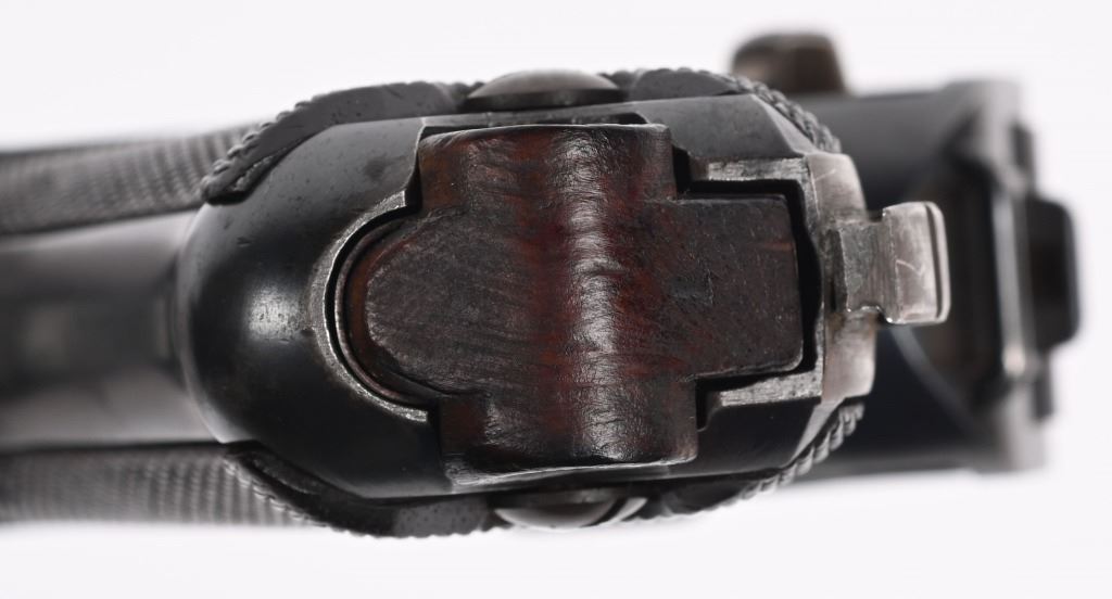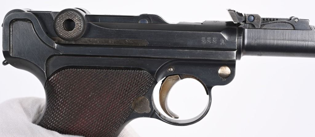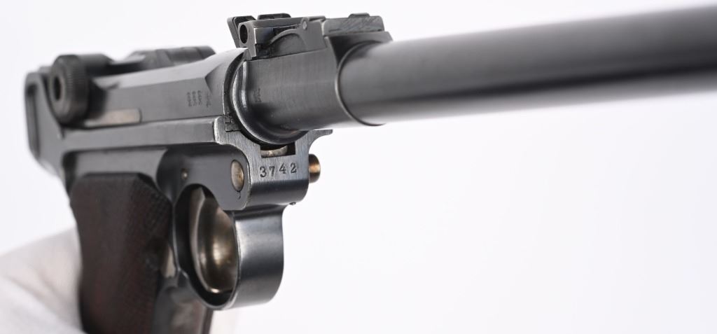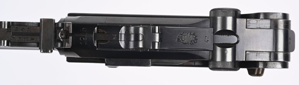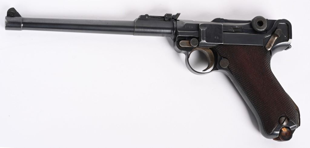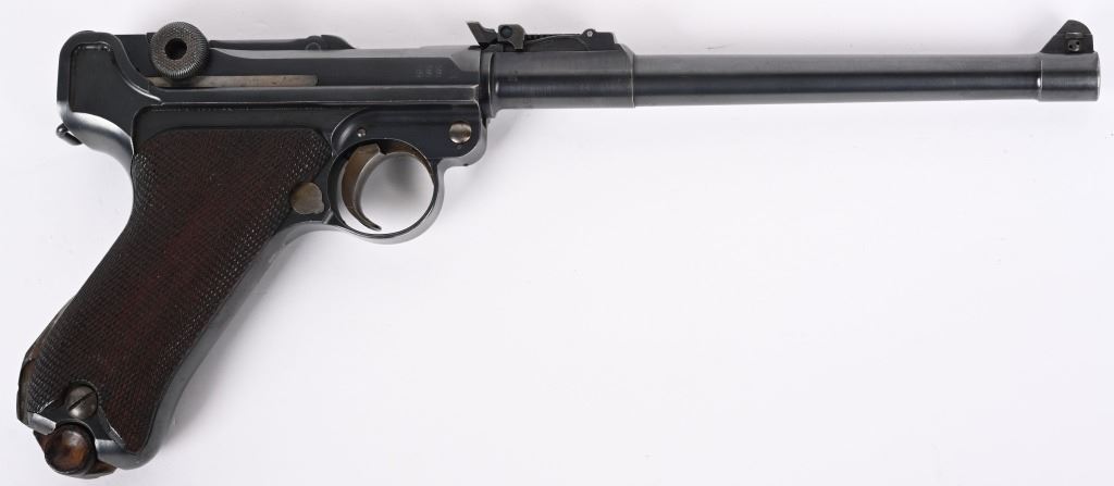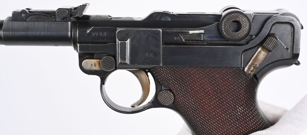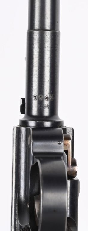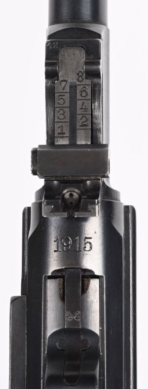 SERIAL NUMBER: 3742. BARREL: 7-3/4". CALIBER: 9MM LUGER MANUFACTURED: 1915. Designed to be used with a shoulder stock and often issued to artillery regiments. Imperial proofs on the right side of the chamber. Eagle on the right side of the barrel. No import marks found. All matching, including the checkered wood grips. Toggle pin is not numbered. Blade front sight, with rear tangent adjustable to 800 meters. Original blue and straw finishes. Includes an unnumbered wood bottom magazine. CONDITION: Blue and straw finishes are excellent overall, with light wear, and approximately 90% plus of both finishes remaining. Grips are excellent with crisp checkering. Bore is frosted, with good overall rifling. Magazine has light finish wear. There is a chip on the wood bottom. Magazine is ill fitting to the gun. C&R