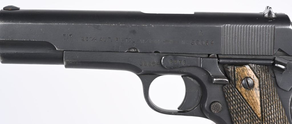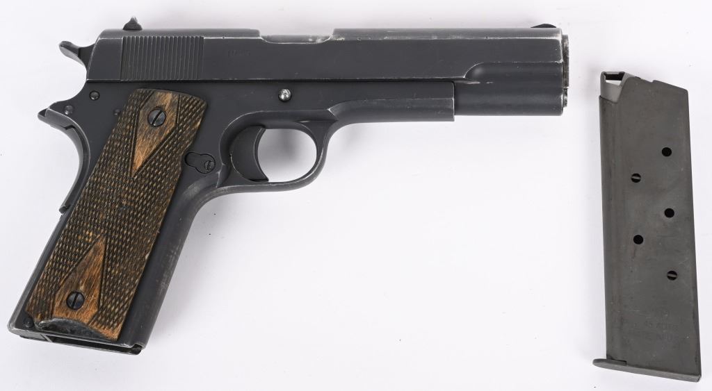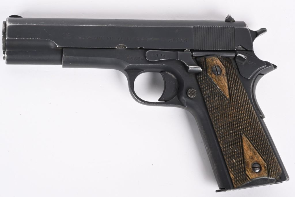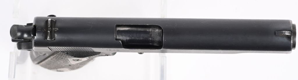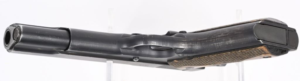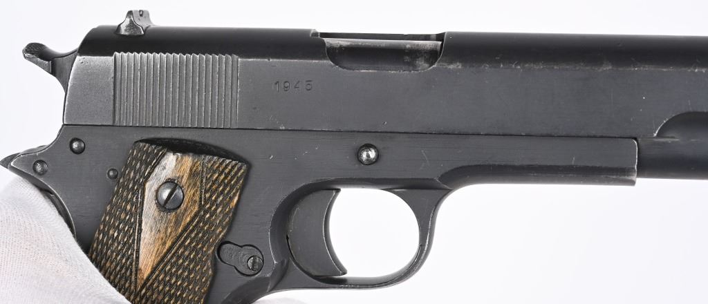 SERIAL NUMBER: 30064. BARREL: 5". CALIBER: .45 ACP. MANUFACTURED: 1945. Made under German occupation, at the Kongsberg factory. Standard Norwegian markings, including "K" inspector marks. There is an "eagle/WaA84" on the left side of the slide. No import marks found. Matching serials on the slide, frame, trigger and safety. Barrel is not numbered, being marked "RP" on the bottom. Standard blade front sight and u-notch rear. Light phosphate finish. Checkered lacquered grips. Includes a new made KM Tool phosphate finished seven round magazine. CONDITION: Metal is very excellent overall, with light wear. Grips are excellent, with a few handling marks. Bore is shiny with crisp rifling. Fine mechanics. Magazine is excellent. C&R