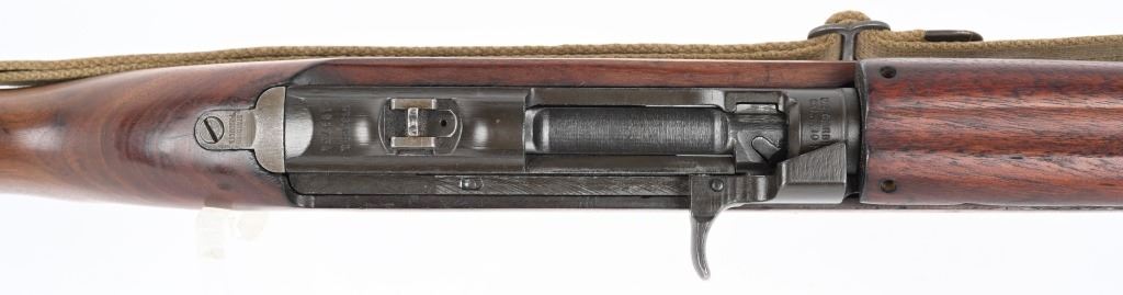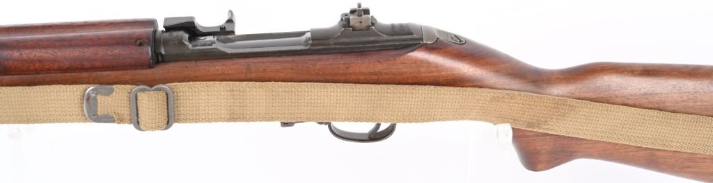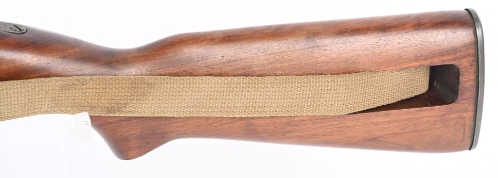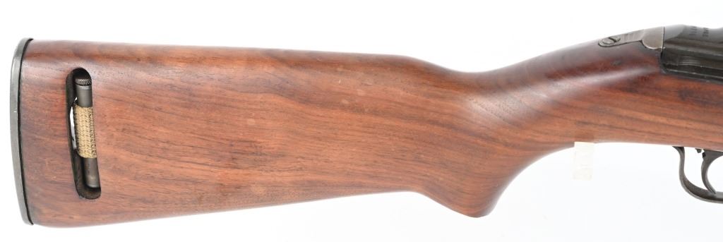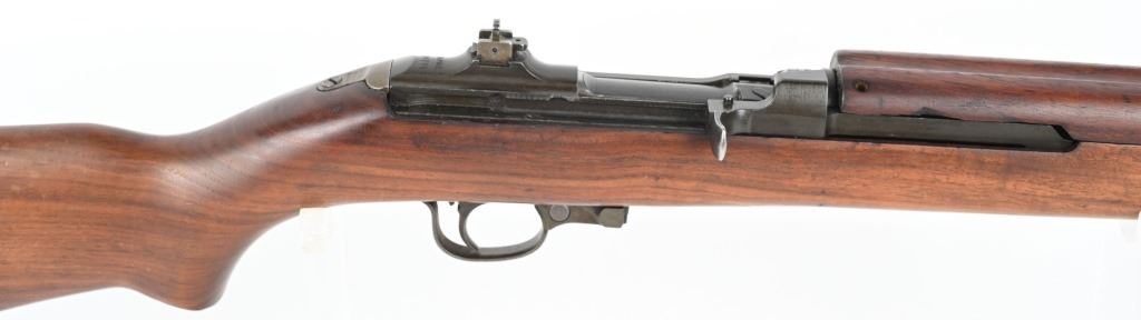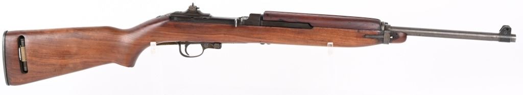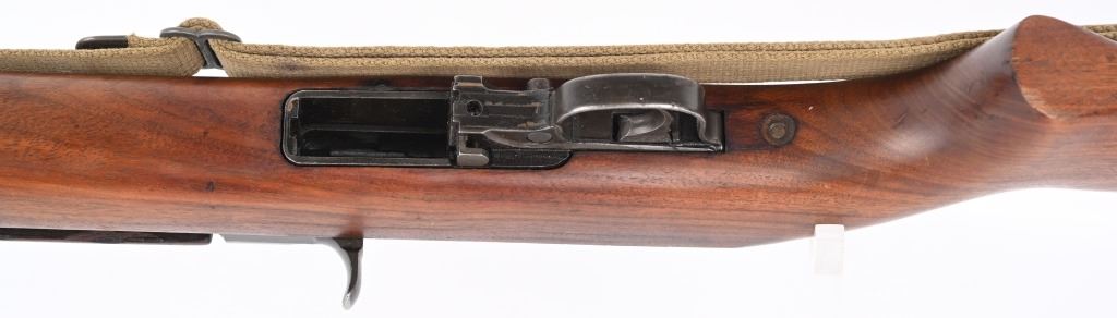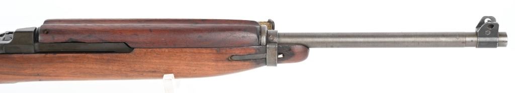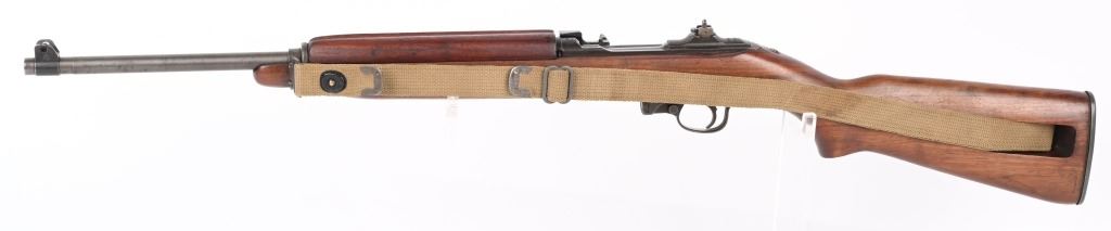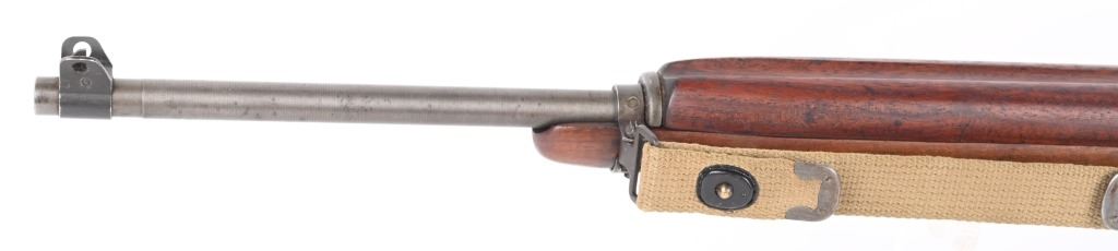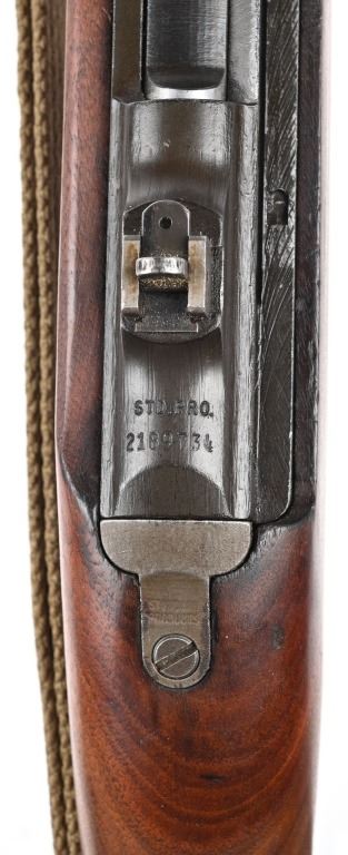 SERIAL NUMBER: 2189734. BARREL 18". CALIBER: .30 CARBINE. MANUFACTURED: 1943. Barrel is dated "2-44" and is Underwood production. No import marks found. All internal parts look to be Standard Products marked, including the stock lug. Hand guard and stock are Standard Products contractor production. Blade front sight and two position flip rear (looks to be Standard Products production). Original parkerized finish. Stock has been lightly sanded and oiled. Includes attached period green canvas sling (undated) and metal oiler. CONDITION: Metal is very good overall, with most of the wear on the barrel. Wood is excellent overall, with a few handling marks. Bore is shiny with crisp rifling. Mechanically fine. Sling has wear and discoloration. C&R