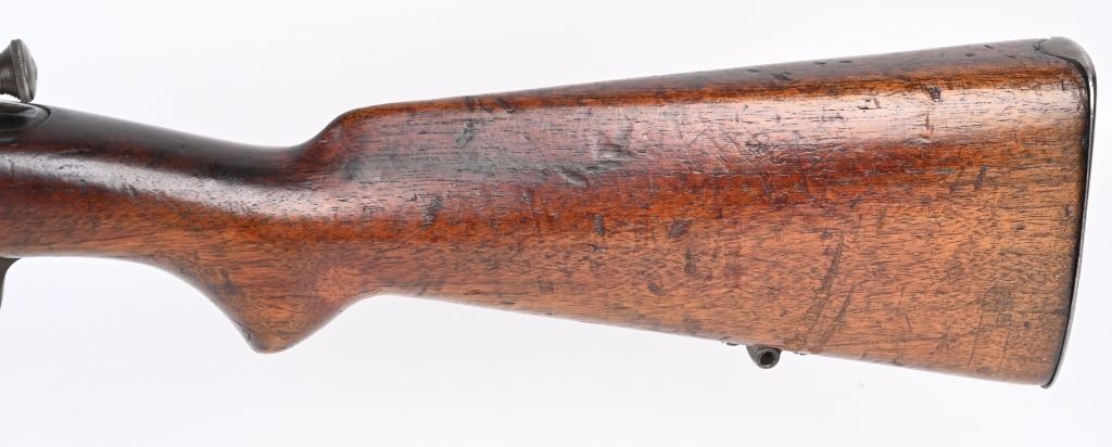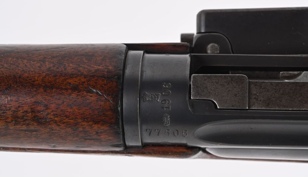 SERIAL NUMBER: 77606. BARREL: 30". CALIBER: 6.5X55 SWEDISH. MANUFACTURED: 1906. Standard issue in Norwegian service from 1894-WW2. No import marks found. Matching serials on the receiver, stock, butt plate, trigger guard , bands and rear sight. Bolt does notch match. Original blade front sight and rear ladder adjustable to 2200 meters. Original blued finish and oiled wood furniture. Smooth metal butt plate with a trapdoor for cleaning kit. CONDITION: Metal is good overall, with general wear and brown patina. Wood is very good overall, with minor scrapes and scratches. Bore is frosted with strong rifling retained. Mechanically fine. C&R