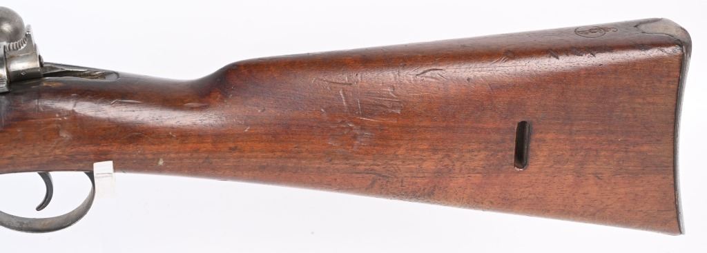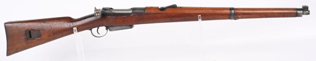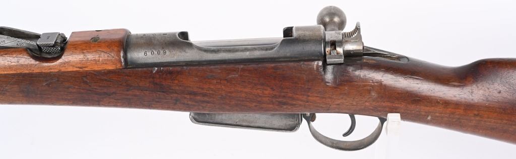 SERIAL NUMBER 6009 BARREL 22" CALIBER 7.5 SWISS MANUFACTURED CIRCA 1893. Blue finished barrel and receiver with bright finished straight pull bolt assembly/ Full length walnut stock and handguard. Swiss cross inspected on receiver bridge and stock. First straight pull rifle of Swiss adoption with approx, 7000 produced. CONDITION, Very good with 85% blue finish remaining with bright sharp bore and properly operating action. Stocks are very good with bruises and impressions. Magazine is mismatched by number. ANTIQUE