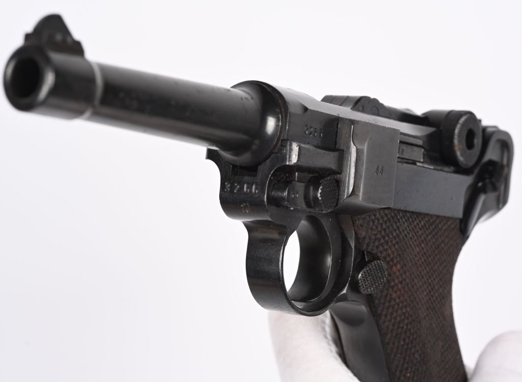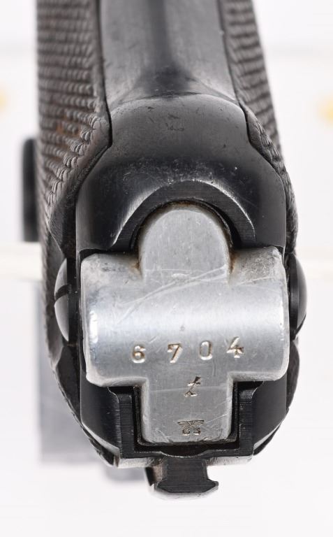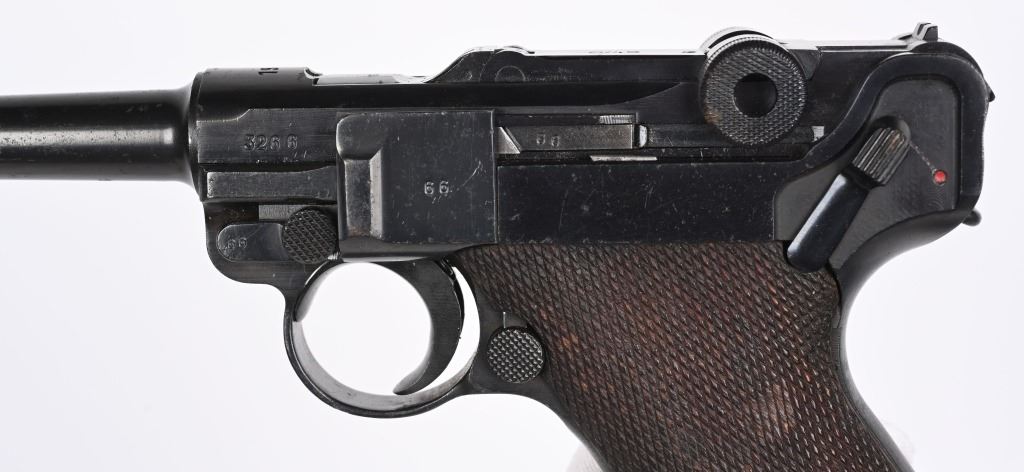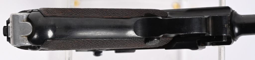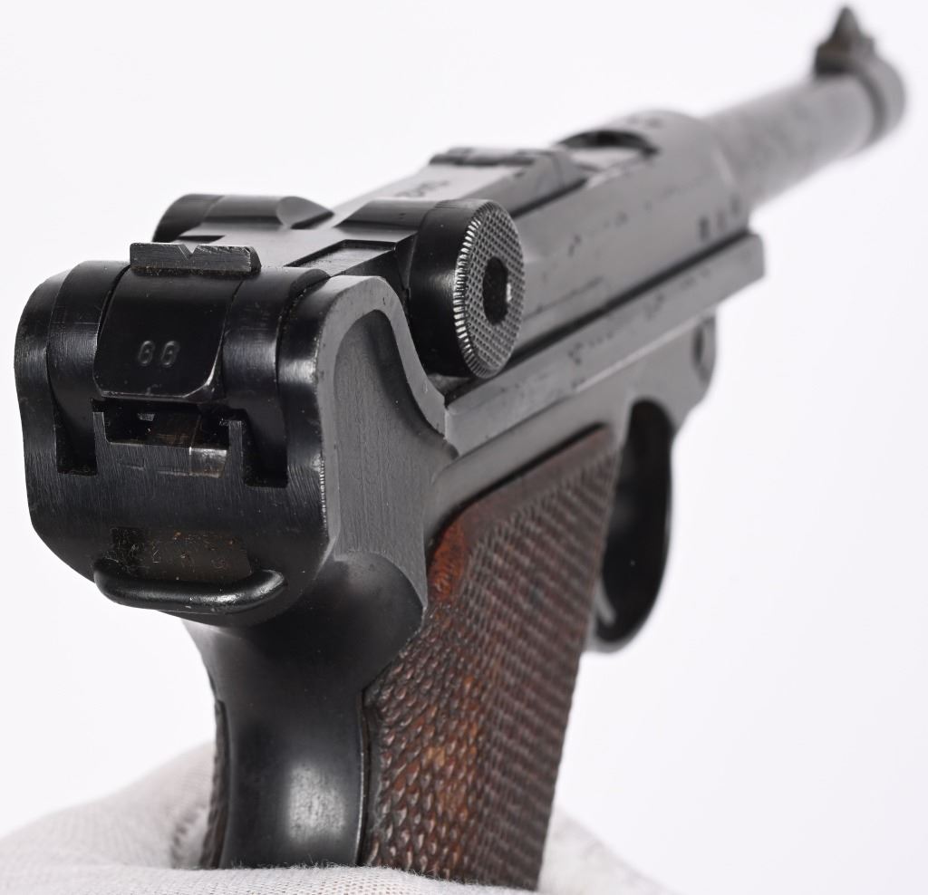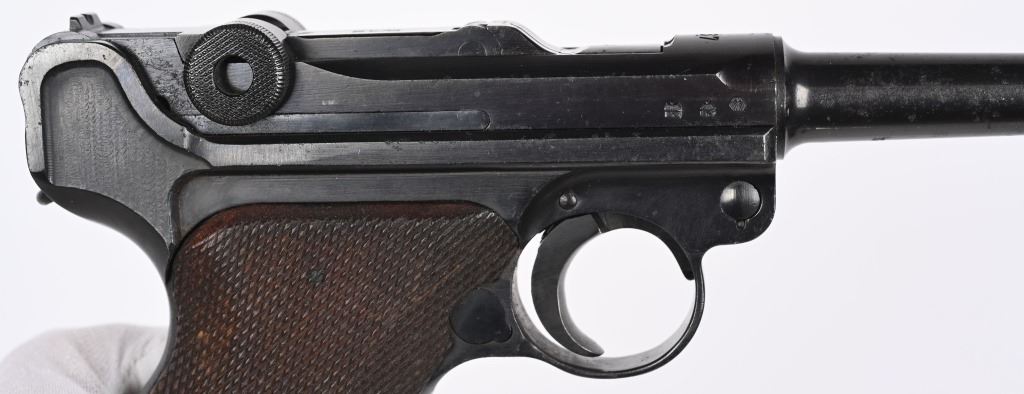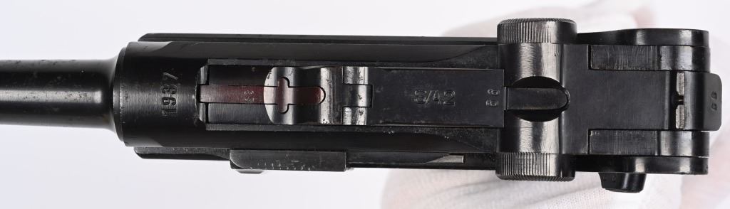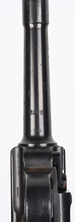 SERIAL NUMBER: 3266X. BARREL: 4". CALIBER: 9MM LUGER. MANUFACTURED: 1937. "S/42" marked toggle, being made at Mauser. Pre war "eagle/63" proofs on the right side of the chamber. Small import mark on the right side of the frame. Matching serial numbers throughout, including the checkered wood grips (arsenal re-numbered). Standard sights. Arsenal re-blued finish. Includes a non matching "eagle/63" aluminum bottom magazine. Also includes a "1937" dated brown leather holster with original metal takedown tool. Holster maker is illegible. CONDITION: Metal is very good overall, with a few handling marks and scratches. Grips are very good overall. Bore is shiny with crisp rifling. Mechanically fine. Magazine has light wear. Holster is good overall, with wear and discoloration. Top and strap have heavy crazing. Stitching is coming apart around the edges. C&R