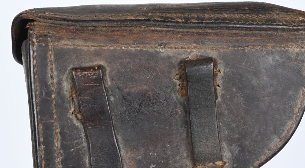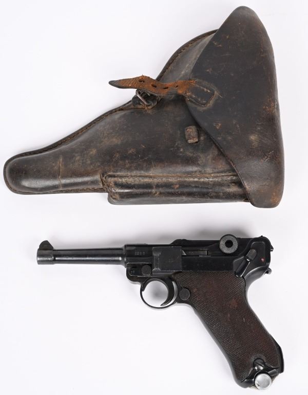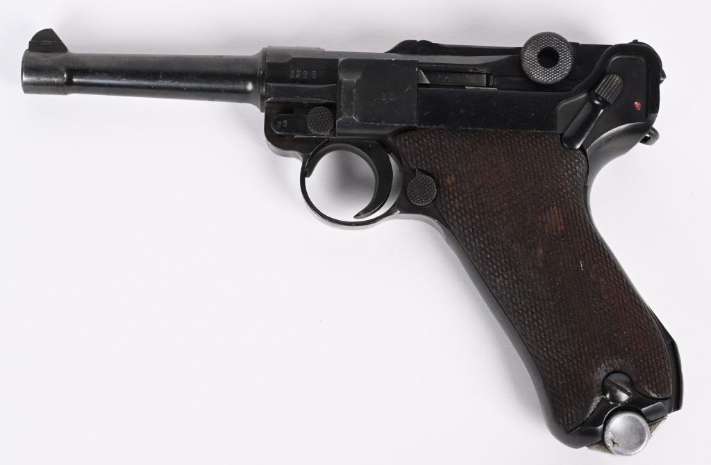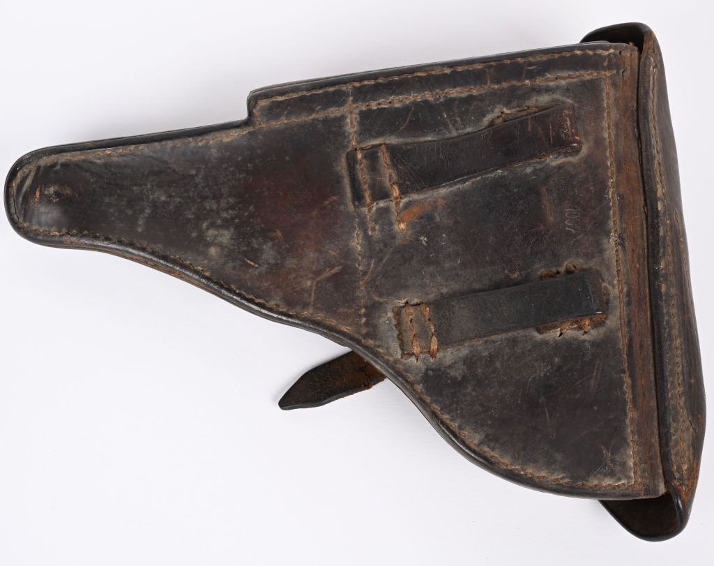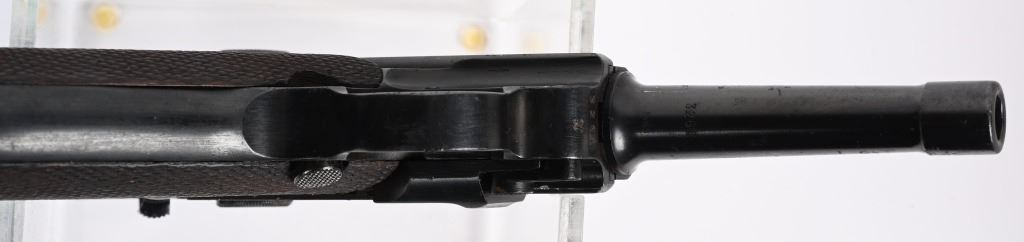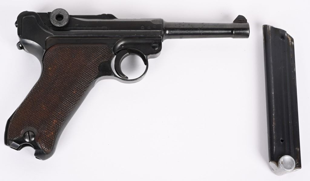 SERIAL NUMBER: 3266X. BARREL: 4". CALIBER: 9MM LUGER. MANUFACTURED: 1937. "S/42" marked toggle, being made at Mauser. Pre war "eagle/63" proofs on the right side of the chamber. Small import mark on the right side of the frame. Matching serial numbers throughout, including the checkered wood grips (arsenal re-numbered). Standard sights. Arsenal re-blued finish. Includes a non matching "eagle/63" aluminum bottom magazine. Also includes a "1937" dated brown leather holster with original metal takedown tool. Holster maker is illegible. CONDITION: Metal is very good overall, with a few handling marks and scratches. Grips are very good overall. Bore is shiny with crisp rifling. Mechanically fine. Magazine has light wear. Holster is good overall, with wear and discoloration. Top and strap have heavy crazing. Stitching is coming apart around the edges. C&R