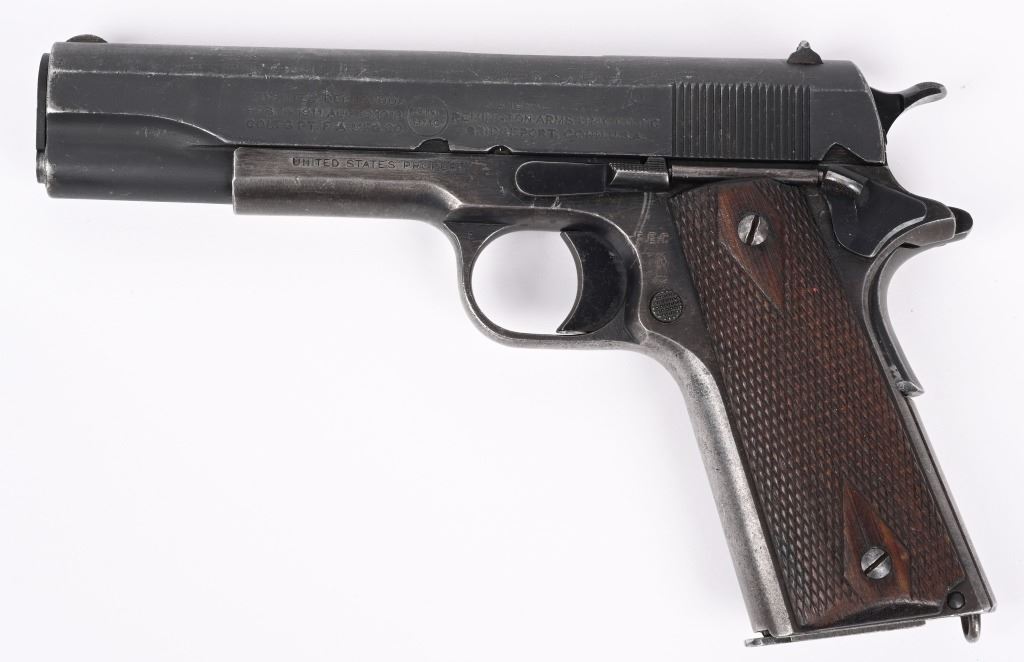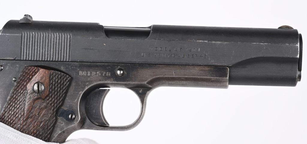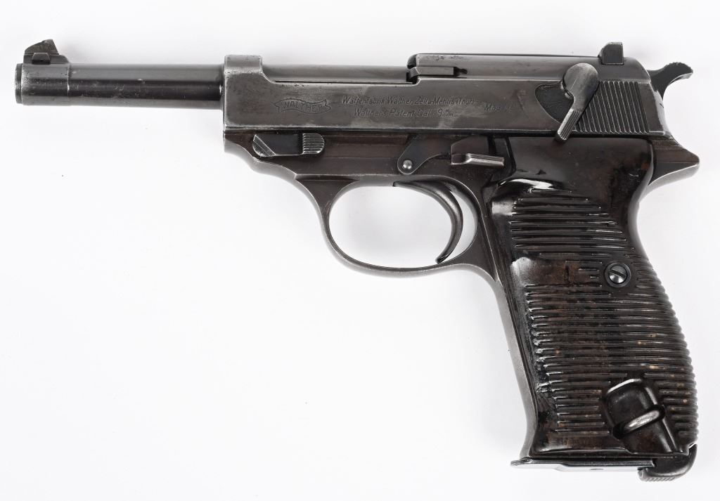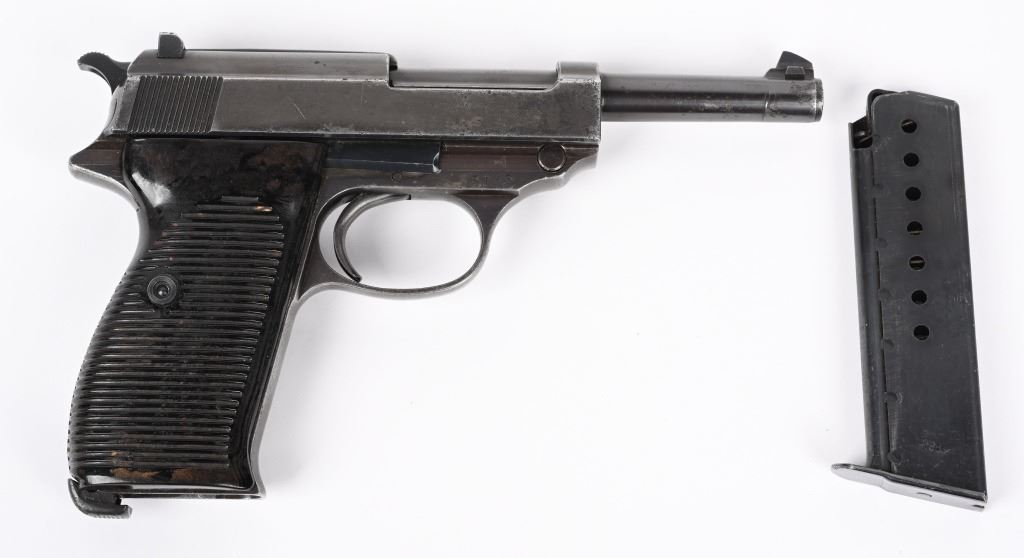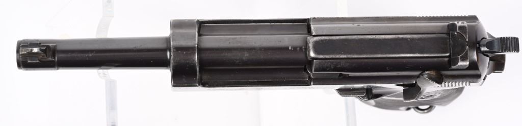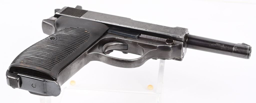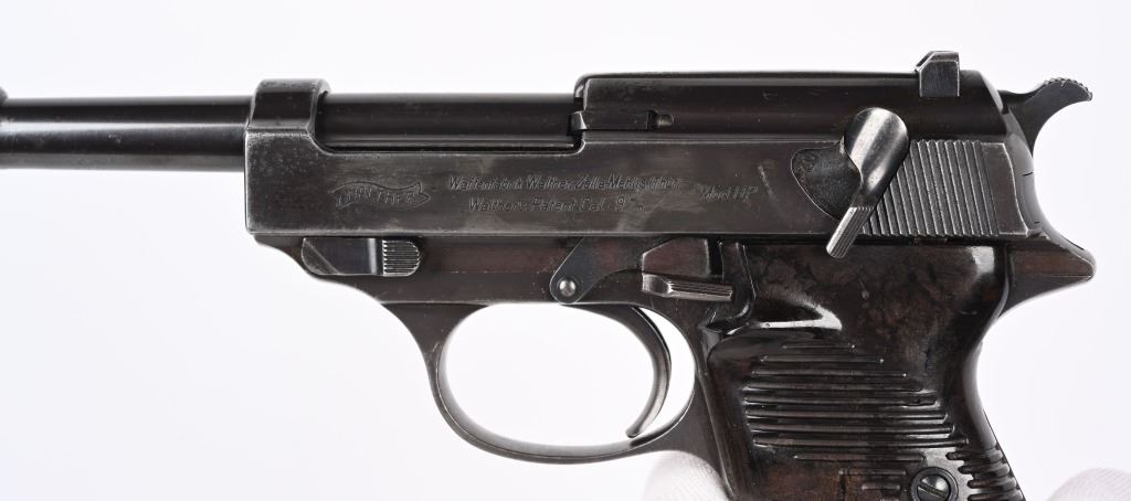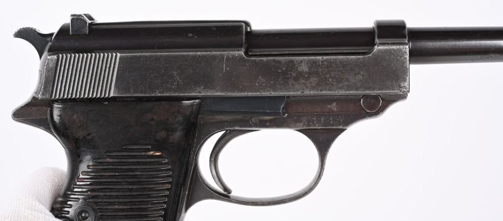 SERIAL NUMBER 3143 BARREL 5" CALIBER PMM PARA, MANUFACTURED CIRCA 1939. Commercially finished and proofed Eagle "N" on frame and barrel. The predecessor to the Walther P-38 the HP ( Heeres Pistole) had a very limited commercial offering with some being sold in Germany and Austria to the civilian market as well as a military contract to Sweden. Upon being adopted by Germany as the official sidearm it was renamed the P-38 produced by Mauser, Walther, SpreeWerke as well as abroad in France under the German code SVW. High polish blue with matching serial numbers on slide, frame barrel and locking block. Fitted with grooved brown Bakalite grips and a war time blue finished magazine marked "P.38v" on left side. CONDITION, Good with 75% blue finish remaining on slide, 90% blue finish on barrel and 60% blue finish on frame. Grips are very fine with no distress. Bore is dark with visible rifling and action operates properly. Most of these early production HP Pistols ended up being used during WW2 as private purchase arms and have a relatively low survival rate. C&R
