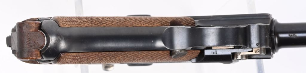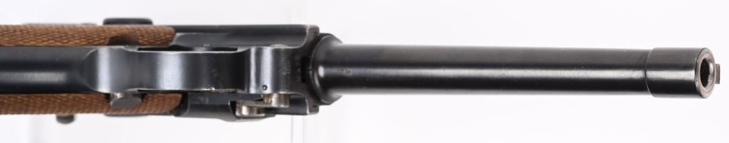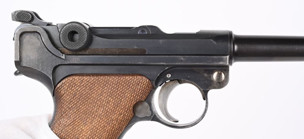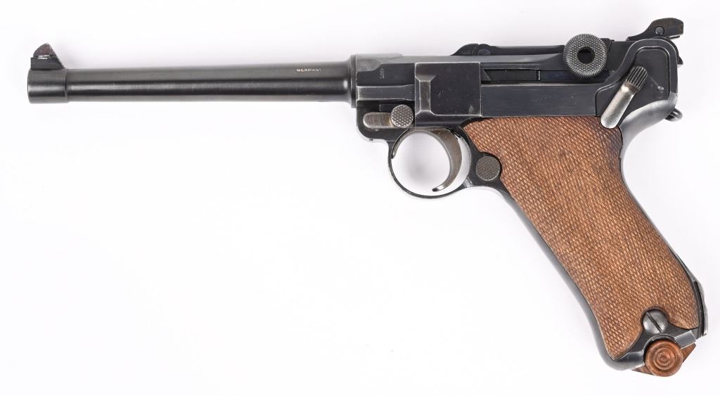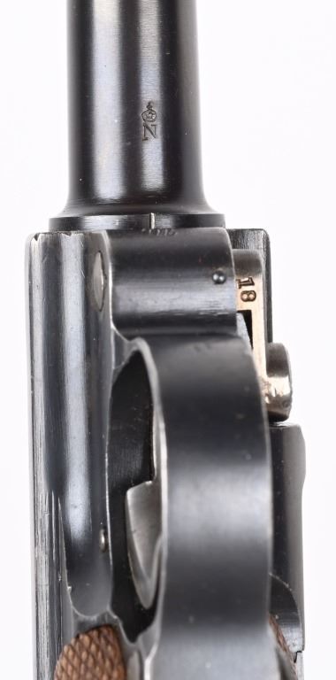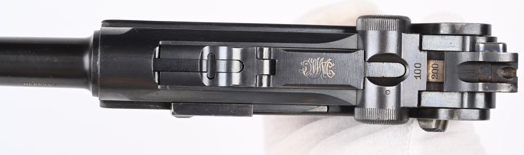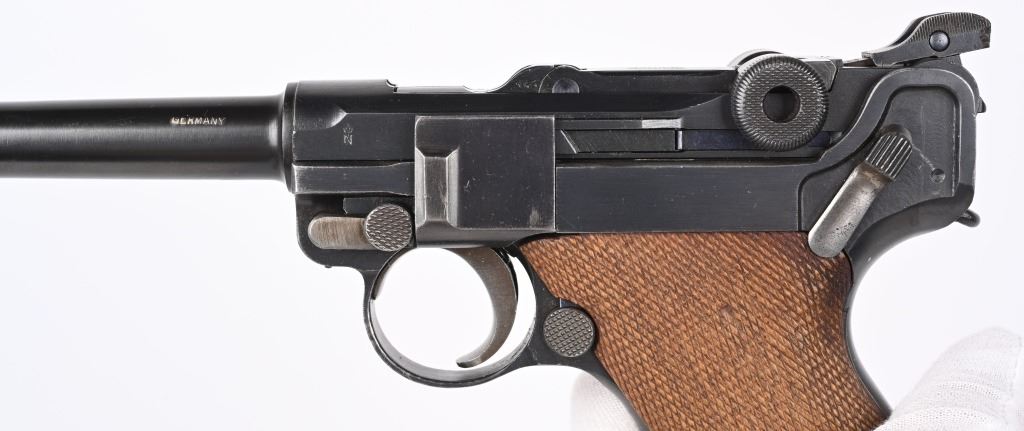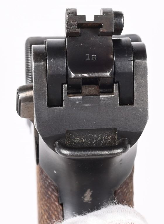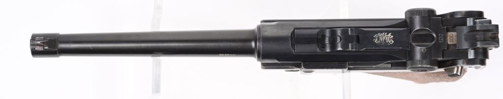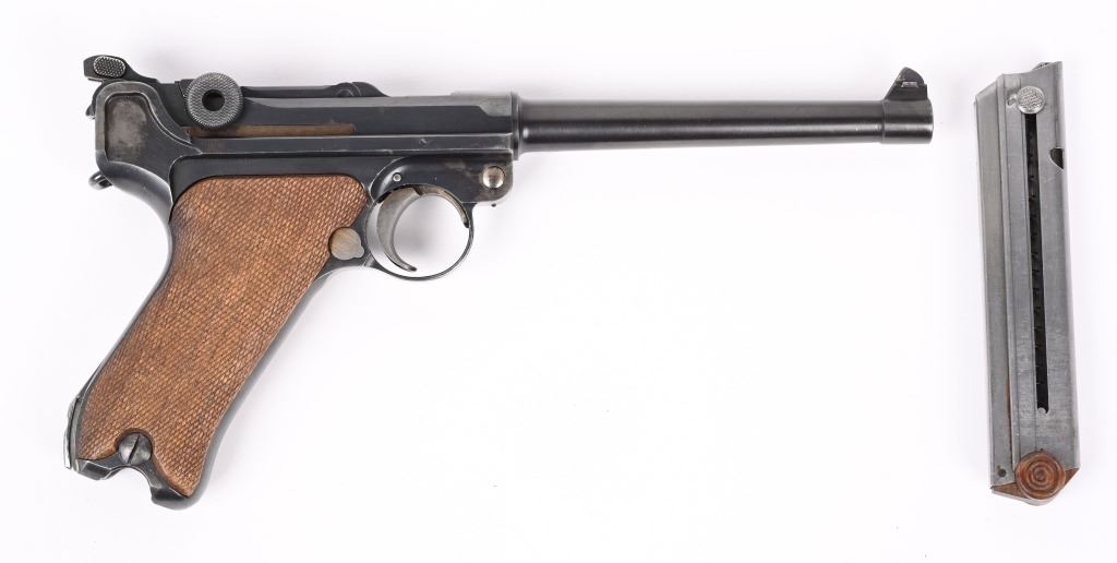 SERIAL NUMBER 5418m BARREL 6" CALIBER 7.63 LUGER / .30 LUGER MANUFACTURED CIRCA 1920. Produced by DWM with blue finish and straw finished trigger, safety, takedown latch and magazine release. Matching serial numbers and proofed with Crown "N" proofs on barrel, bolt head and upper frame. Checkered walnut grips. DWM in script on toggle. Drift adjustable front sight with Slide adjustable Navy Pattern 200 meter rear sight. Grip frame is equipped with stock lug for shoulder stock. Marked GERMANY for export on barrel. condition. Very fine as refinished with brilliant bright bore and fine checkered grips. Action operates properly. Magazine is proper unnumbered wood based example with contemporary wood base. C&R