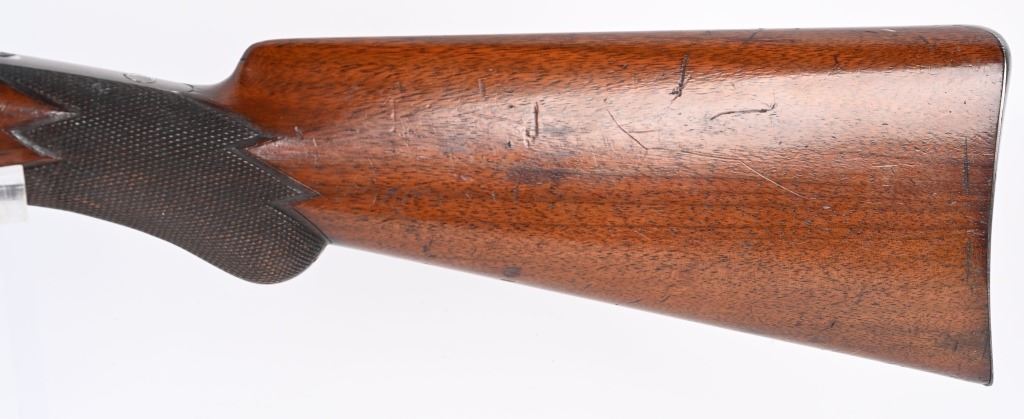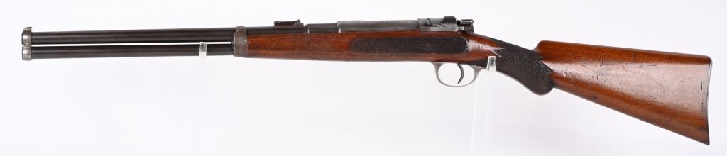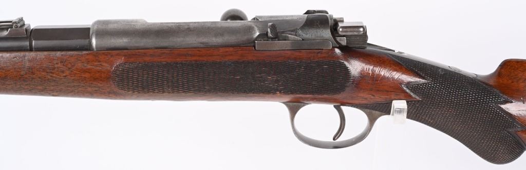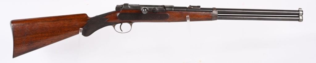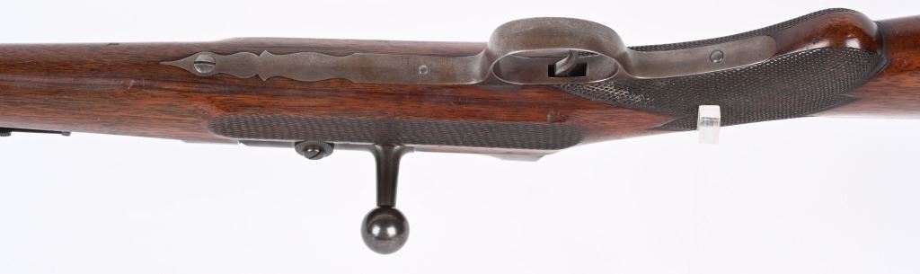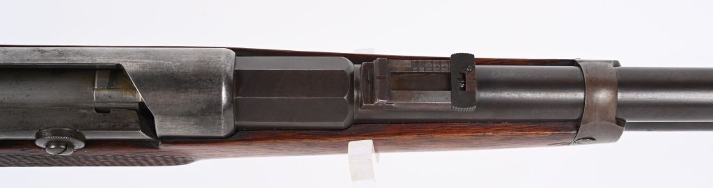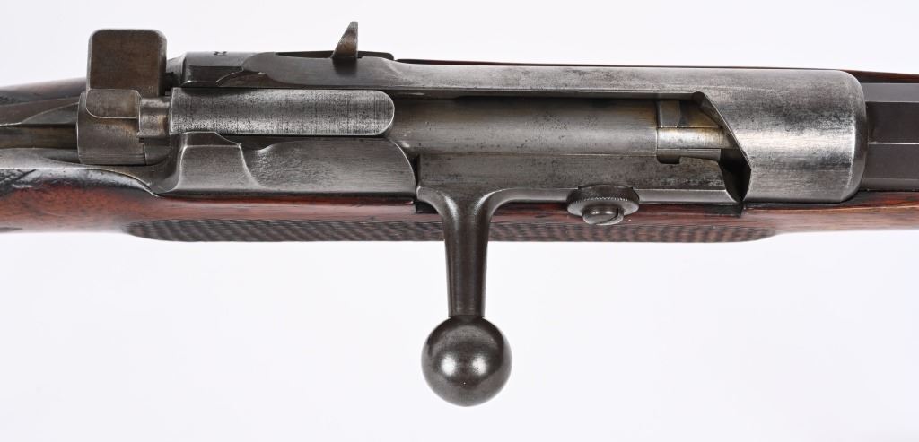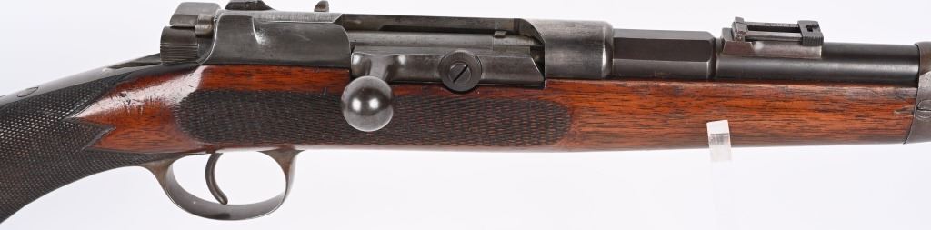 SERIAL NUMBER N/A BARREL 17" CALIBER 11 MAUSER MANUFACTURED CIRCA 1885. Extremely rare Mauser Commercial Sporting Carbine. Tube magazine fed with magazine cut-off like its Military cousin. Checkered oil finished stock with smooth steel butt plate. Small ladder adjustable rear sight graduated from 200-900 meters. Ornate steel trigger guard . Unmarked with exception of "R" on left side of receiver indicating the "Repeating" position of the magazine cut-off. Very few of the commercial carbines are known other thane example featured in books. This example is a recent discovery and not previously ever offered. CONDITION, Very fine with receiver remaining Armory bright. Barrel and magazine retain and abundance of the period rust blue finish with slight losses. The bore is brilliant bright. Action and magazine selector operate properly. Extremely uncommon commercial Mauser carbine. ANTIQUE