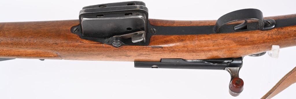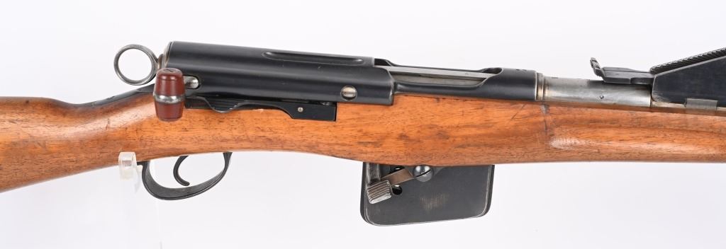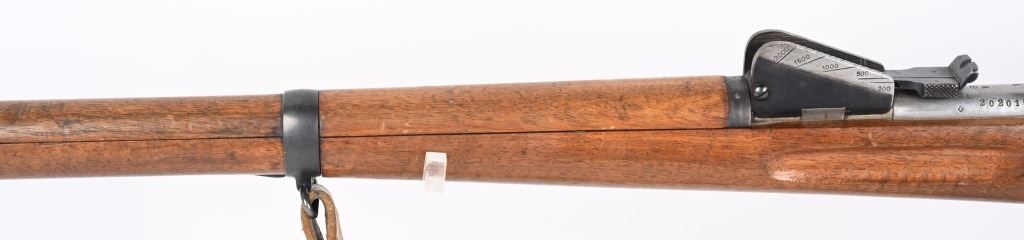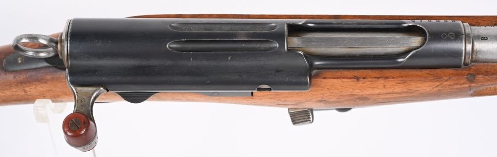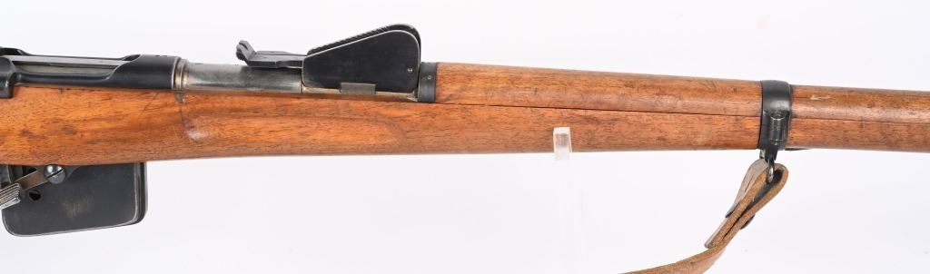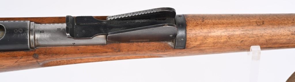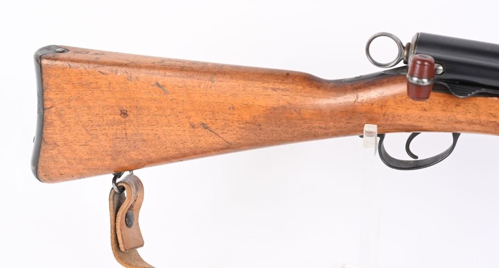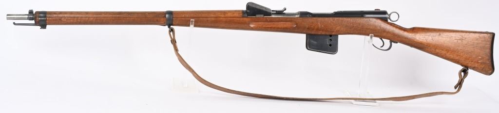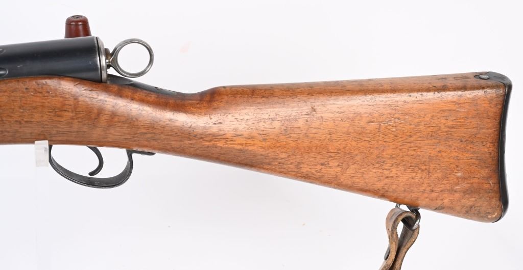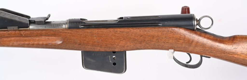 SERIAL NUMBER 202015 BARREL 30 1/2" CASLIBER 7.5 X55 MANUFACTURED 1896. Blue finished with oil finished walnut stocks and handguard. Matching serial numbers and complete with military leather sling. The first series of the Swiss straight pull rifles with the later abandoned magazine disconnect / selector remaining intact. CONDITION. Good with excellent bright bore and properly operating action. Stocks are very fine with a few period impressions. Matching numbers. Slight blue finish loss from period of use and cleaning. Sling is very good and supple. ANTIQUE