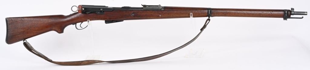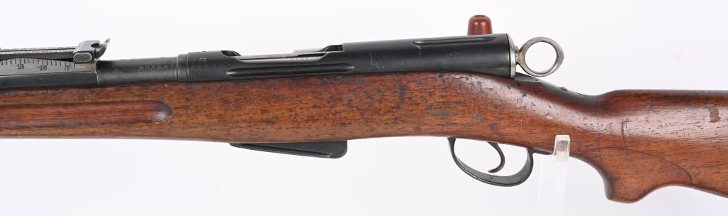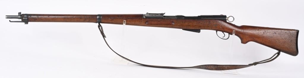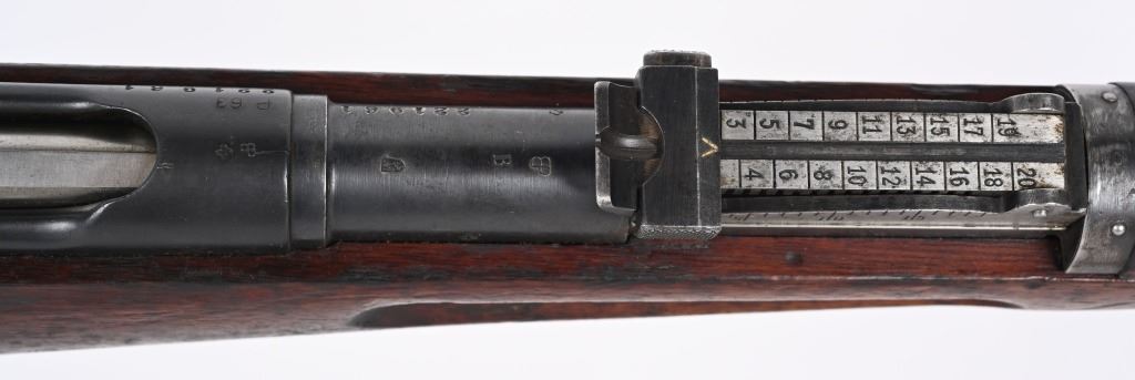 SERIAL NUMBER 221961 BARREL 30 1/2" CALIBER 7.5X55 MANUFACTURED 1898. Blue finished with oil finished walnut stock . The improved version of the 1889 with updated stock and magazine design. "P" marked for private purchase on receiver with all matching serial numbers. CONDITION, Very good with excellent bright bore and properly operating action. Stocks are very good with a few period of use impressions and some finish loss from age. Leather sling is good and remains supple. C&R