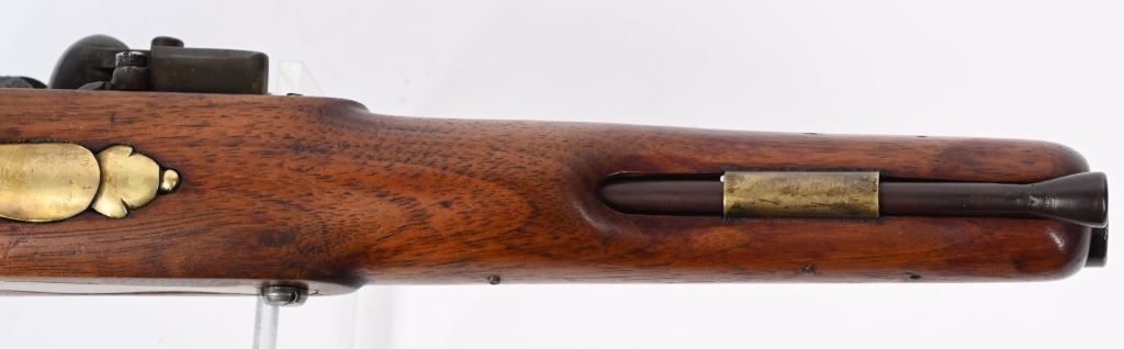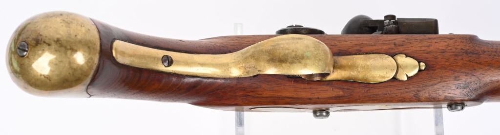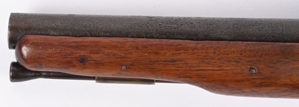 Lock is marked TOWER with with Royal cipher and GR. Barrel is 9 inches and 58 caliber smooth bore. One piece stock with brass butt cap and trigger guard. Barrel is period British proved. CONDITION, Good with cleaned wood and patina finished barrel and lock. Lock operates properly and loading rod and pipe are possible replacements. A very attractive War of 1812 period pistol ANTIQUE