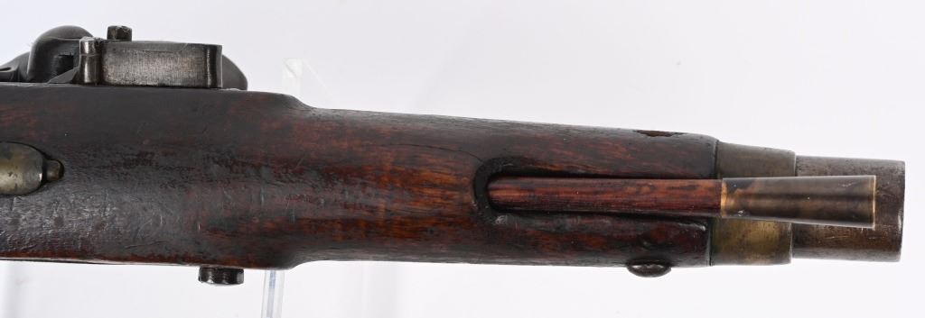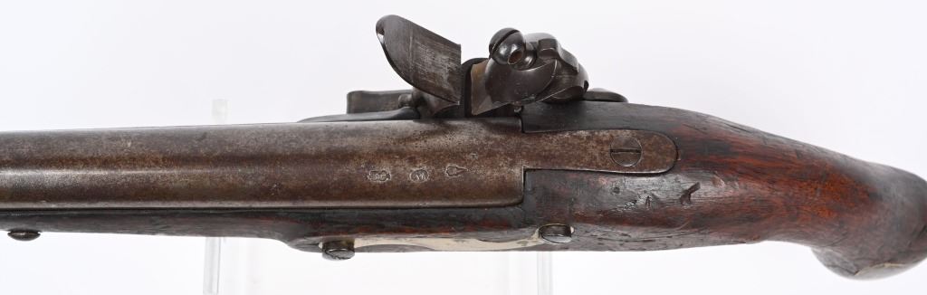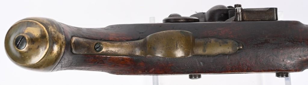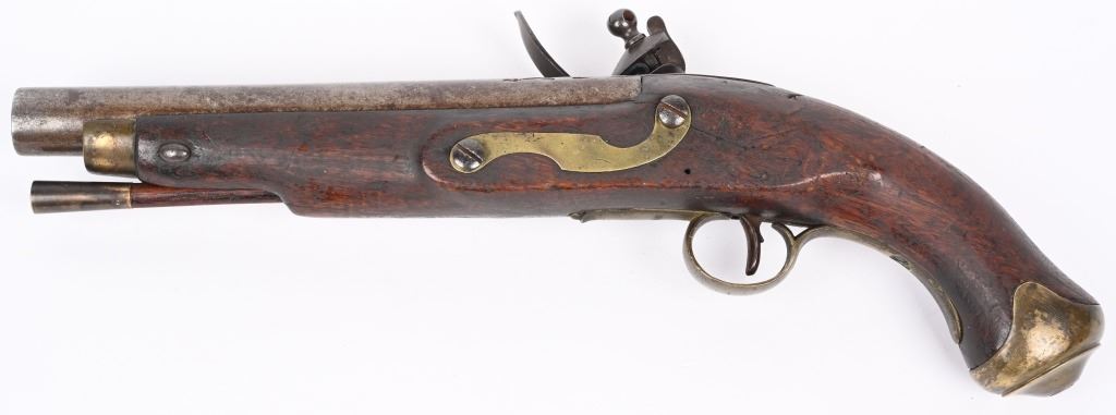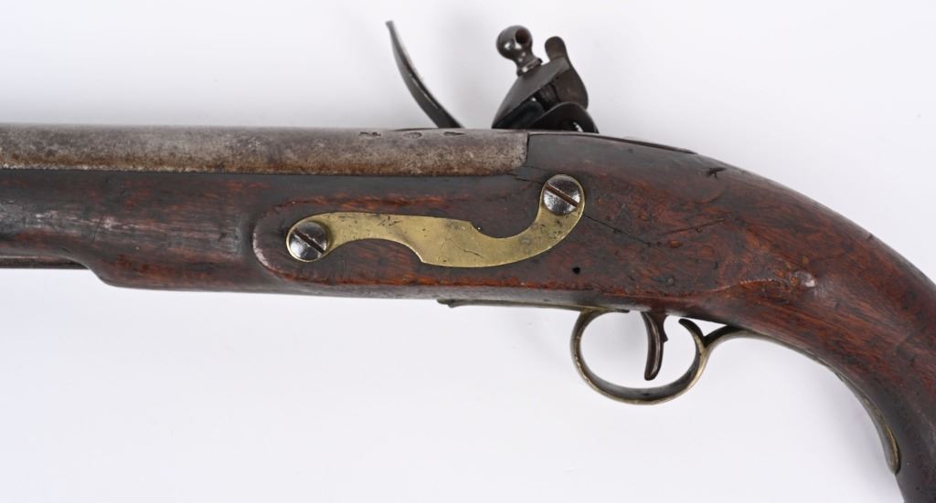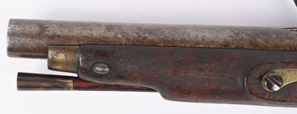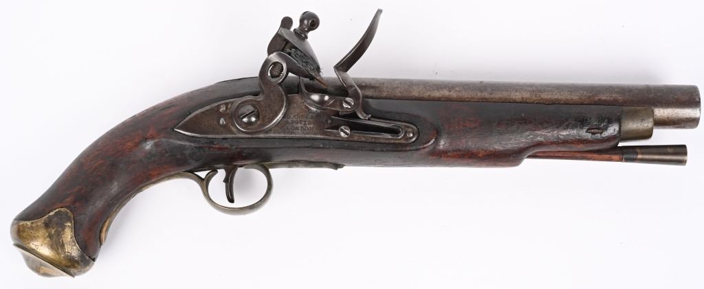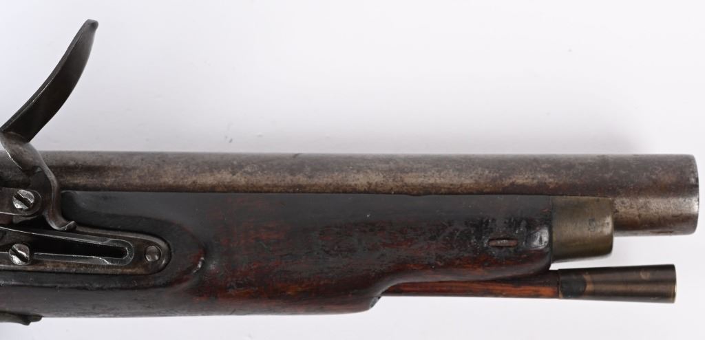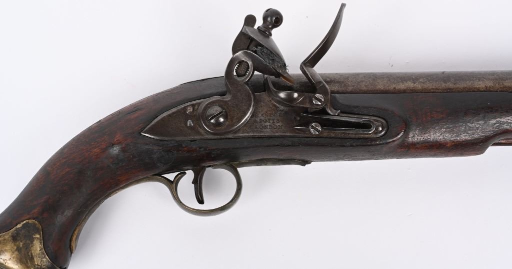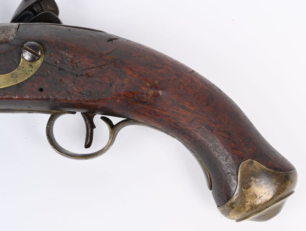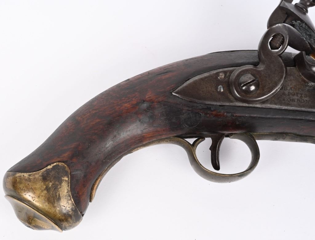 Made by BRANDON & POTTS LONDON with 9 inch smooth bore barrel, One piece walnut stock with brass butt cap, trigger guard and forend cap. Wood wiping rod with brass tip. British proved on breech with same inspection below flash pan on lock. These private purchase pistol have been identified as War of 1812 and Napoleonic war used, CONDITION, Very good with a pleasant uncleaned mellow patina. All marking are crisp and legible. Stock is very good with some minor distress bruising and impressions from the period of use. Bore is good and lock operates properly. Rod appear to be a replacement as is common. ANTIQUE