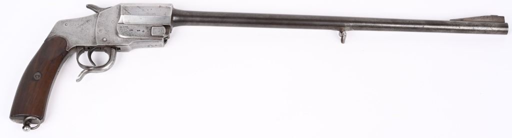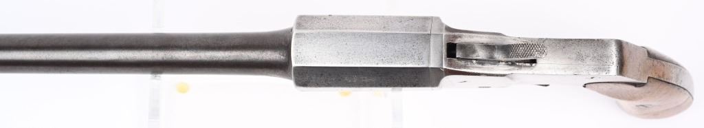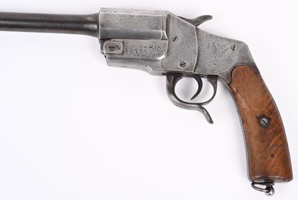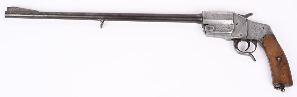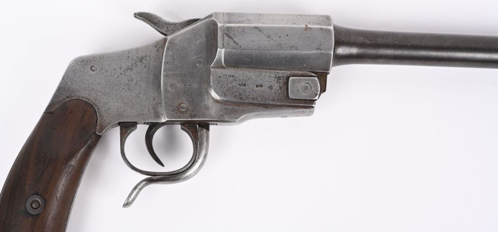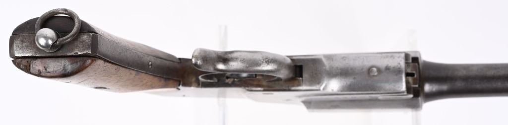 SERIAL NUMBER 40754 BARREL 19 7/8" CALIBER 28 GAUGE MANUFACTURED CIRCA 1920'S. The post WW1 German firearm industry created many unique items to increase sales and survive. This purpose made single shot 28 gauge shotgun was most likely produced as a poachers or auto burglar protection gun. Made on the same tooling as the Hebel Falre pistol but with 19 7/8" 28 gauge smooth bore. Bottom of barrel has correct German post war 28 Gauge proofs and markings. These type of smoothbore short guns became popular in the United States and were also produced by Ithaca, Iver Johnson and Harrington & Richardson. This example however is long enough to be sold as a standard shotgun and not to have any National Firearms Act limitations. CONDITION. Good with most exterior finish being worn to dove grey. 2 piece wood grips are full sized and without damage. The action operates properly. C&R