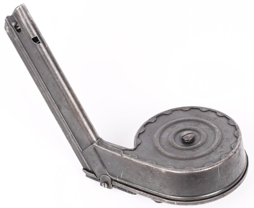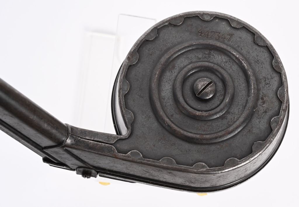 Blue finished 32 round WW1 Snail drum . Bing Nurnberg (B over N) type 2 pattern. Serial number 442347. Made primarily for the Artillery Luger but utilized on the standard P-08m as well and used extensively in WW2. CONDITION. Very good with over 70% blue finish remaining with typical edge wear. Magazine operates properly and is without distress or bruises.