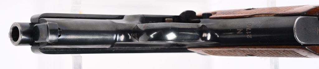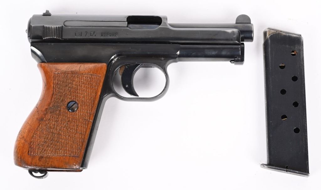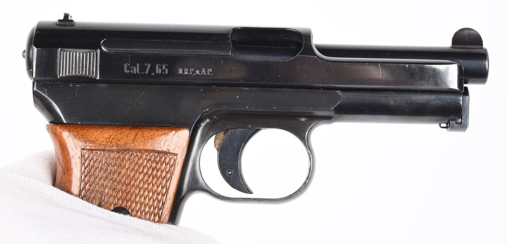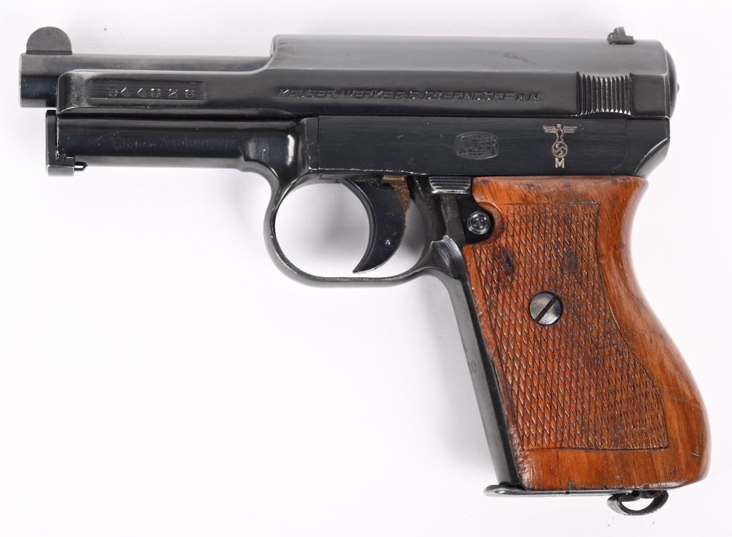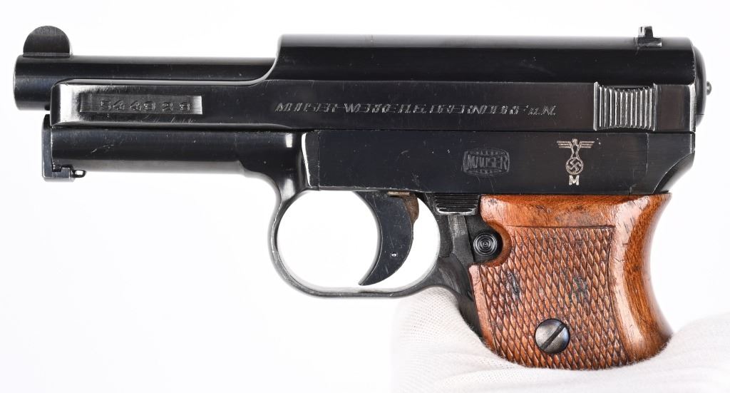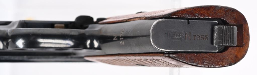 SERIAL NUMBER 544828 BARREL 3 1/2" CALIBER 7.65 / 32 ACP MANUFACTURED CIRCA 1940. From 1936 through 1940 the Third Reich procured approx, 23000 Mauser 1934 pistols for Kriegsmarine issue. This example is within 7 numbers of another identified example listed in Jan Stills book "AXIS PISTOLS" on page 171. Blue finish with varnished checkered one piece walnut grips. Left side of frame is marked with the Kriegsmarine marking and the front grip strap marked "N2170" Crown "U" proofs on slide and barrel. Matching serial numbers. Pistol is equipted with proper military pattern magazine with "N7956". CONDITION, Very fine with over 98% factory blue finish. excellent bright bore and proper operating action. Grips have some period of use impressions and dents. This is one of the finest authentic Kriegsmarine Model 1934 pistols to have been offered. C&R