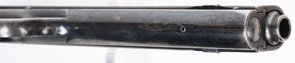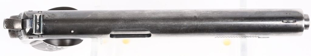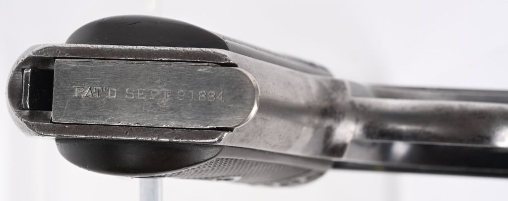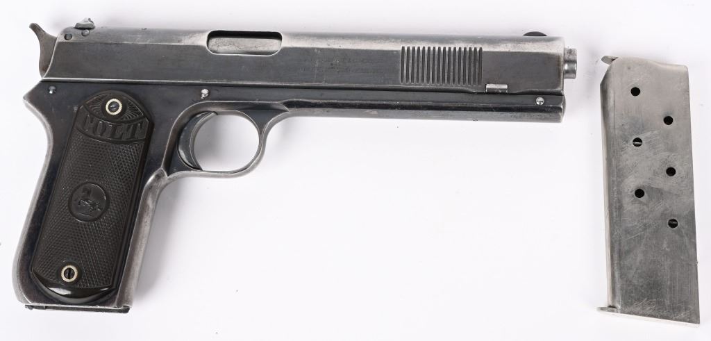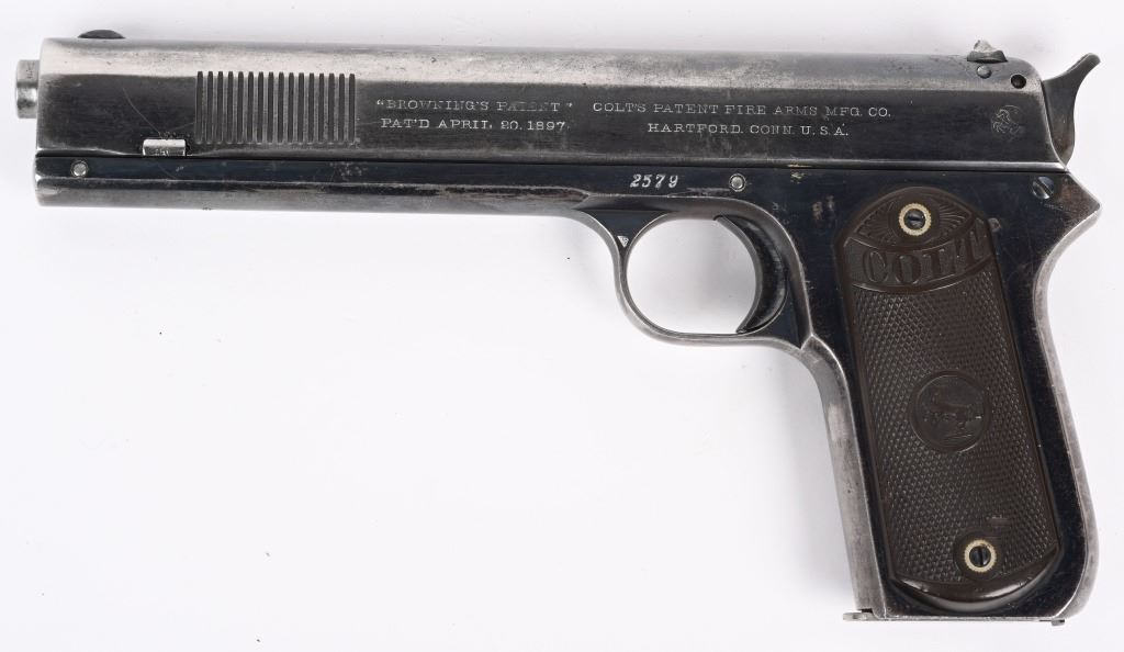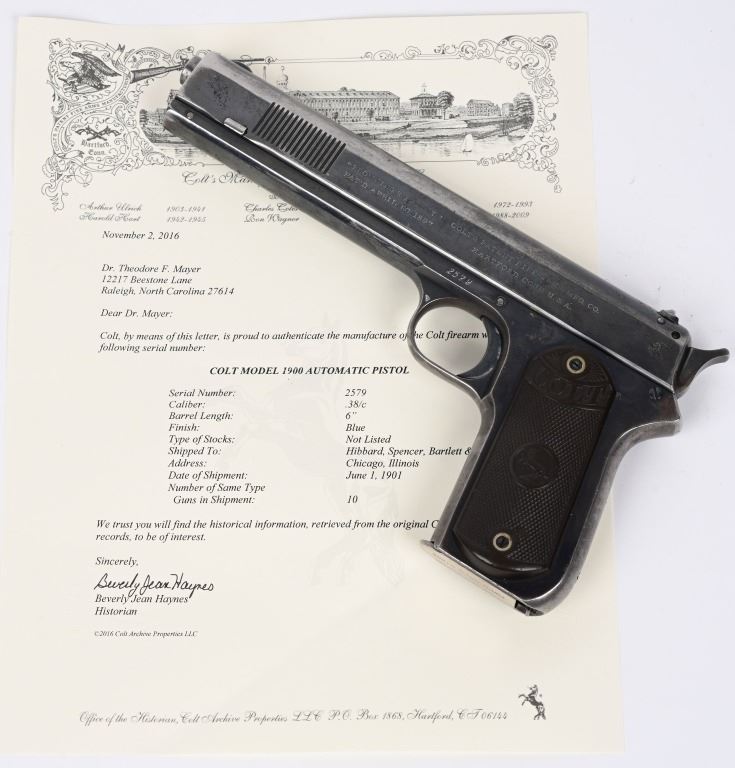 SERIAL NUMBER 2579 BARREL 6" CALIBER 38 AUTO MANUFACTURED 1901. The first successful American semi-automatic pistol and developed by John Moses Browning. Colt Model 1900 with blue finish and checkered gutta percha grips with Rampant Colt monograms. Factory letter indicates pistol was shipped June 1 1901 to Hibbard, Spencer, Bartlett & Company Chicago Illinois. Blue finish with forward slide serration's with correct nickel finished magazine. Fixed rear sight , spur trigger . Matching numbers on slide and frame. Factory produced without sight safety. CONDITION, Very fine with over 80% blue finish remaining with 60% case color on hammer. Bore is very fine with sharp rifling. Grips are very fine with minimal wear and no cracks. Comes with factory letter. C&R