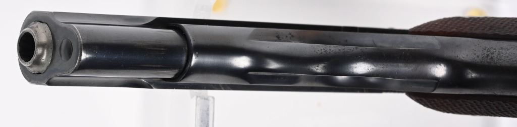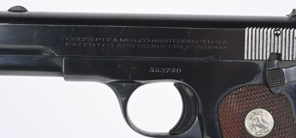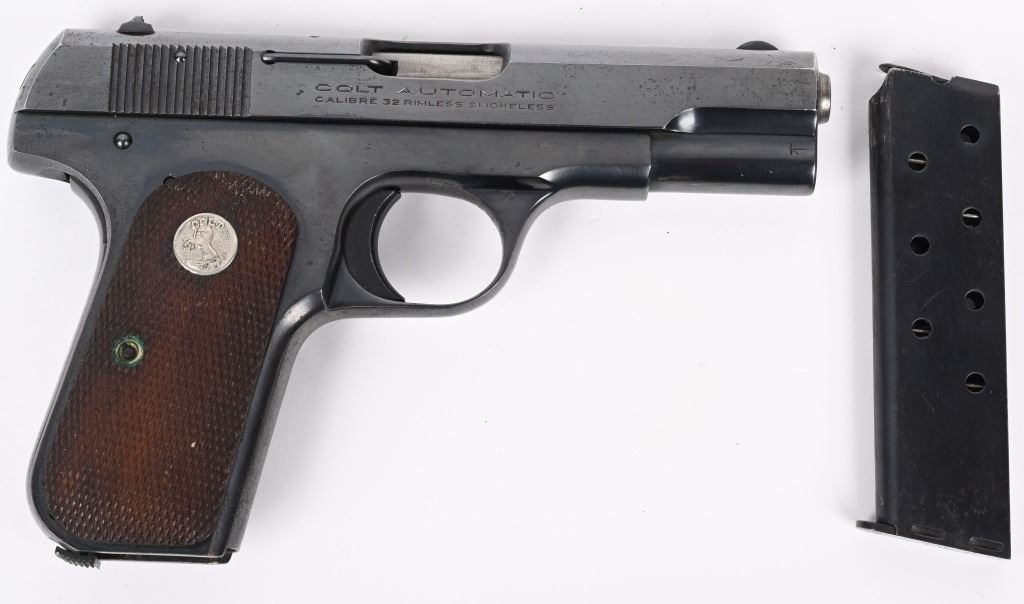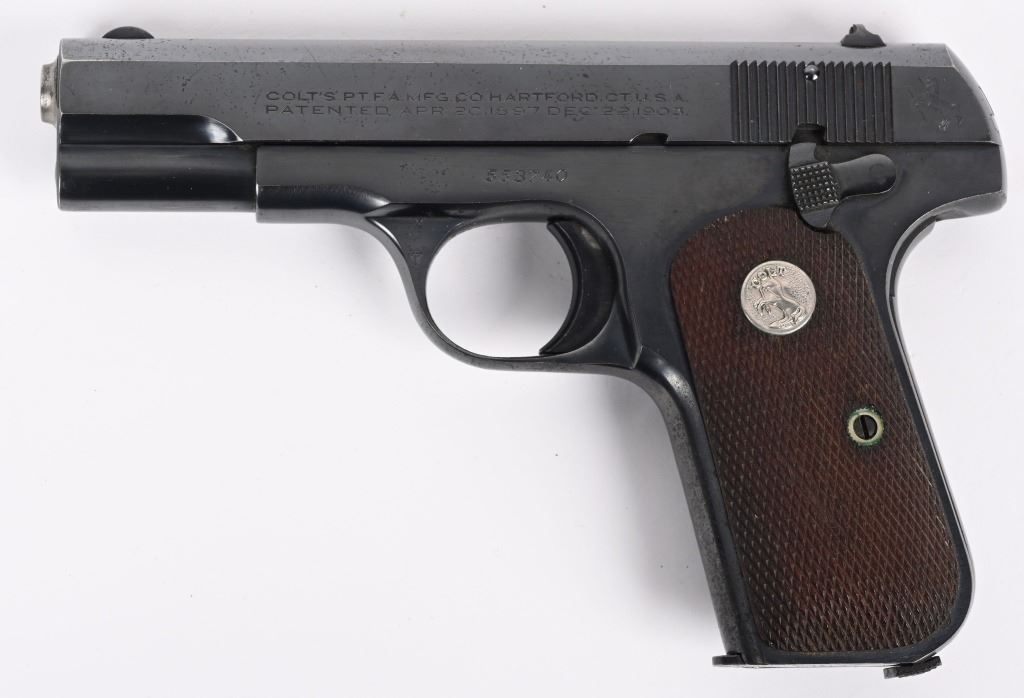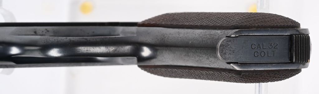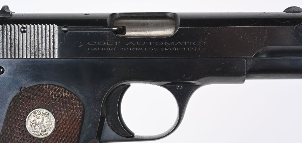 SERIAL NUMBER 553740 BARREL 3 3/4" CALIBER 7.65/ .32 ACP MANUFACTURED 1941. Blue finish with checkered walnut grips with Rampant Colt medallions. Matching numbers on slide and frame. Identical model to the General Officers Model pistol of early WW2 . CONDITION, Very fine with over 95% blue finish remaining. Excellent bore and proper operating action. Grips are very fine with sharp checkering. C&R