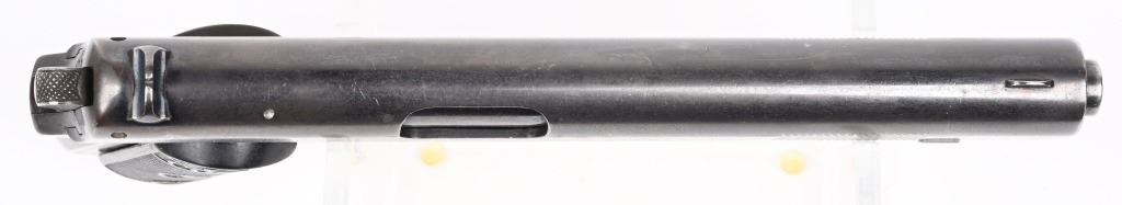SERIAL NUMBER 8940 BARREL 6" CALIBER .38 COLT AUTO MANUFACTURED 1906. Blue finished with checkered rubber grips with Rampant Colt monograms. Scarce variation with forward slide serration not often found on the 1902 Sporting model. Round case colored hammer with smooth trigger CONDITION. Good with fine checkered hard rubber grips, Excellent bore. Pistol retains over 30% blue finish with balance having turned a natural plum finish with age. Action operates properly. C&R