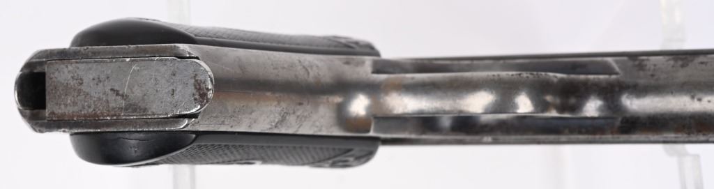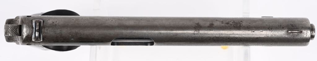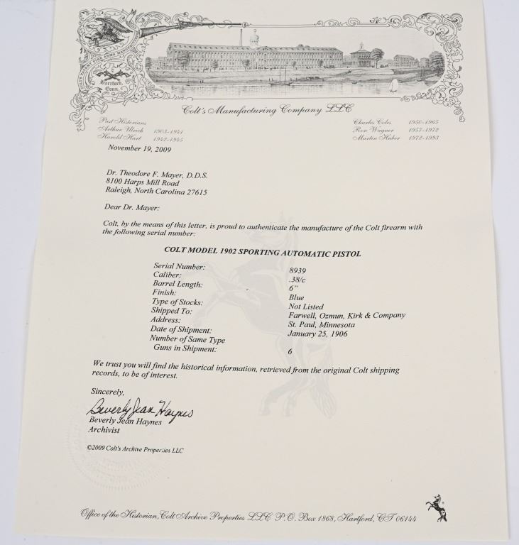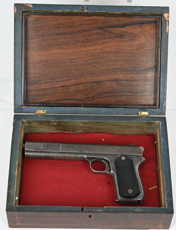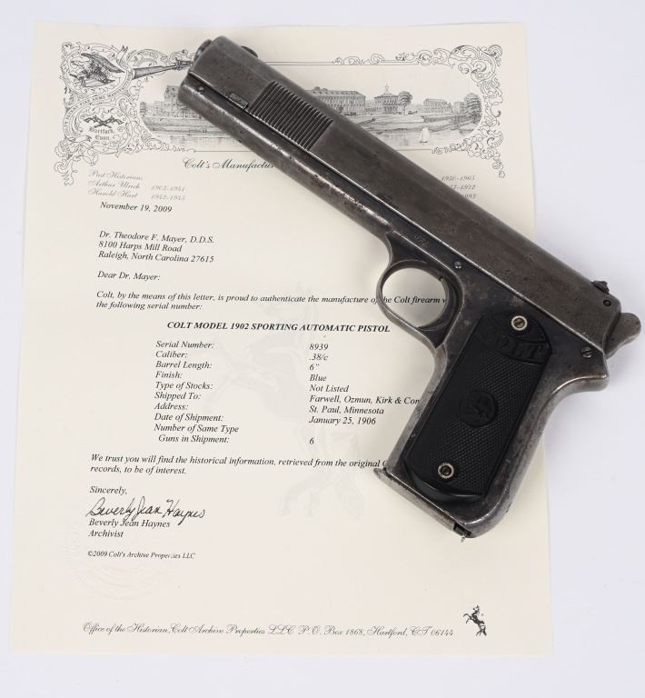 SERIAL NUMBER 8939 BARREL 6" CALIBER .38 COLT AUTO MANUFACTURED 1906. Factory letter indicates pistol was shipped January 25 1906 with blue finish , caliber .38 Colt auto with grips not listed to Farwell, Ozmun, Kirk & Company St, Paul Minnesota. Pistol has round hammer and checkered hard rubber grips with Rampant Colt monograms. Forward slide serration's and is houses in a secretary type display case and is accompanied by a Farwell Hardware paint and varnish can opener. CONDITION, Good with 15% blue finish remaining on frame and traces of blue finish remaining on slide. Grips are very good and are contemporary replacements. Action operates properly. Bore is good with slight oxidation in grooves. Display box is good with moderate wear. Comes with factory letter. C&R