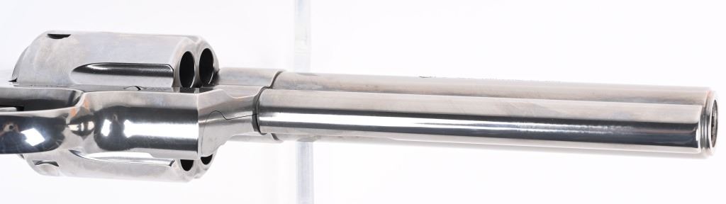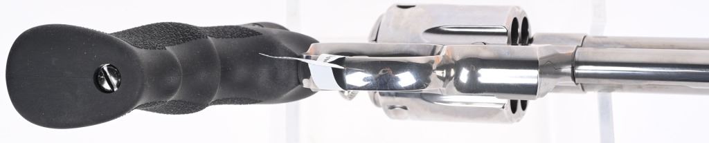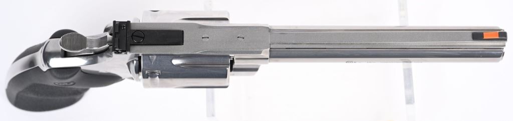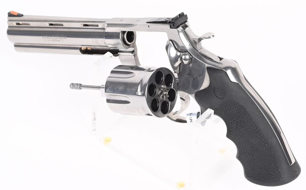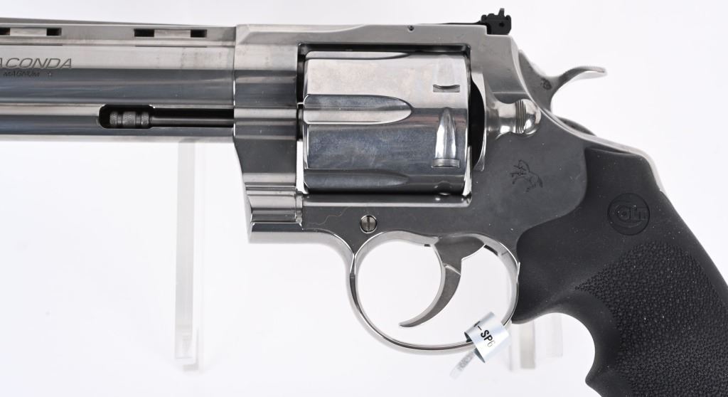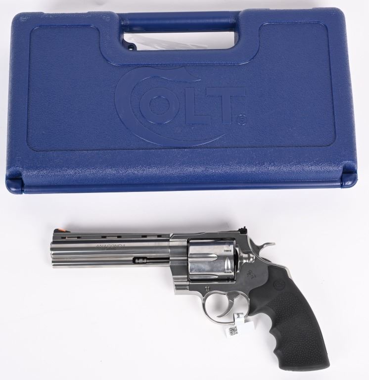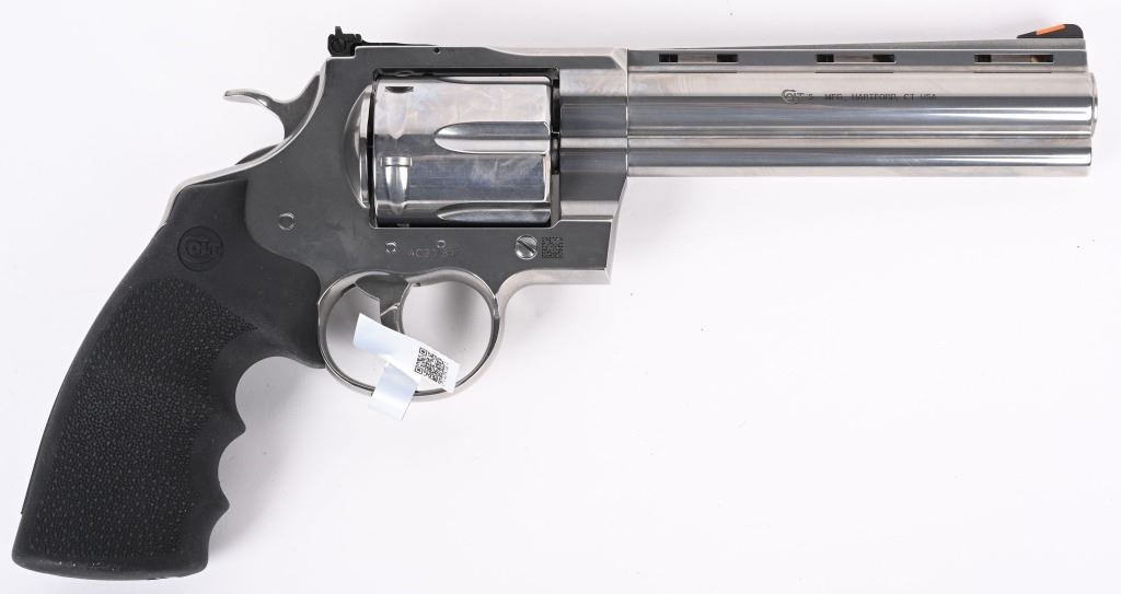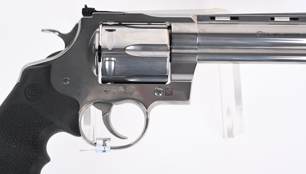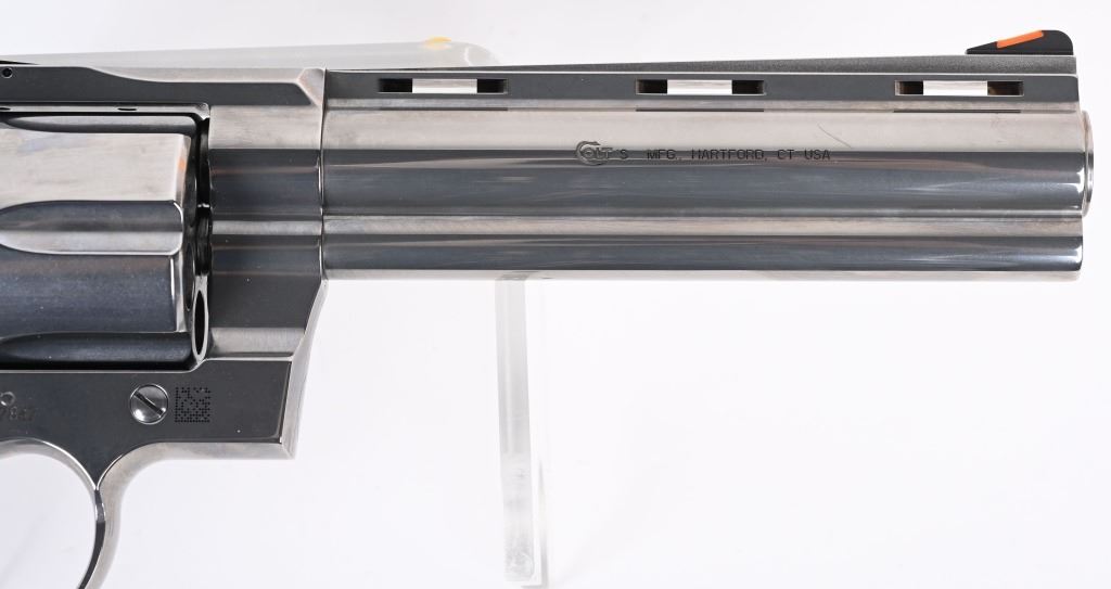 SERIAL NUMBER: AC207847. BARREL: 6". CALIBER: .44 MAGNUM. MANUFACTURED: 2020'S. Colts revamp of the classic snake gun series. Six shot fluted cylinder. Vent rib barrel with blade front sight and adjustable u-notch rear. Polished stainless steel finish and checkered target rubber grips. Includes factory serial matching hard case, manual and lock. CONDITION: Metal and grips are excellent overall, with little signs of use. Bore is shiny and crisp. Has been shot, but very little, with very light burn marks on the cylinder. Fine mechanics. No drag line on the cylinder. Case is excellent. MODERN