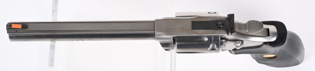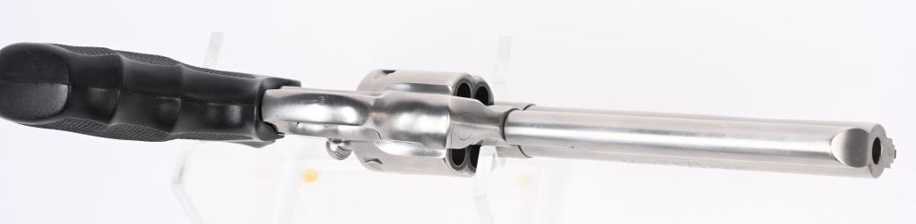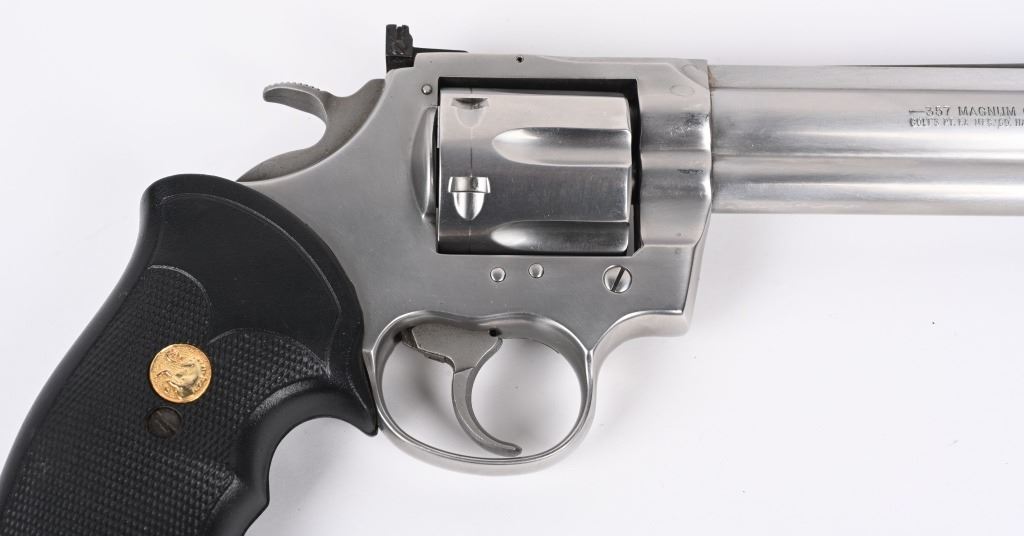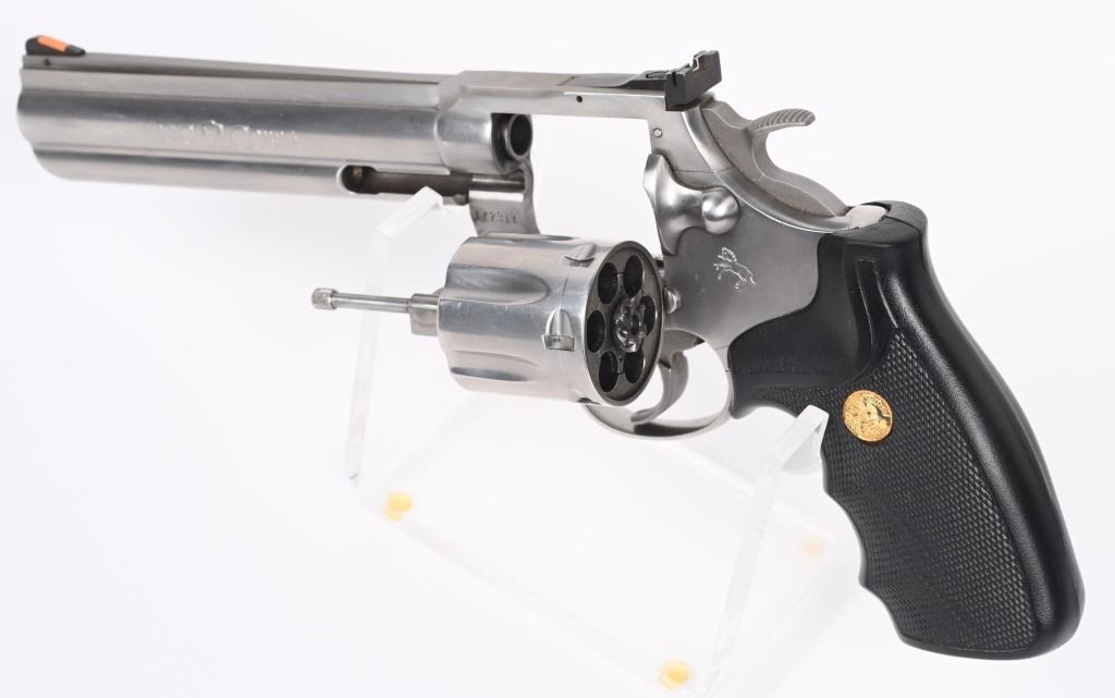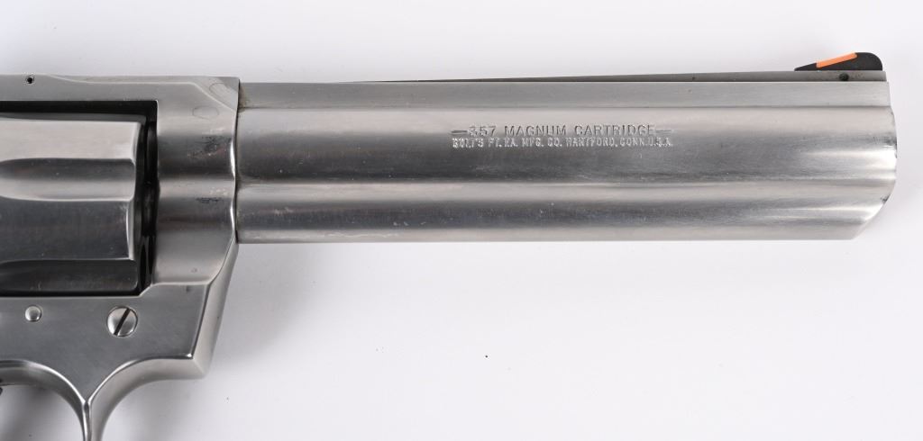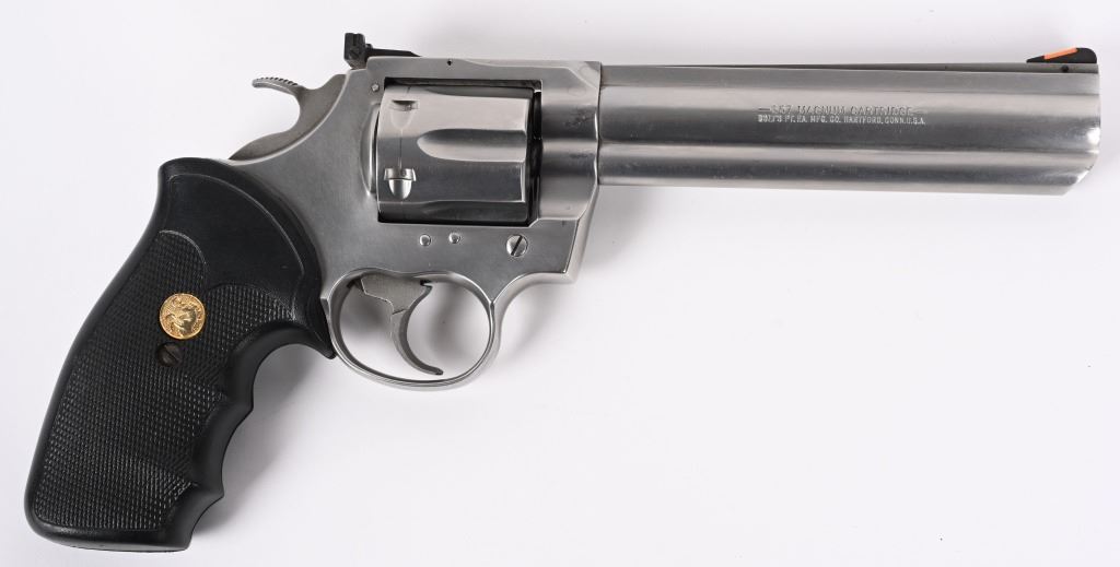 SERIAL NUMBER: KK2311. BARREL: 6". CALIBER: .357 MAG. MANUFACTURED: 1991. Standard markings throughout. Six shot fluted cylinder. Solid rib barrel with ramped blade front sight and adjustable u-notch rear. Brushed stainless steel finish and factory checkered rubber grips. Includes factory blue plastic hard case with manual inside. CONDITION: Metal is near excellent, with minor handling marks and scratches. Grips are excellent. Bore is shiny with crisp rifling. Sharp mechanics. Case has light exterior wear and discoloration. MODERN