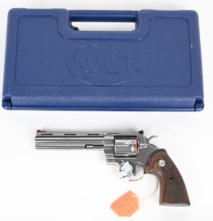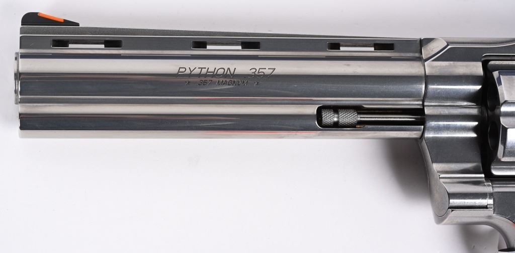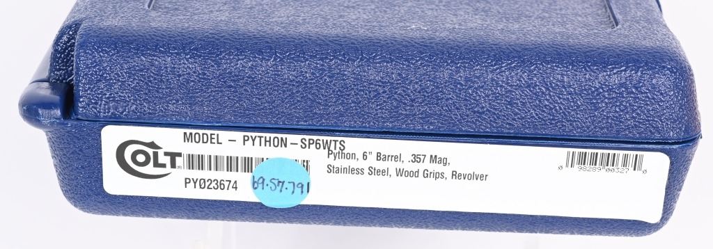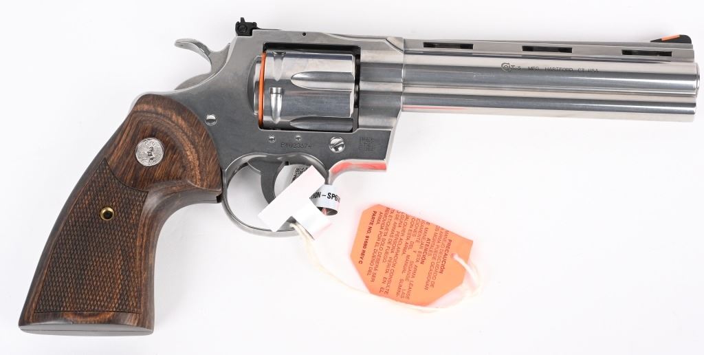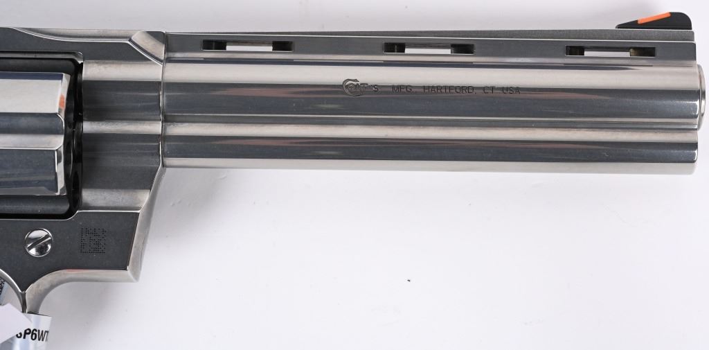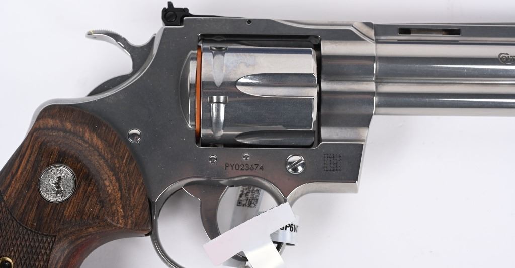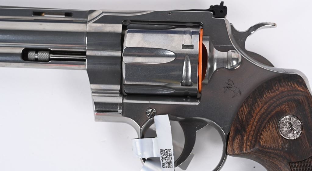 SERIAL NUMBER: PY023674. BARREL: 6". CALIBER: .357 MAGNUM. MANUFACTURED: 2020'S. Colts revamp of the classic snake gun series. Vent rib barrel with blade front sight and adjustable u-notch rear. Polished stainless steel finish and checkered target wood grips with silver medallions. Includes factory serial matching hard case, manual and lock. CONDITION: Excellent overall, with a few handling marks and scratches. Bore is shiny with crisp rifling. Fired, but very little, with factory hang tags still attached. Sharp mechanics. Very light drag line. Case is excellent. MODERN