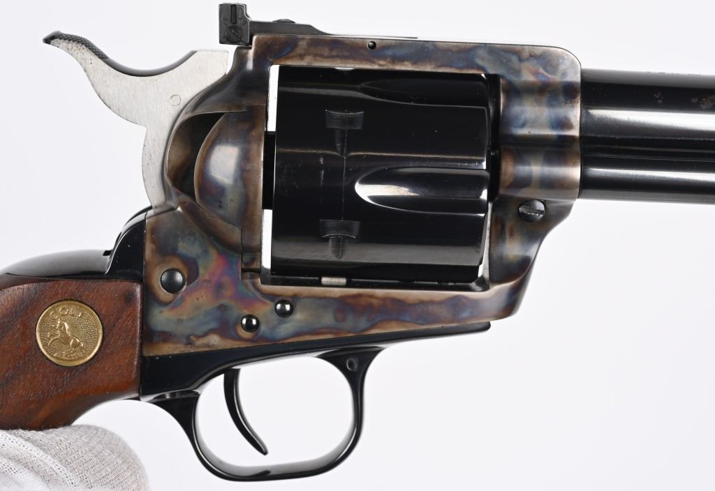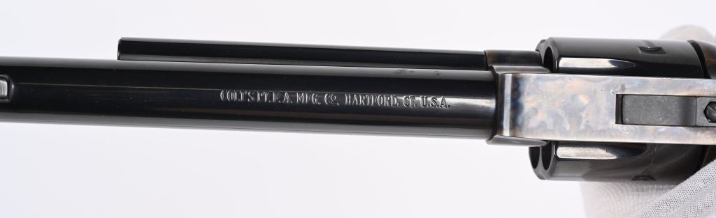 SERIAL NUMBER: 04864NF. BARREL: 7-1/2". CALIBER: .45 COLT. MANUFACTURED: 1964. Single line address on the barrel. Patent dates on the left side of the frame. Six shot fluted cylinder. Ramped blade front sight and adjustable u-notch rear. Original blue/case colored finishes. Oiled wood grips with gold Colt medallions. No Box. CONDITION: Metal is very good overall. There are two small splotches of surface rust on either side of the barrel. Grips are excellent. Bore is shiny with crisp rifling. Sharp mechanics. MODERN